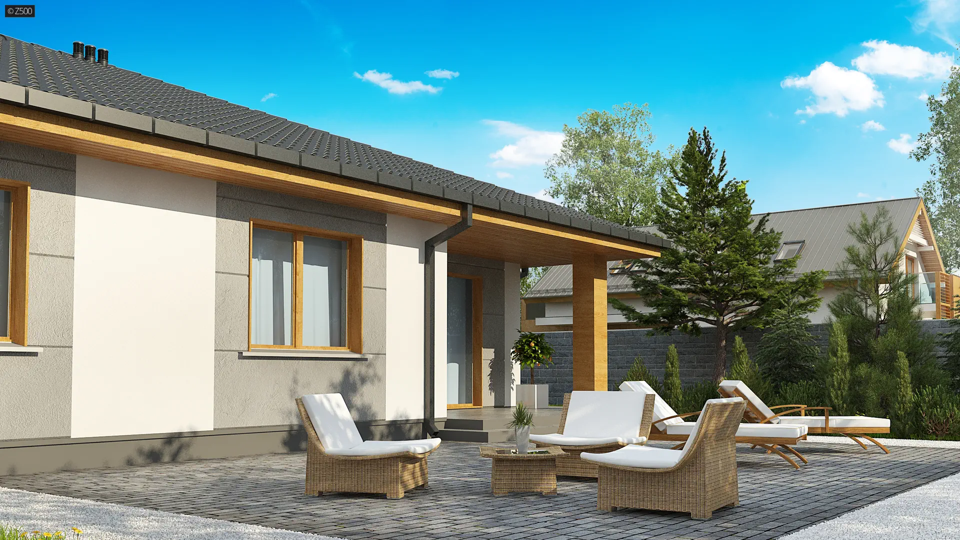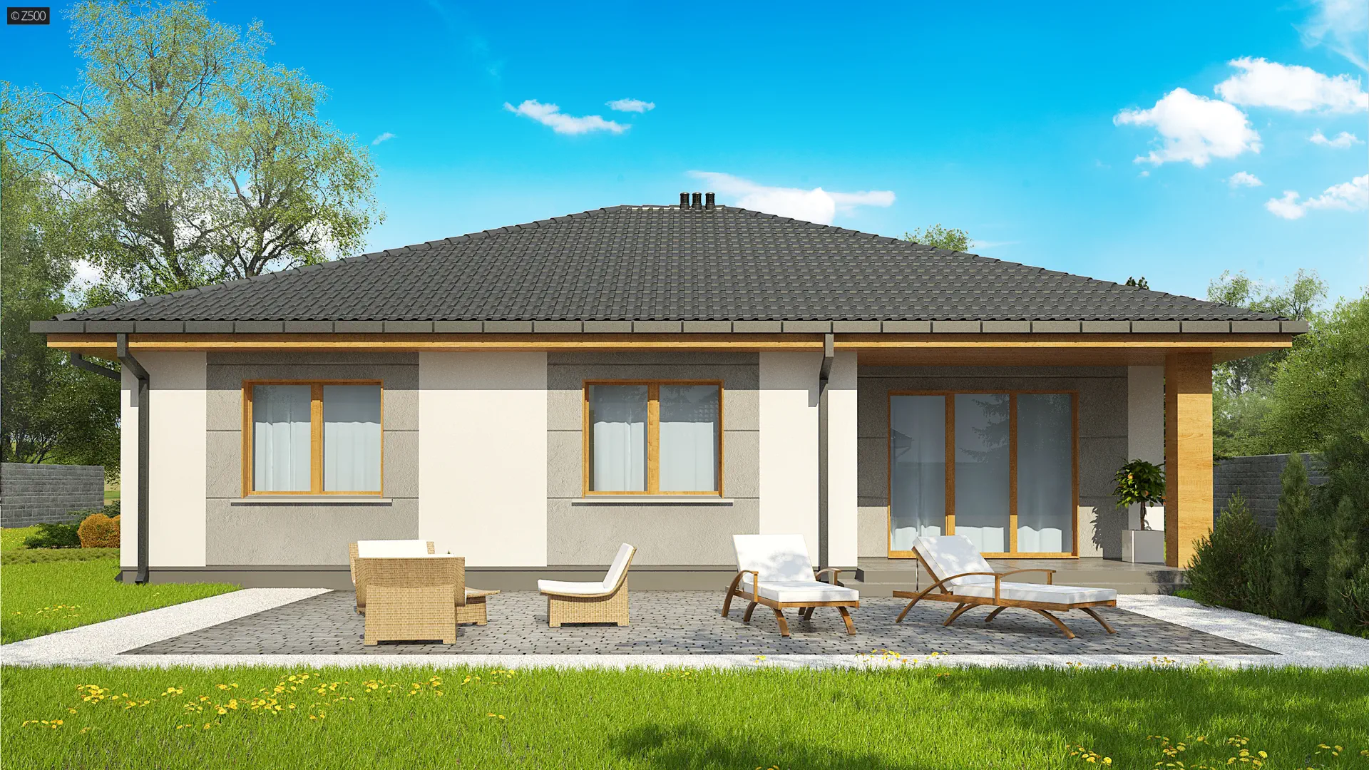 Parterowy dom z dachem kopertowym, czterema pokojami i zadaszonym tarasem