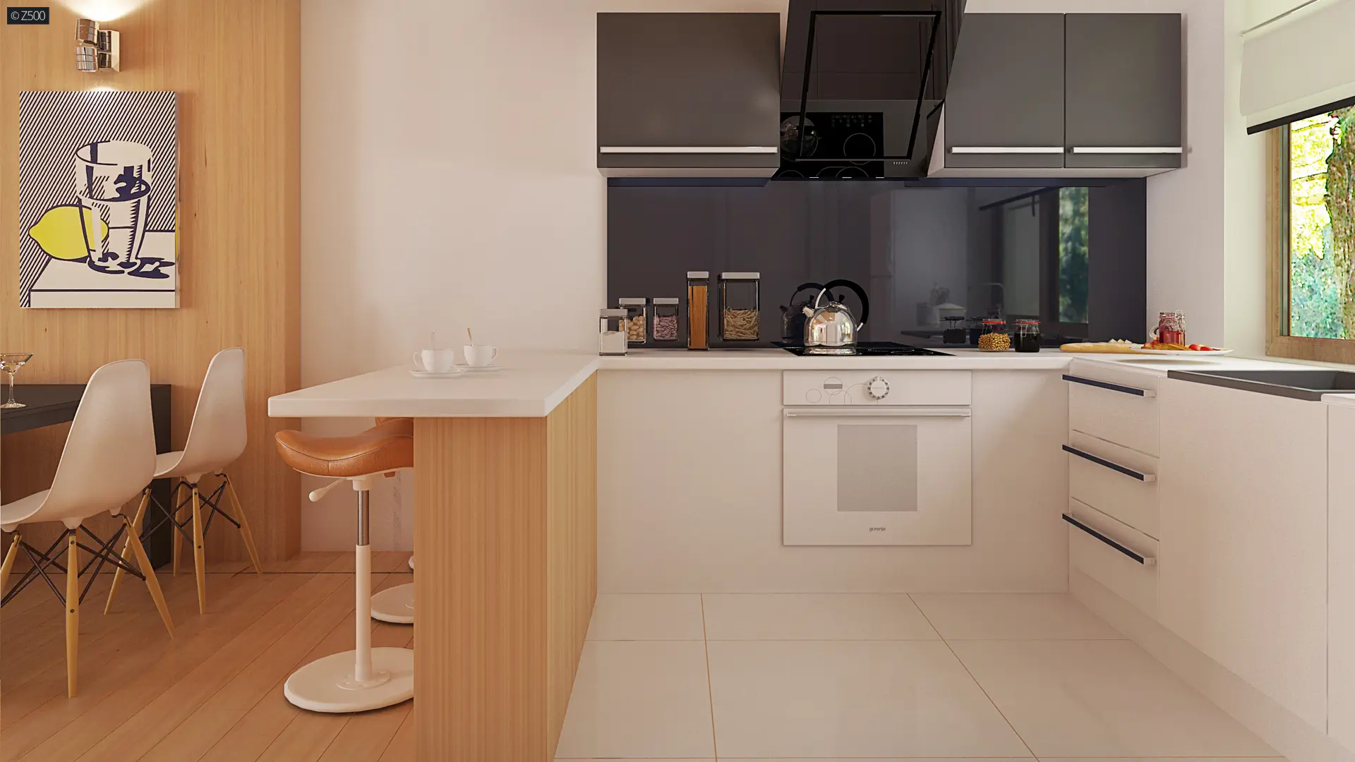 Z centralnie położonego holu prowadzą przejścia do wszystkich stref domu. W części dziennej, zlokalizowanej w bocznym skrzydle, znajduje się przestronny i jasny salon z dużymi przeszkleniami i wyjściem na ogród. W tym miejscu przewidziano także możliwość wykonania schodów prowadzących na poddasze, które w przyszłości może pełnić funkcję dodatkowej przestrzeni mieszkalnej. Kuchnia otwarta na salon tworzy spójną i wygodną przestrzeń do życia, a znajdujące się tuż obok pomieszczenie gospodarcze może służyć jako spiżarnia, schowek lub miejsce na techniczne instalacje – co ułatwia zastosowanie nowoczesnych i energooszczędnych rozwiązań grzewczych.