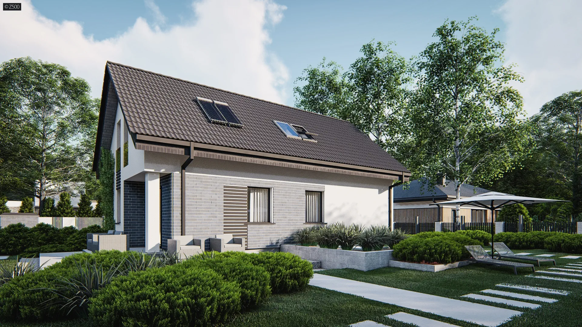 Projekt w wersji z garażem po lewej stronie. Nad garażem znajduje się pomieszczenie, które można zagospodarować jako strych lub pokój.
