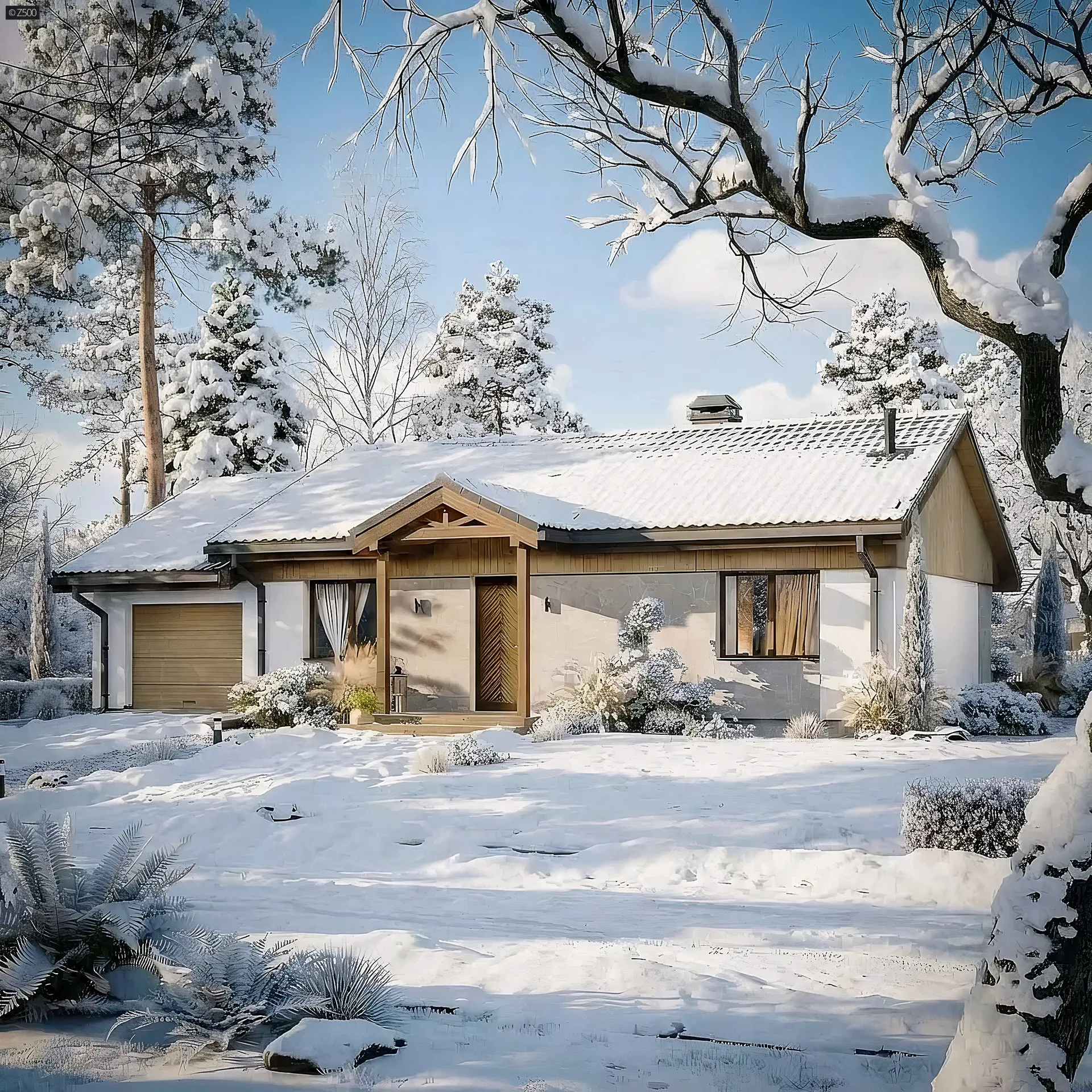 Prosty w budowie dom parterowy z garażem, dachem dwuspadowym i zwartą bryłą