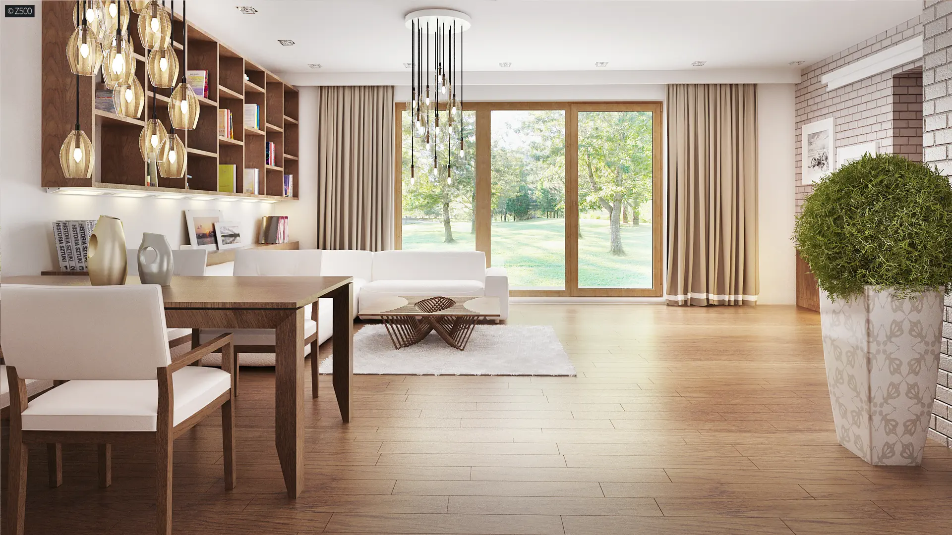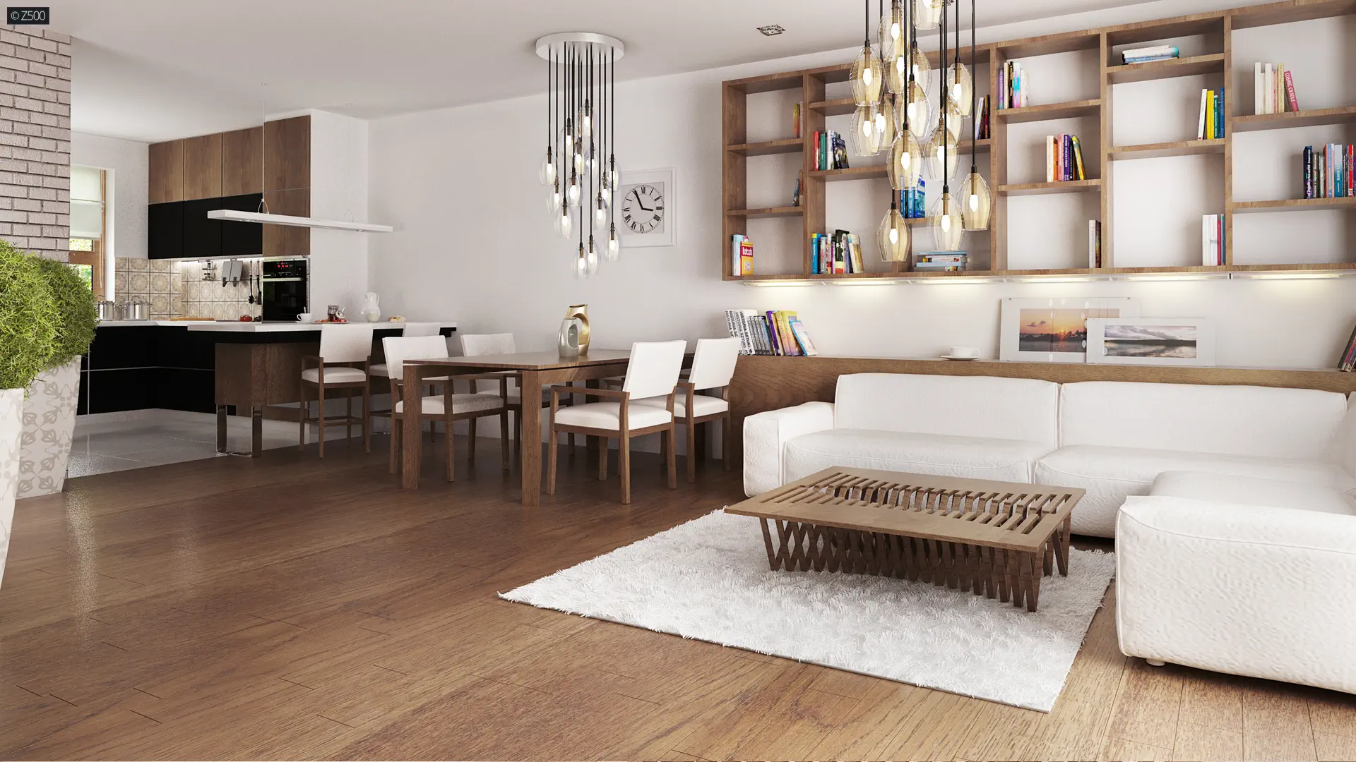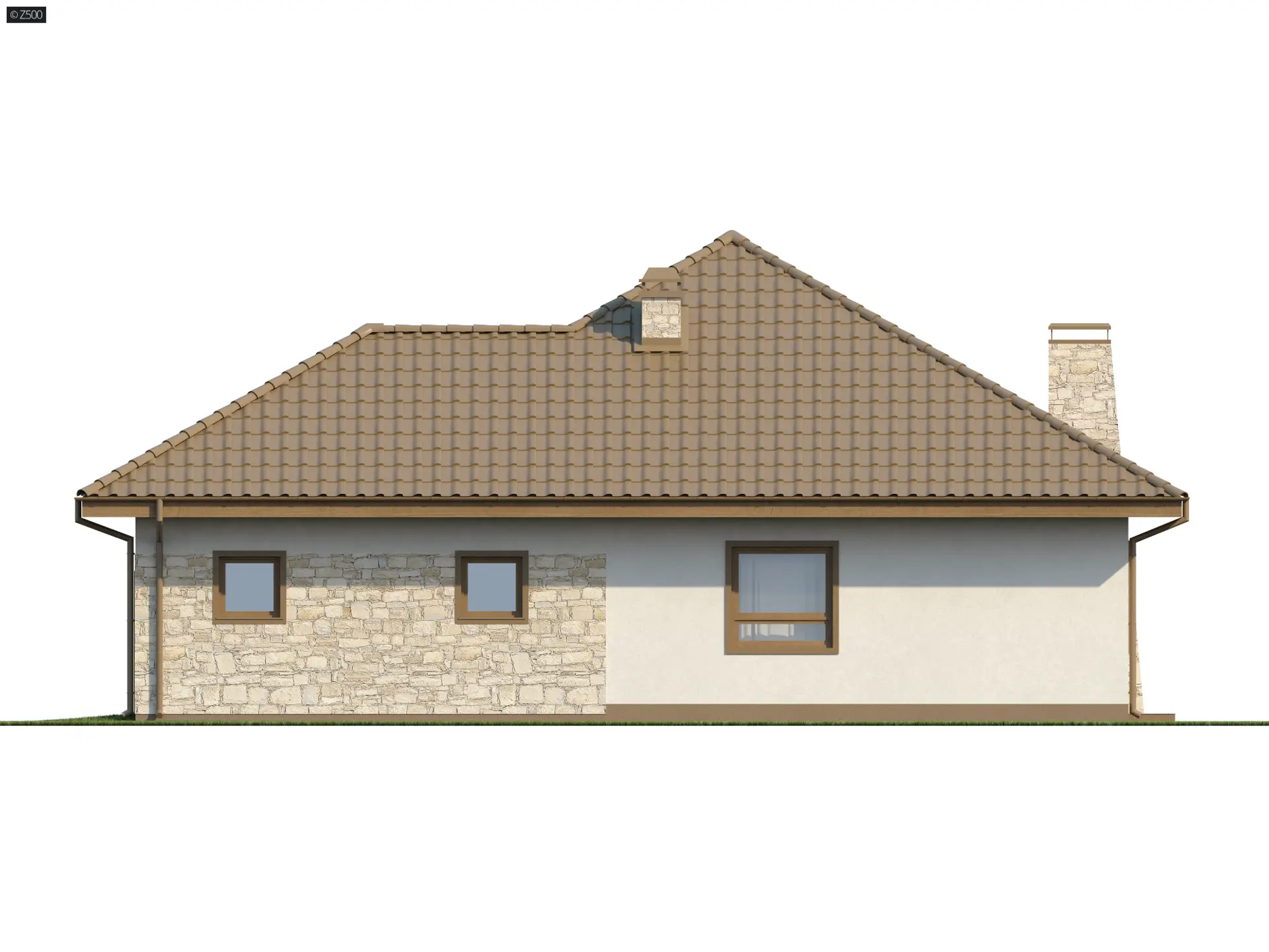 Parterowy dom z dwoma pokojami, dachem wielospadowym oraz garażem od frontu