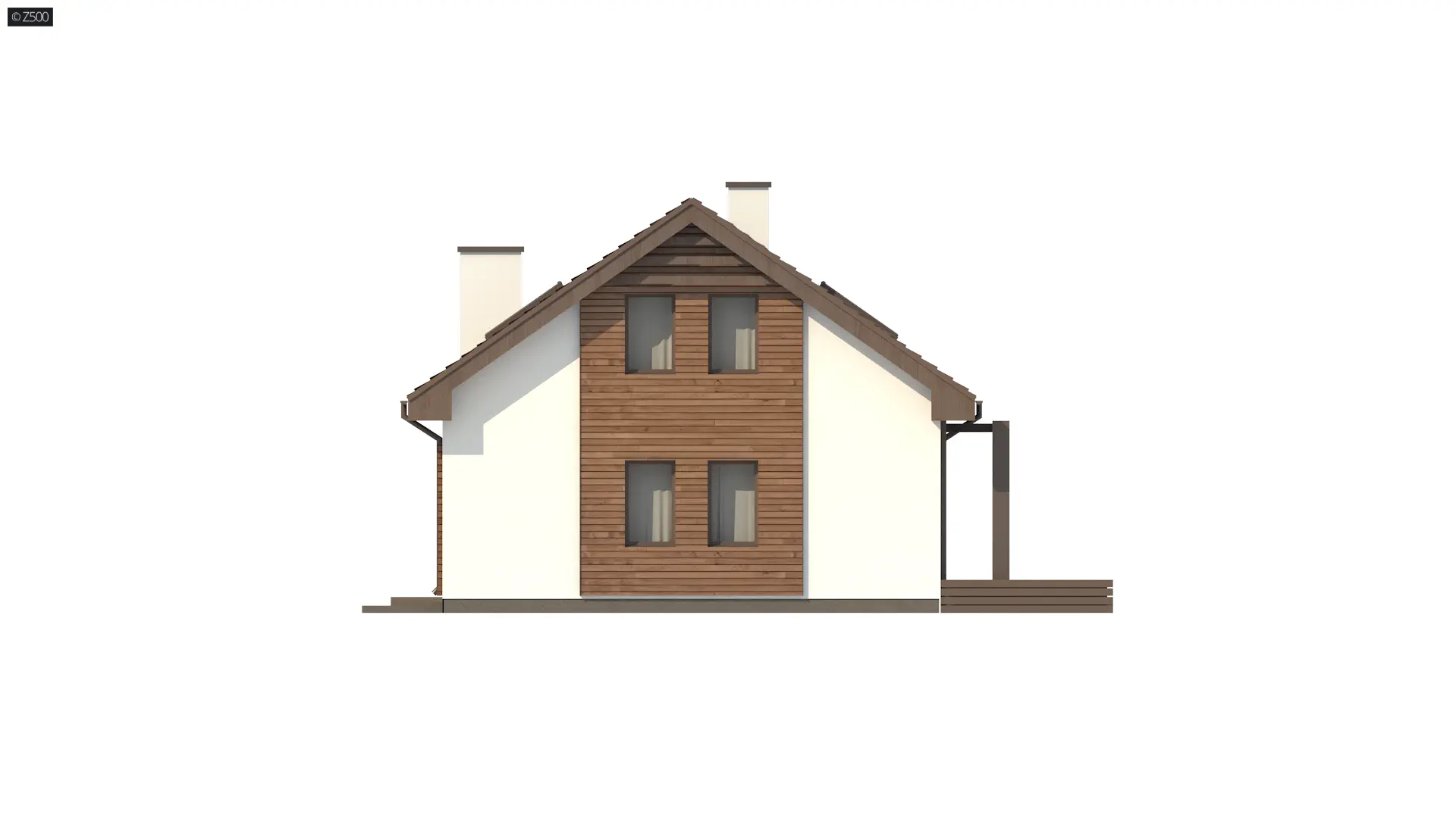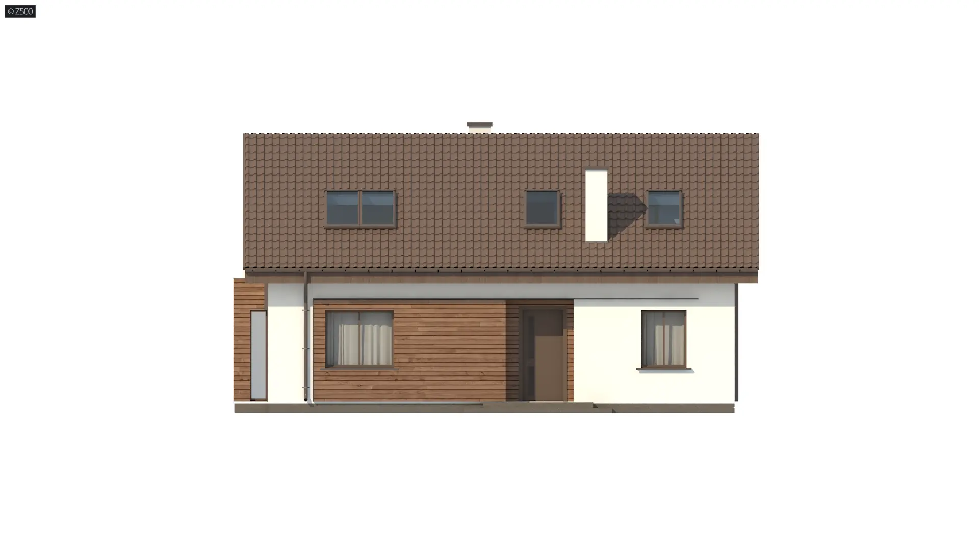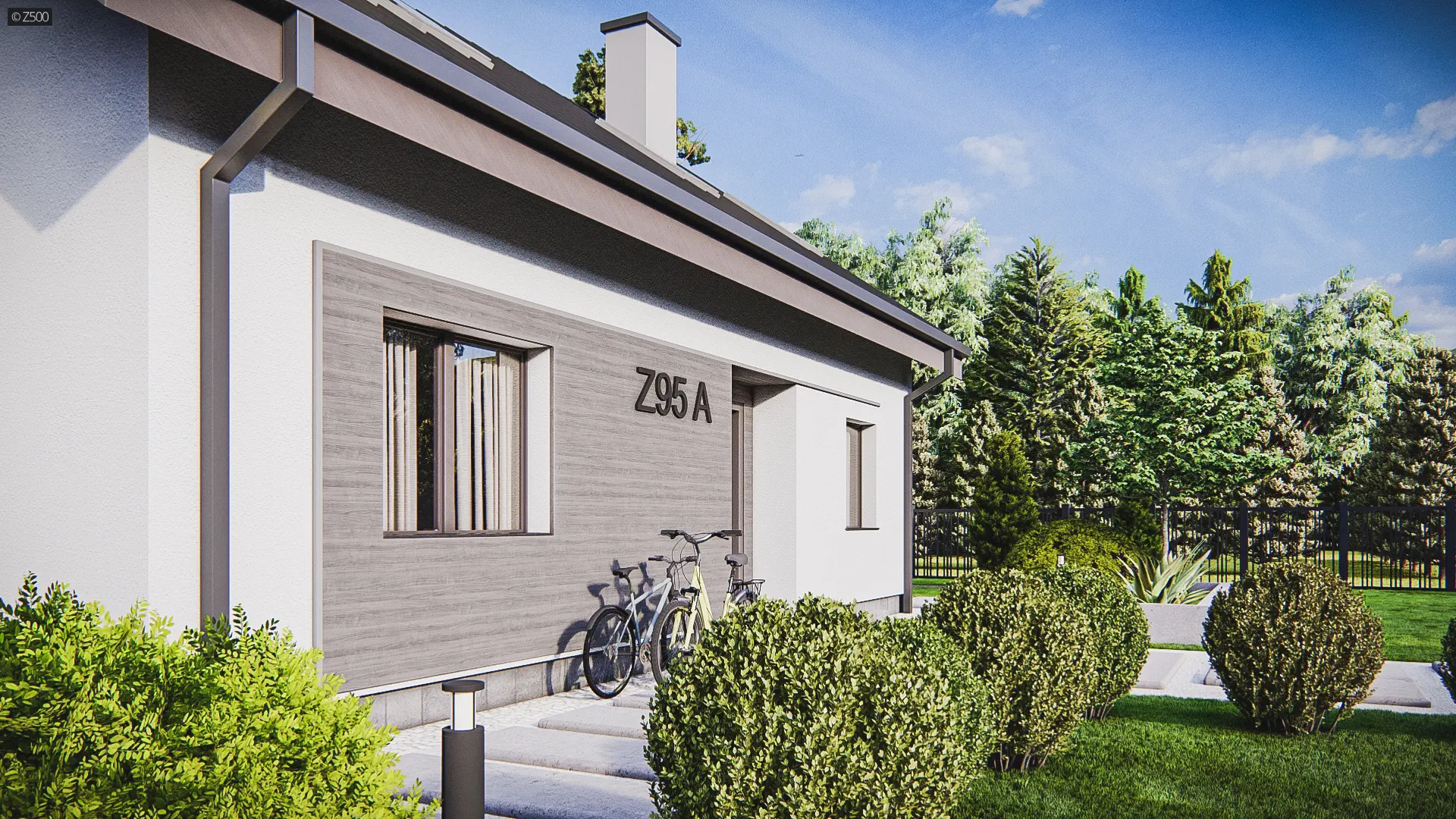 Z95 A to projekt domu o powierzchni użytkowej niecałych 120 m2. Prosty dach dwuspadowy bez dodatkowego zadaszenia nad wejściem jak w wersji podstawowej, jest niedrogi w budowie. Wejście zostało delikatnie cofnięte i osłonięte aby deszcz nie przeszkadzał nam w poszukiwaniu kluczy.