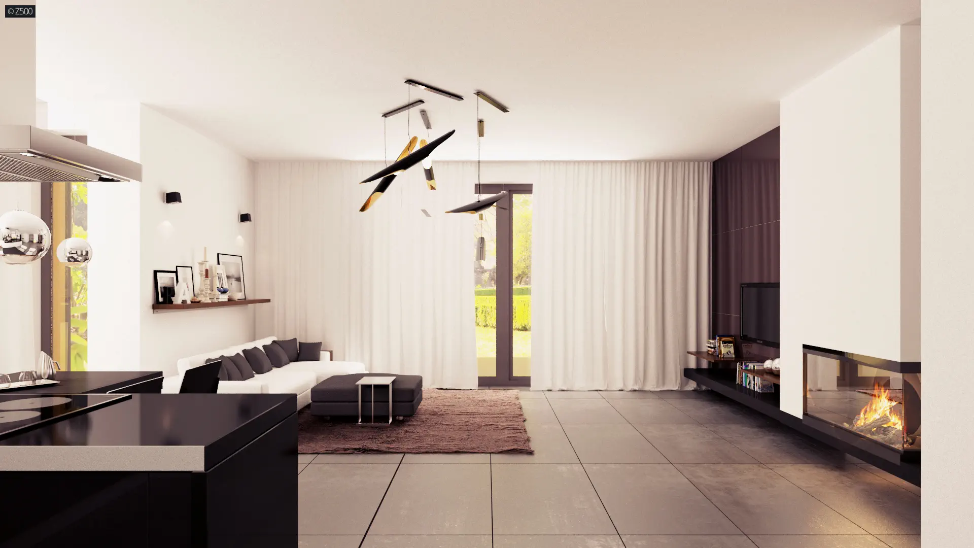 Lewa część domu to strefa dzienna - z przestronną kuchnią i bogato doposażoną spiżarnią. Wydzielona część jadalna w wykuszu celowo została umiejscowiona oddzielnie aby podkreślić odrębność jadalni. Kominek umieszczony centralnie, więc będzie cieszył nasze oczy z każdego miejsca w salonie. Duże przeszklenia z wyjściem na taras podkreślają okazałość pomieszczenia.
