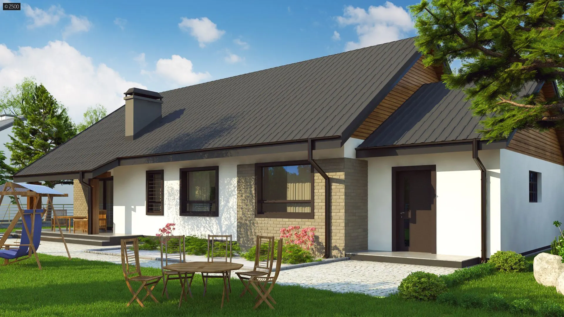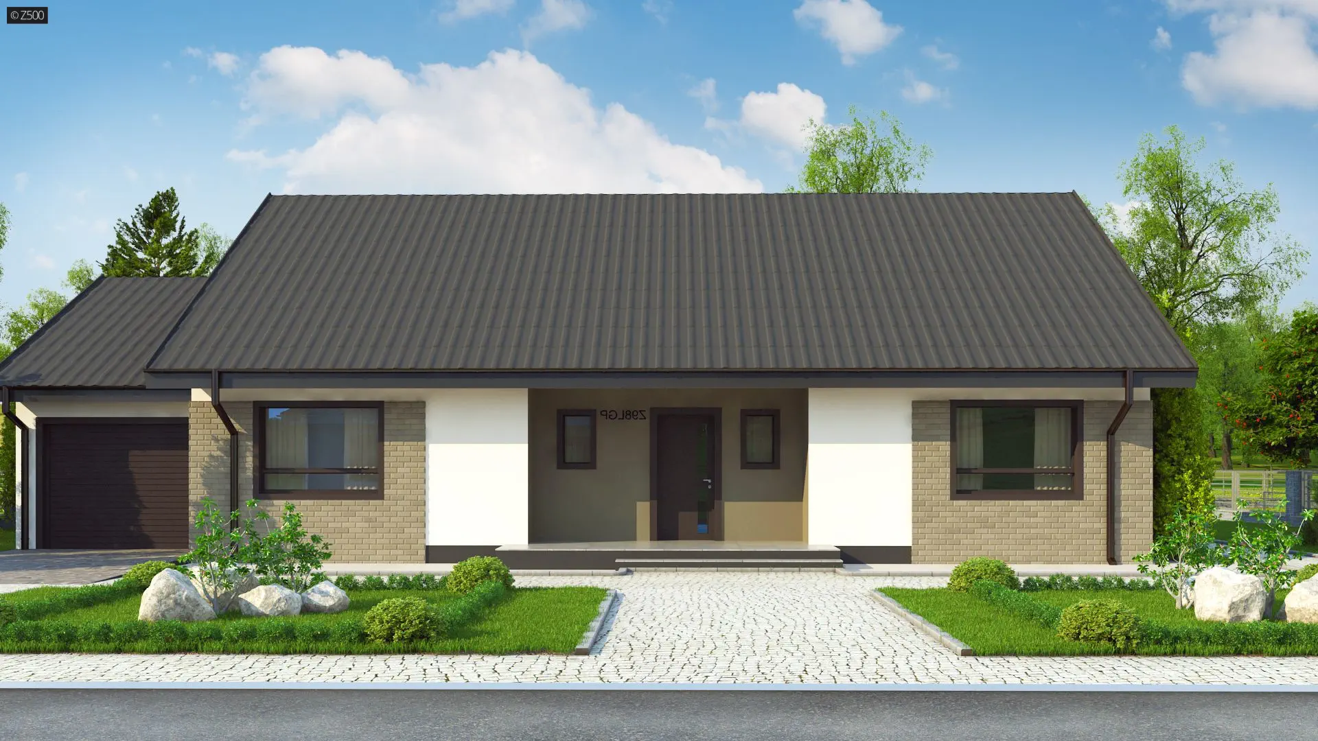Projekt domu Z98 GL to parterowy dom z klasyczną, prostą bryłą, 3 pokojami, garażem i opcją poddasza. W układzie przewidziano 3 sypialnie, 2 łazienki, salon 26,08 m², garaż jednostanowiskowy. Minimalna działka: 25,56 m × 18,26 m.