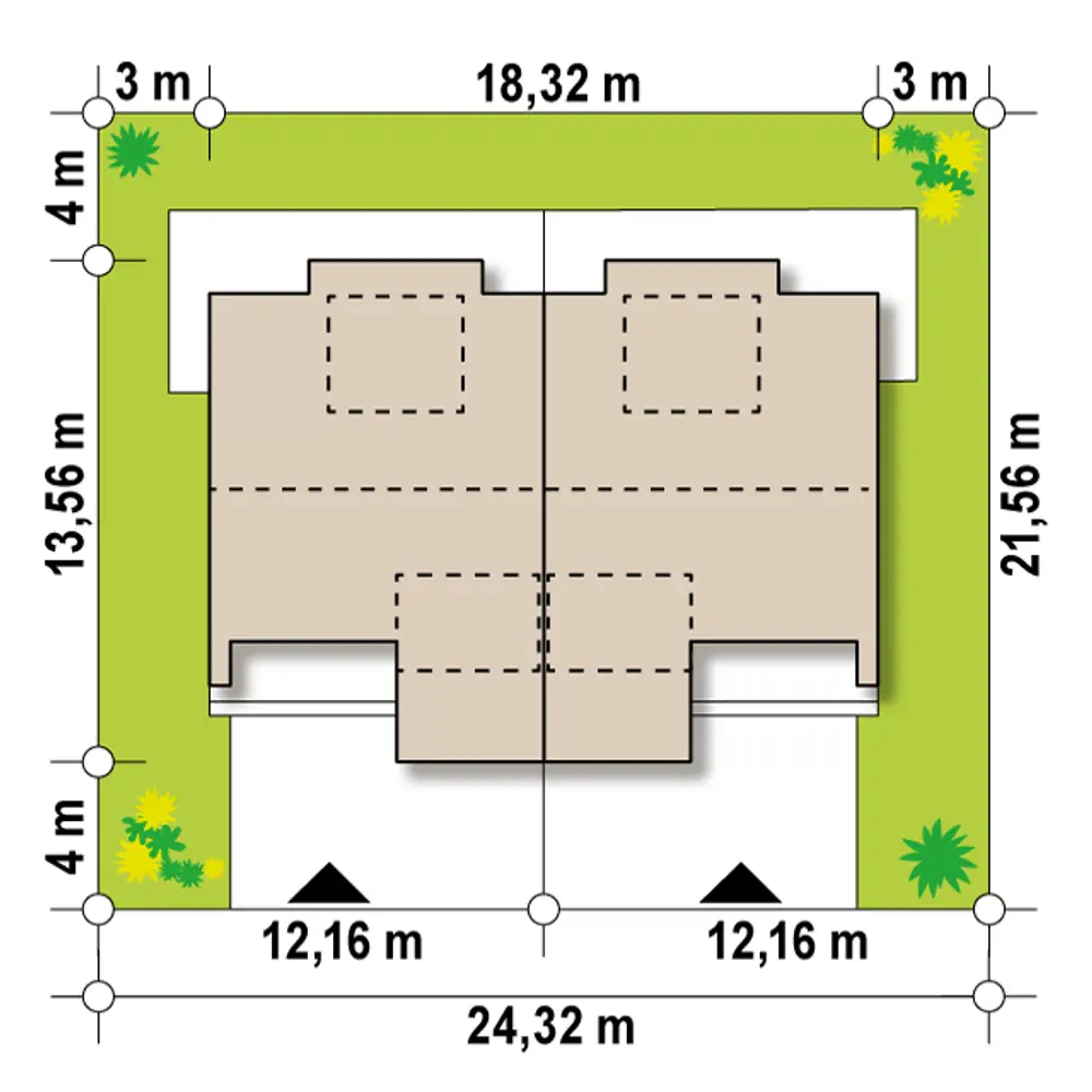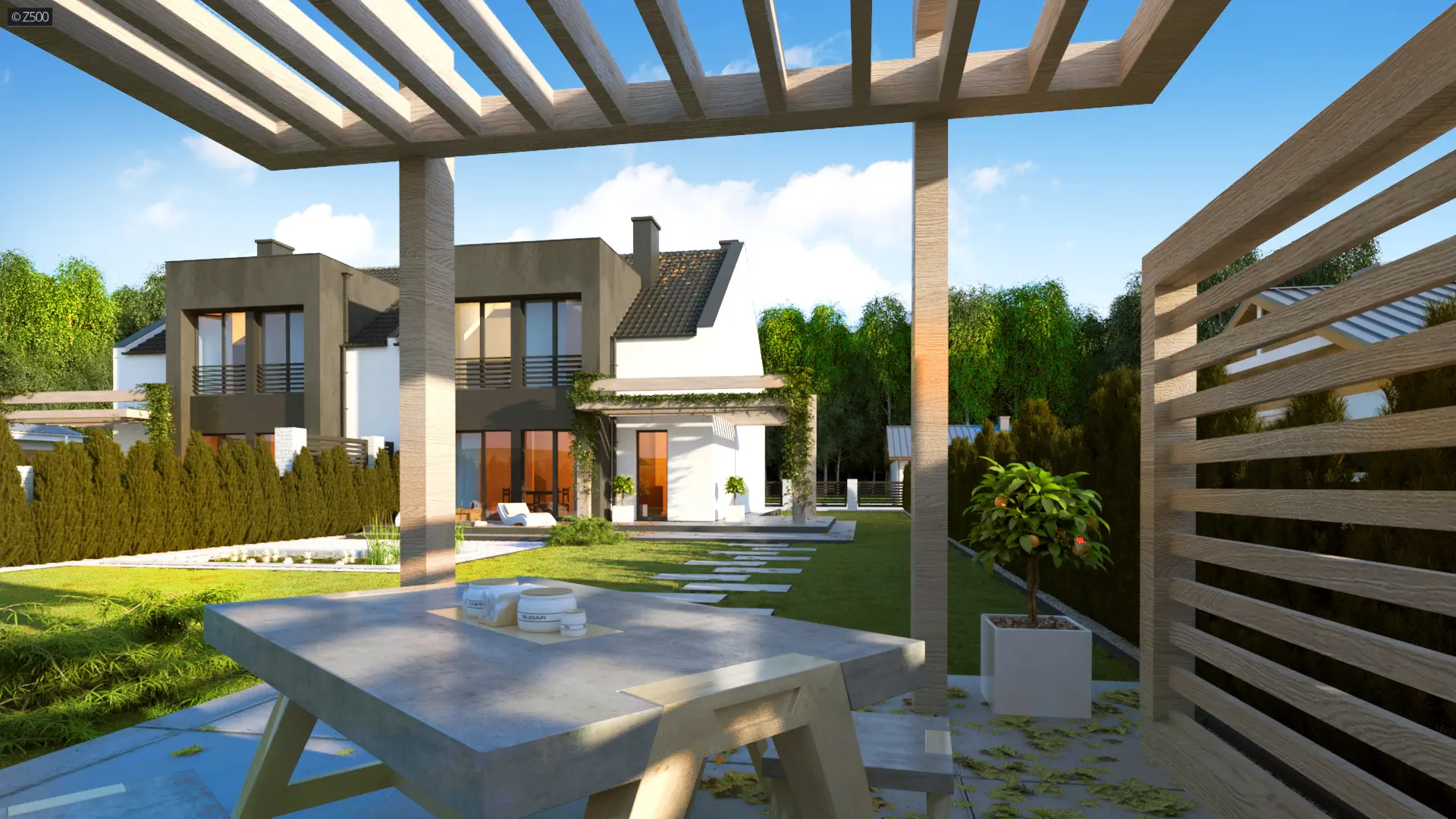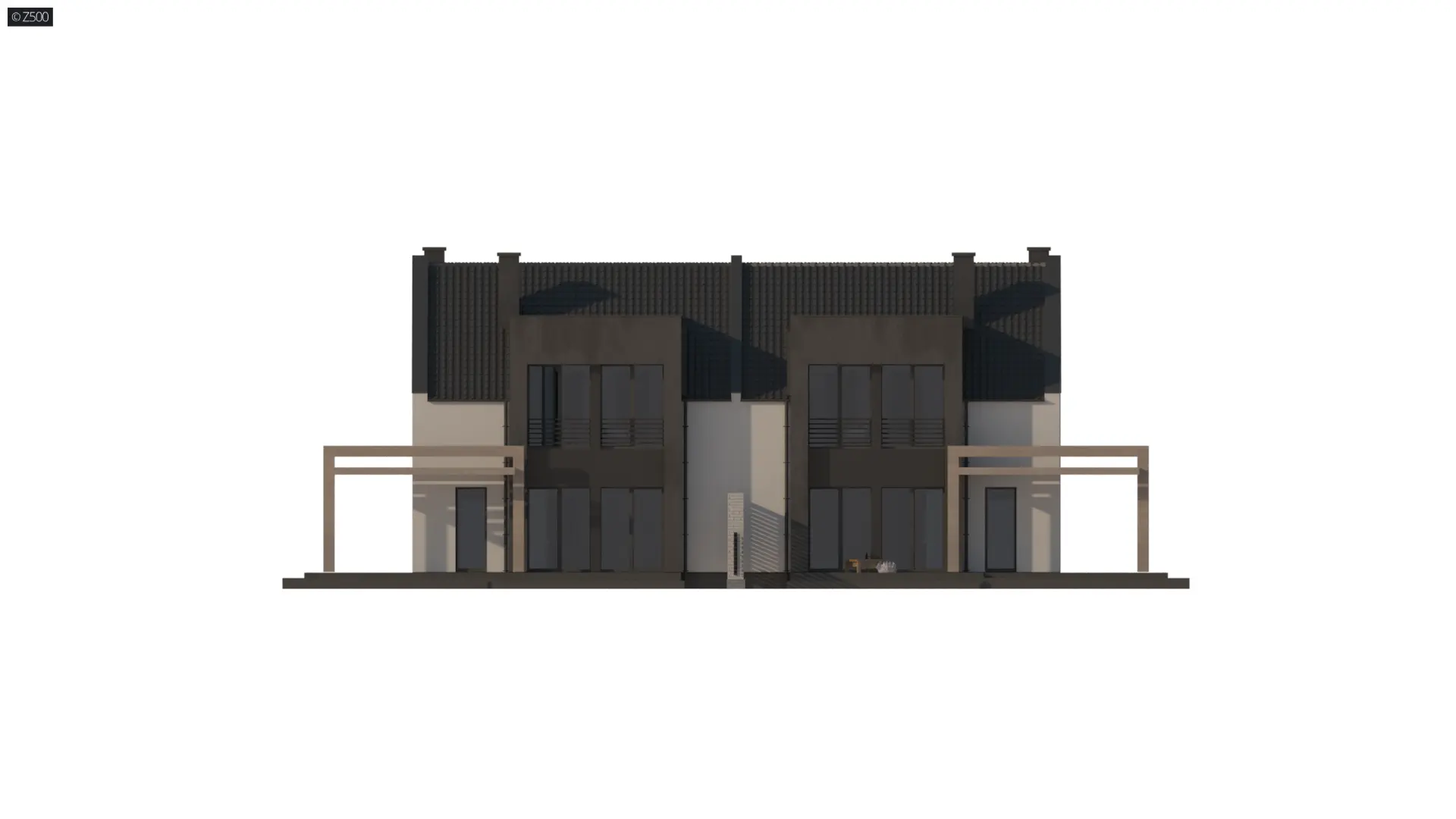 Współczesny bliźniak z dachem dwuspadowym, bez okapów. Może być pobudowany również jako szeregówka, ponieważ nie posiada bocznych otworów okiennych. Od frontu umieszczono drewniane elementy będące zadaszeniem zarówno wejścia jak i balkonu na piętrze. Elewację zdobią nowoczesne, duże lukarny. Od strony ogrodu, nad tarasem rozpościera się nowoczesna drewniana pergola.