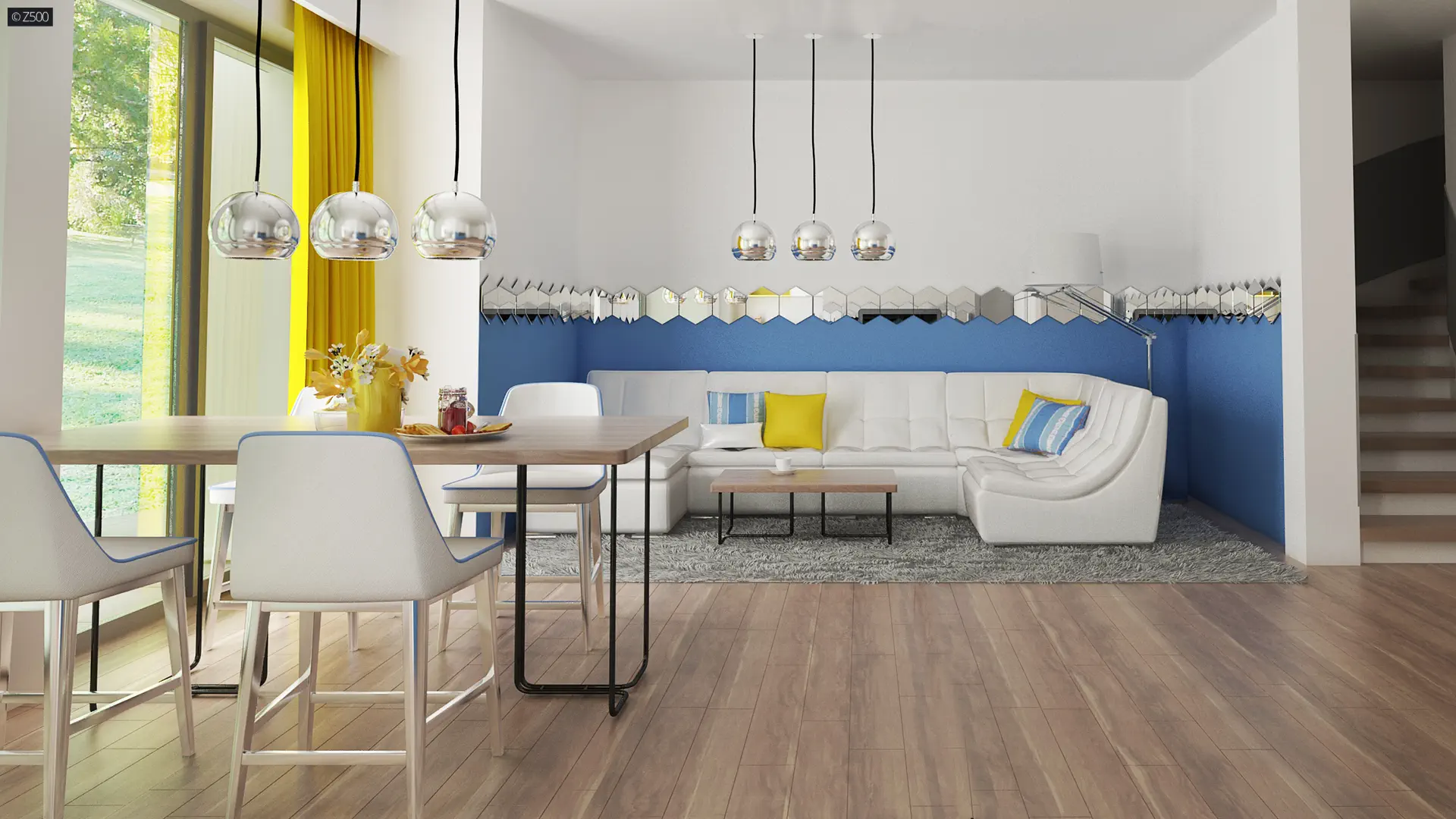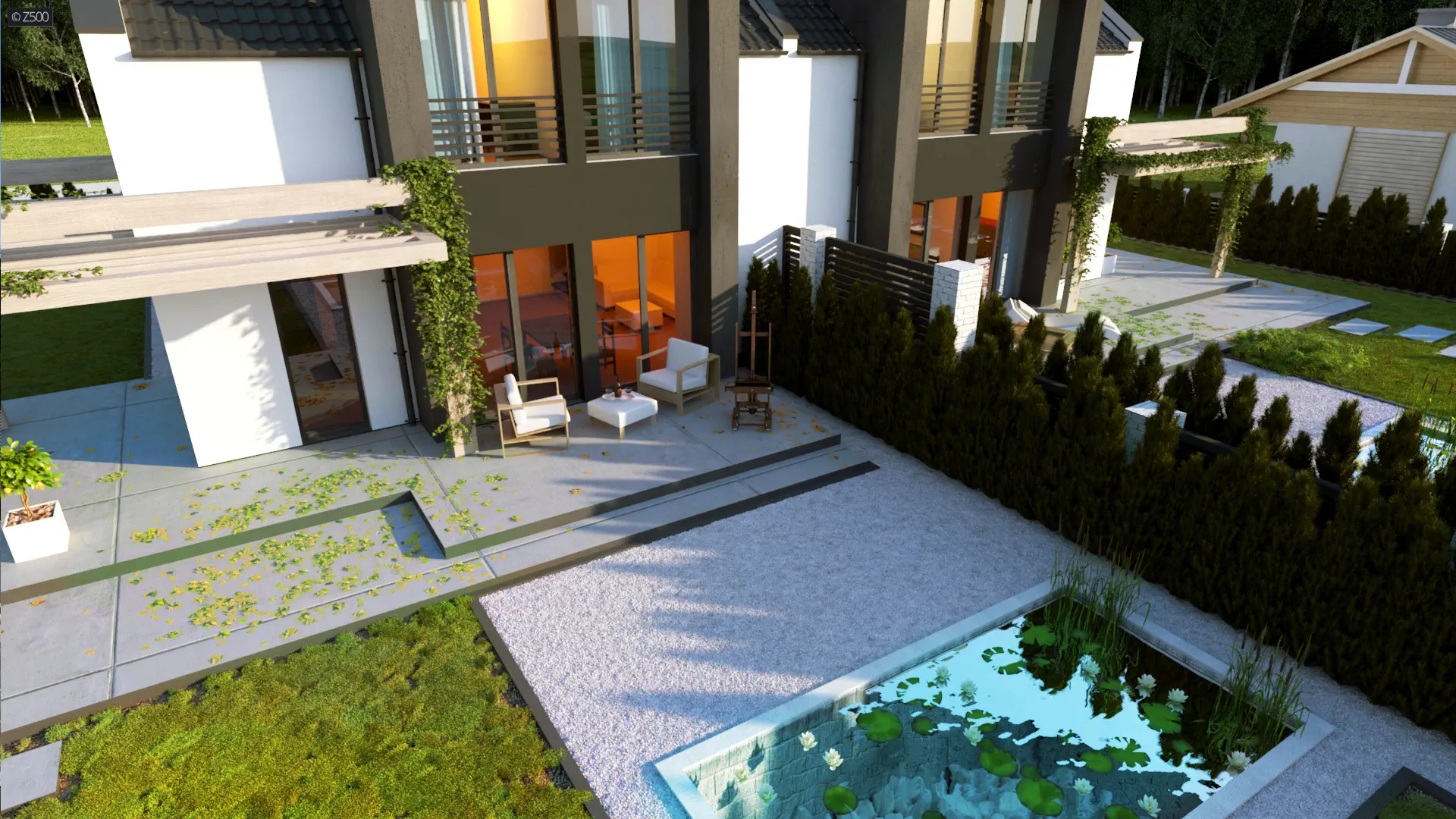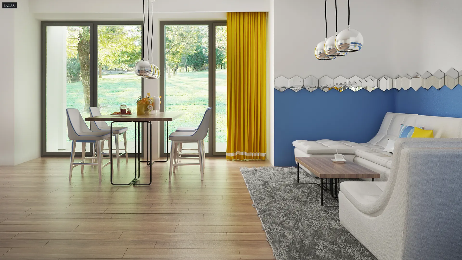 Współczesny bliźniak z dachem dwuspadowym, bez okapów. Może być pobudowany również jako szeregówka, ponieważ nie posiada bocznych otworów okiennych. Od frontu umieszczono drewniane elementy będące zadaszeniem zarówno wejścia jak i balkonu na piętrze. Elewację zdobią nowoczesne, duże lukarny. Od strony ogrodu, nad tarasem rozpościera się nowoczesna drewniana pergola.