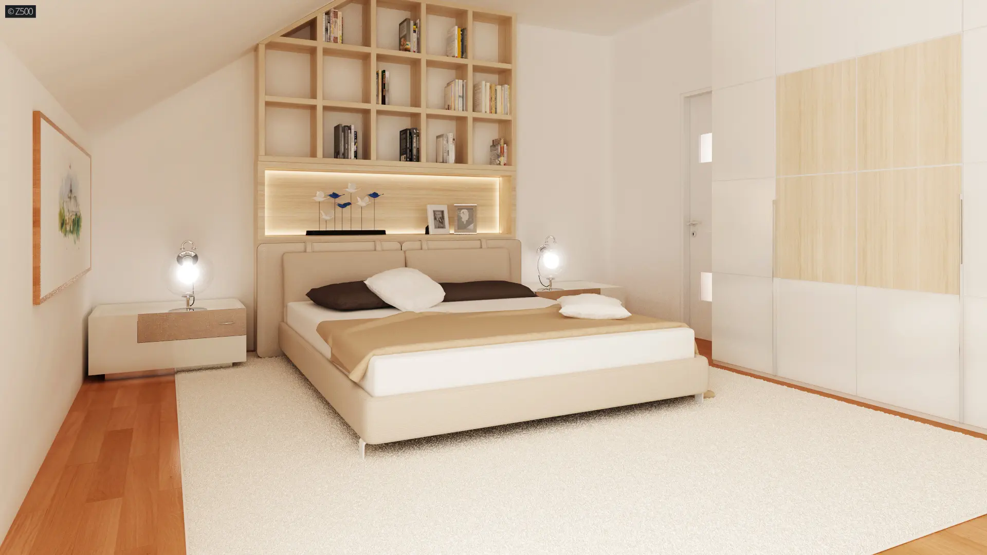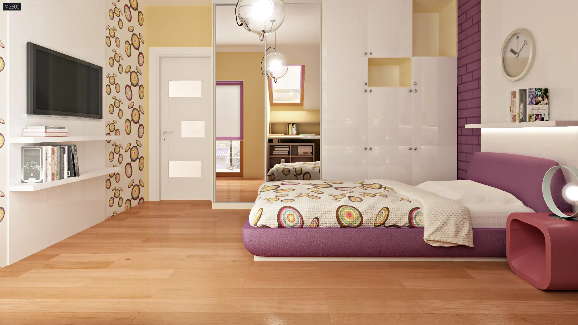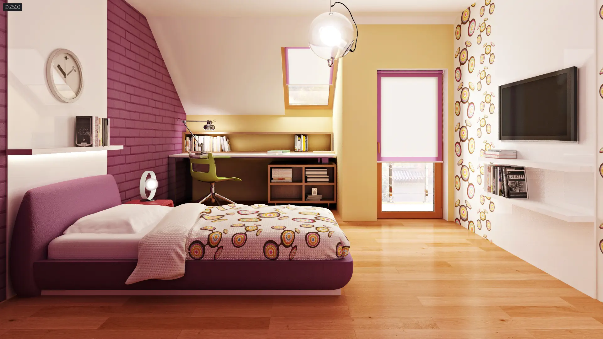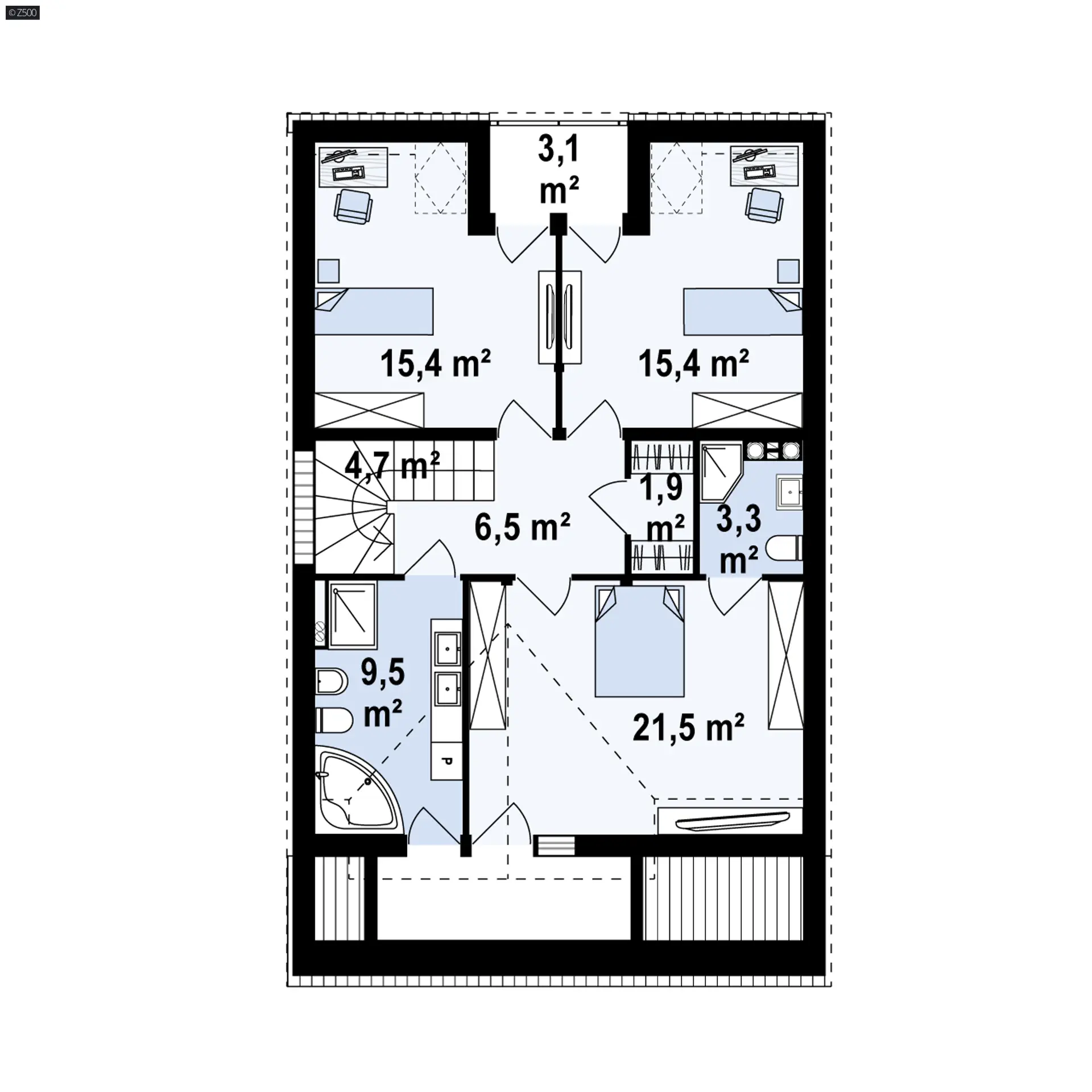 Wchodzimy do domu z przyjemnego dużego podcienia, który po zabudowaniu może pełnić również rolę werandy. Dom zaprojektowany został z podziałem na dwie strefy, dzienną parterową i nocną zlokalizowaną na poddaszu. Część dzienna to oczywiście duży salon z kominkiem, połączony przestrzennie ze schodami prowadzącymi na komfortowe poddasze z 3 sypialniami. Główna sypialnia posiada balkonik oraz własną łazienkę. Jest w niej także wystarczająco dużo miejsca, aby wstawić dwie obszerne szafy garderobiane. Pokoje dziecięce zostały podzielone w sprawiedliwy sposób, dla każdego po równo. Każdy z nich ma wyjście do loggii.