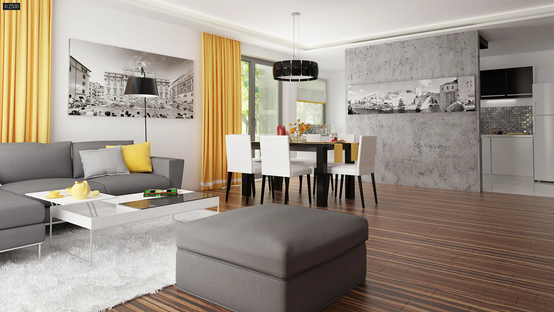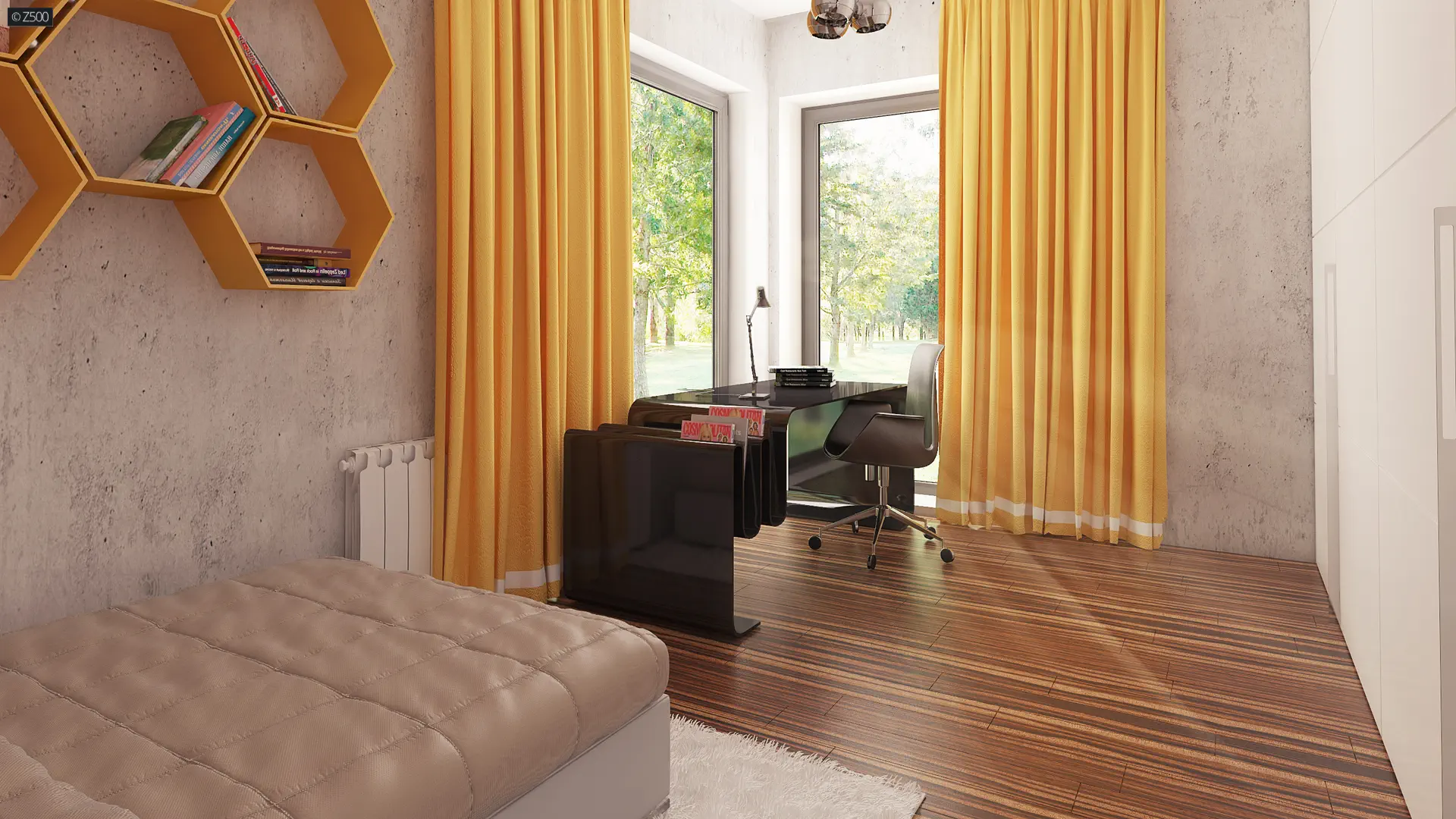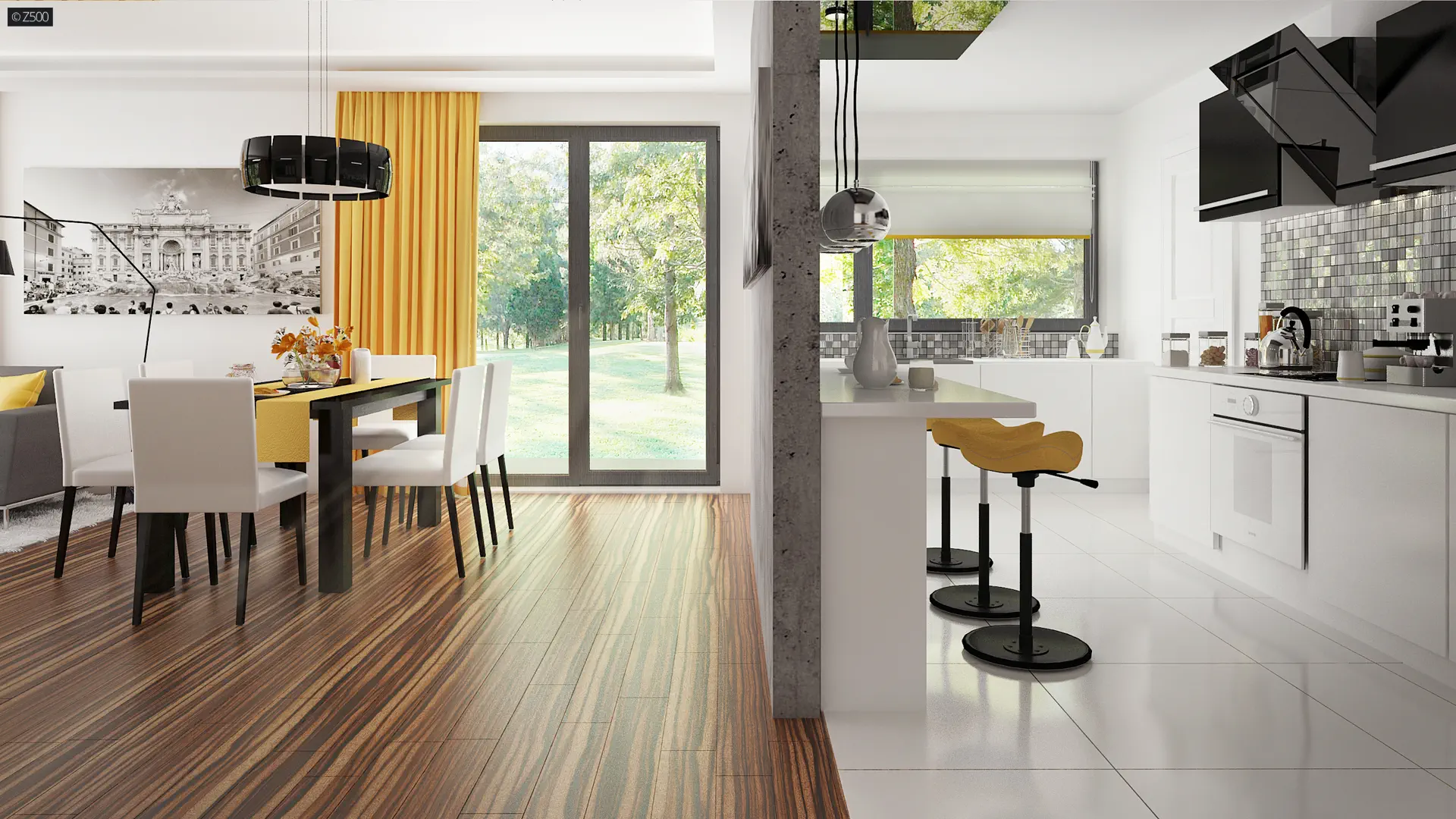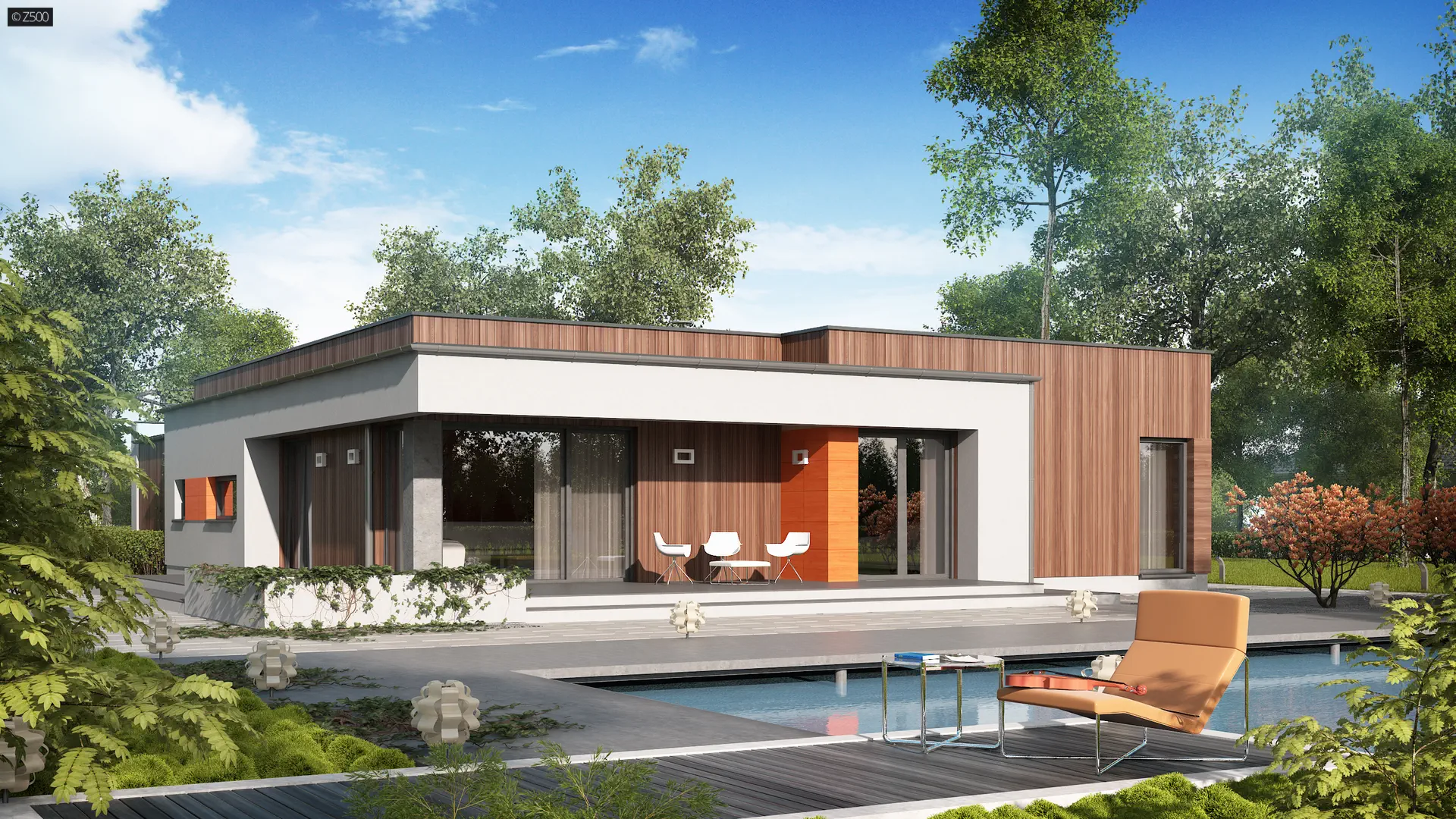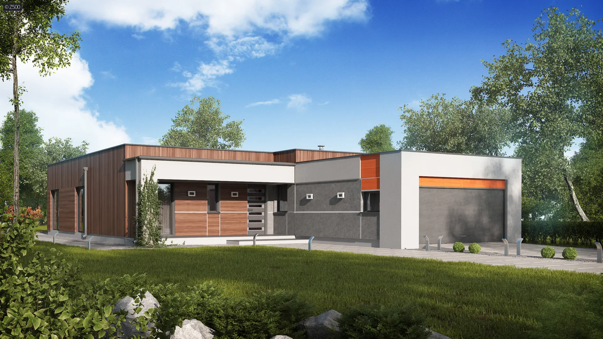 Zx103 to zgrabny parterowy dom z garażem dwustanowiskowym w nowoczesnym stylu. Prosta, kubiczna bryła z płaskim dachem oraz naturalne elementy wykończenia elewacji dodają mu elegancji i wdzięku.