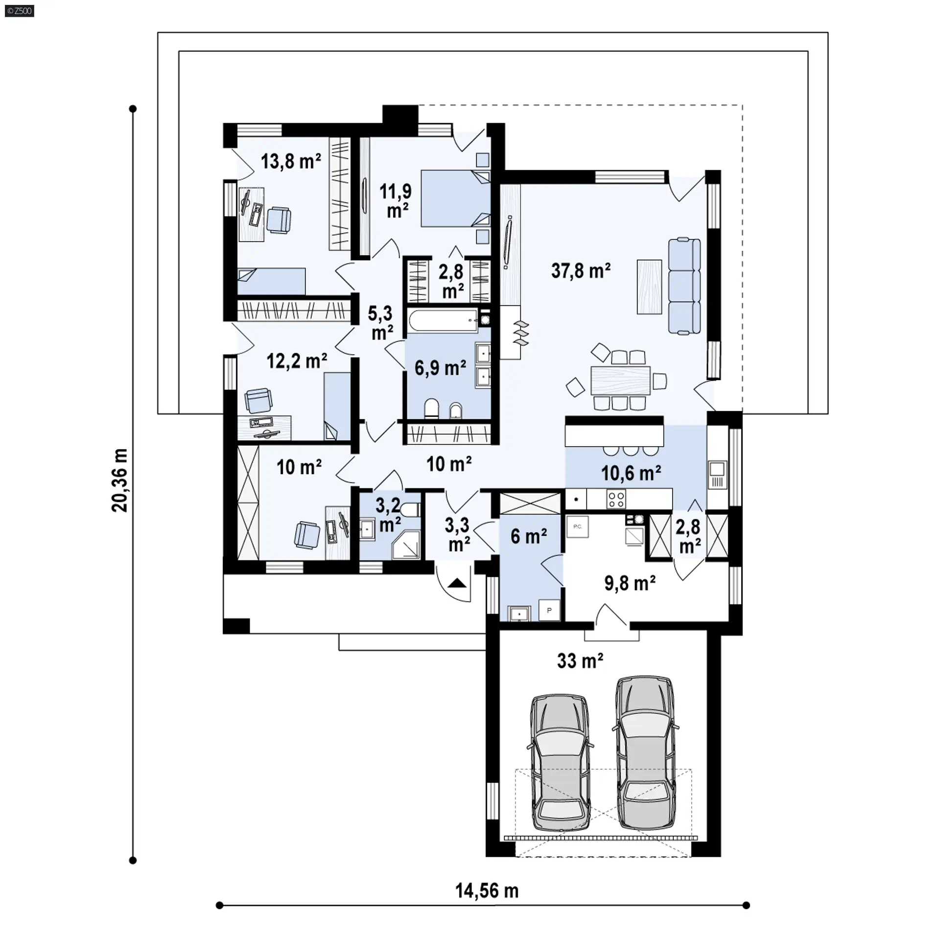 Nowoczesny dom z płaskim dachem, czterema sypialniami i garażem dwustanowiskowym