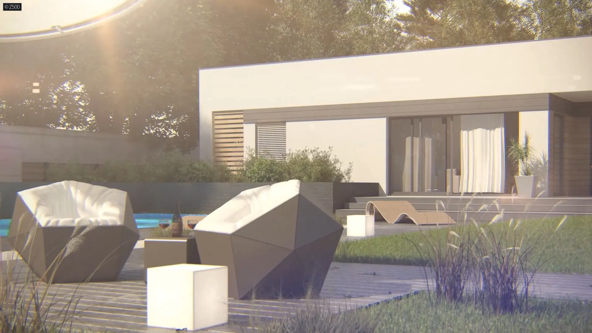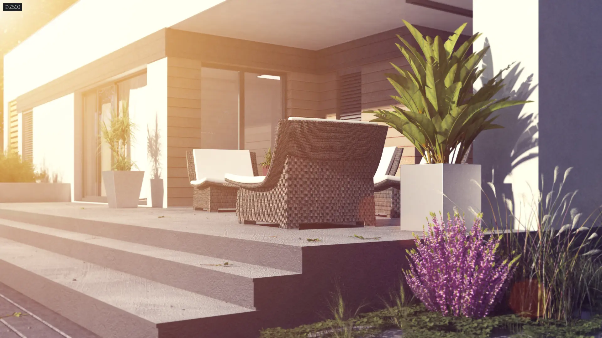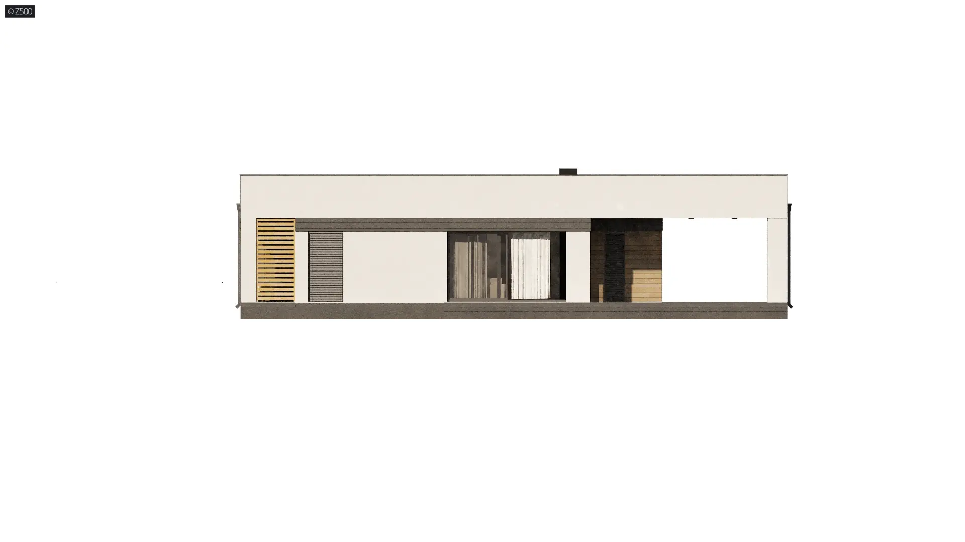 Zx117 to dom nowoczesny, parterowy, z płaskim dachem. Elewacja częściowo pokryta drewnem, zachowana w duchu cichości serca i bliskości z naturą, o możliwie prostym wyglądzie.