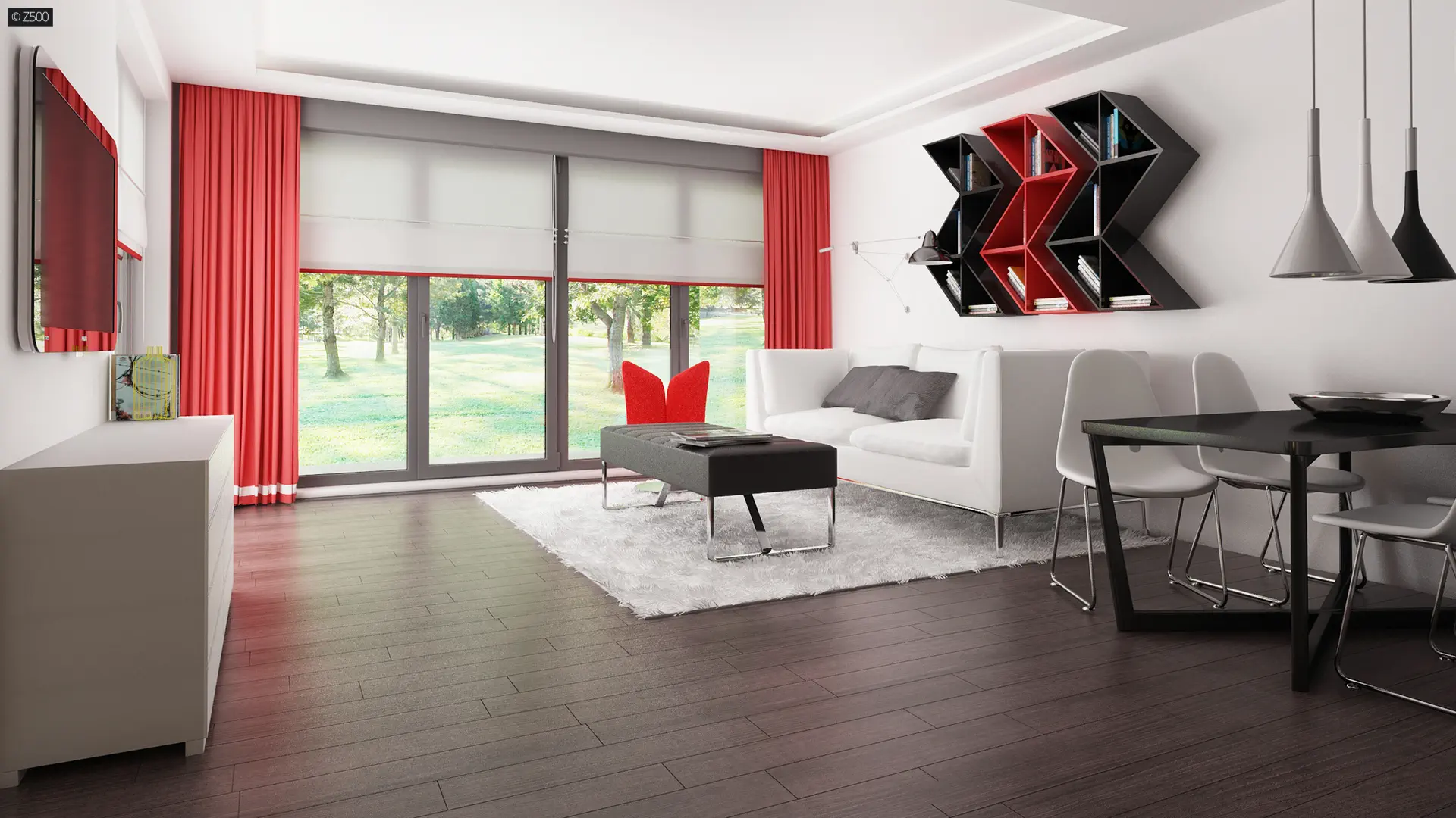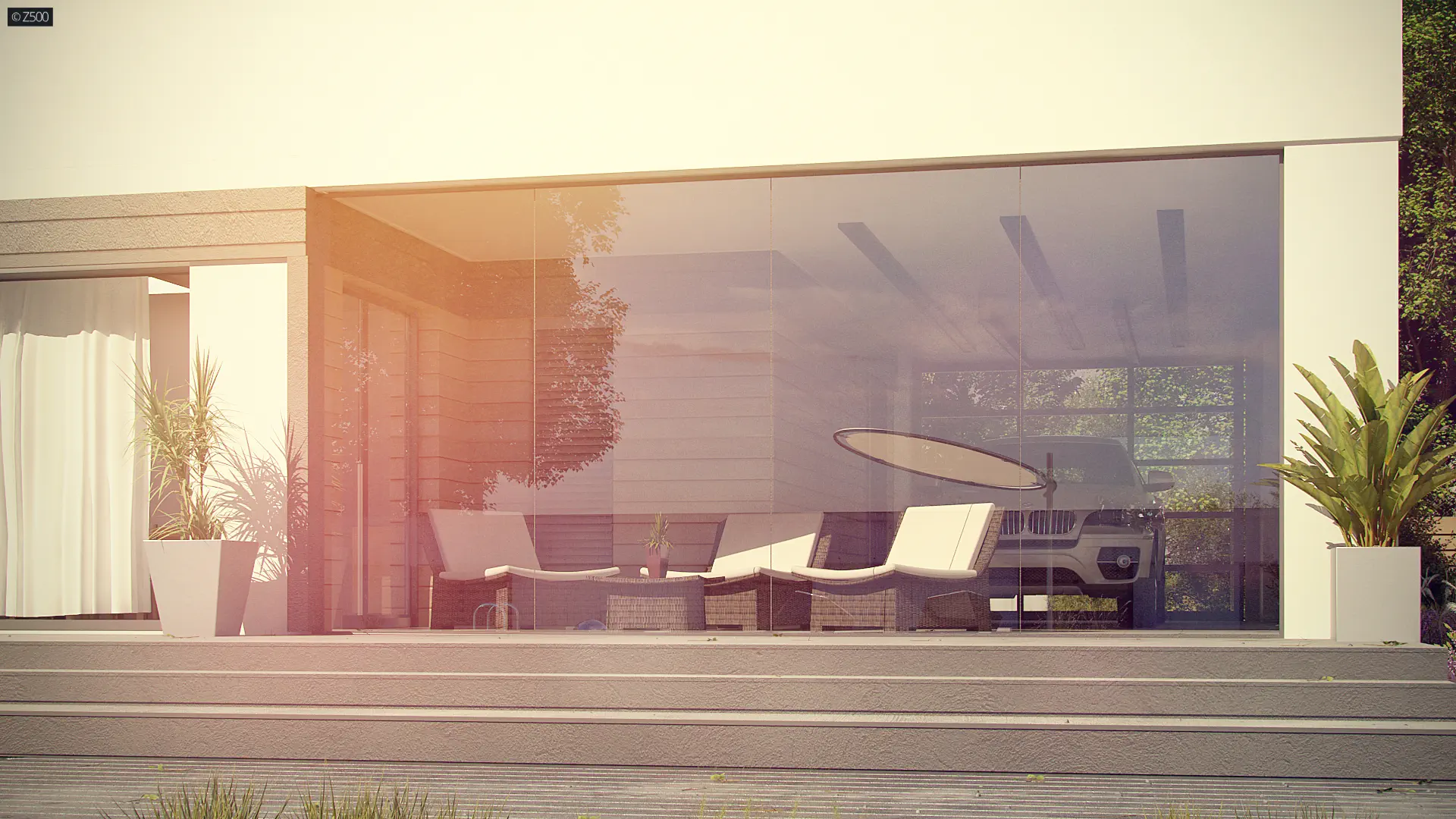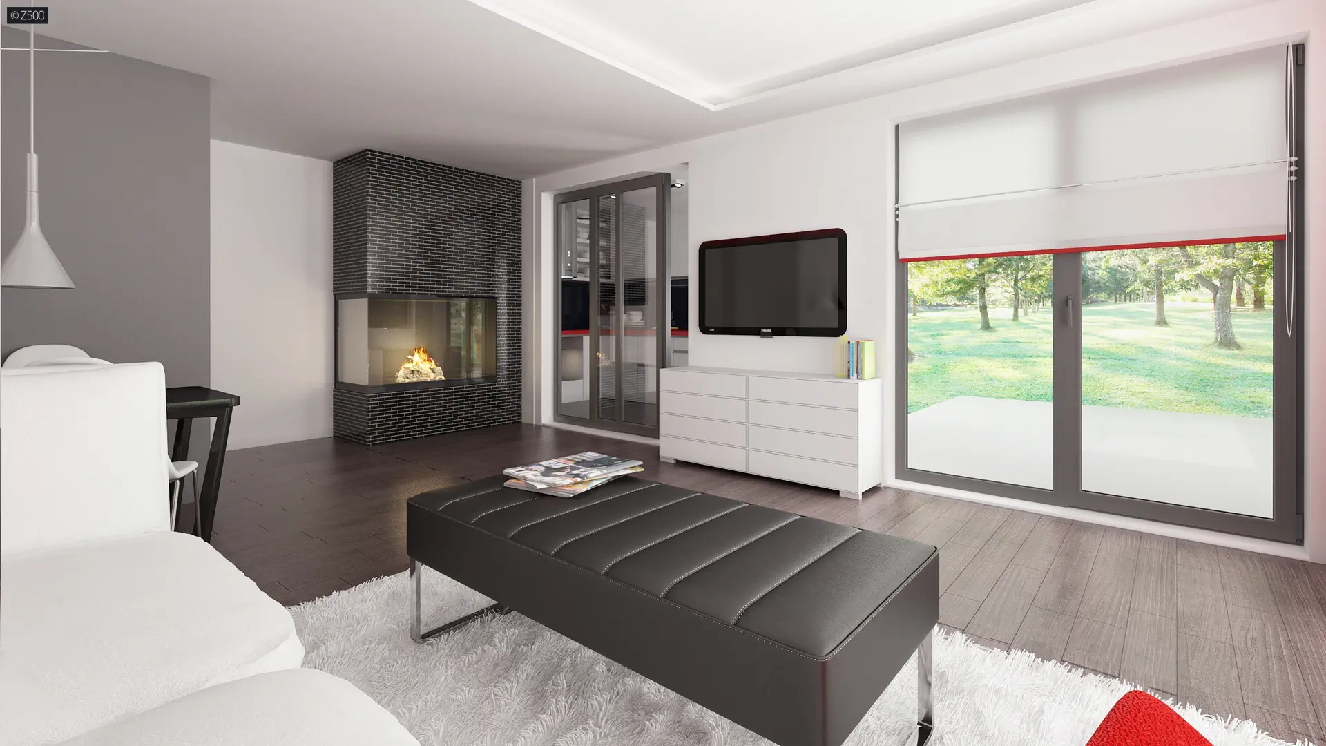 Zx117 to dom nowoczesny, parterowy, z płaskim dachem. Elewacja częściowo pokryta drewnem, zachowana w duchu cichości serca i bliskości z naturą, o możliwie prostym wyglądzie.