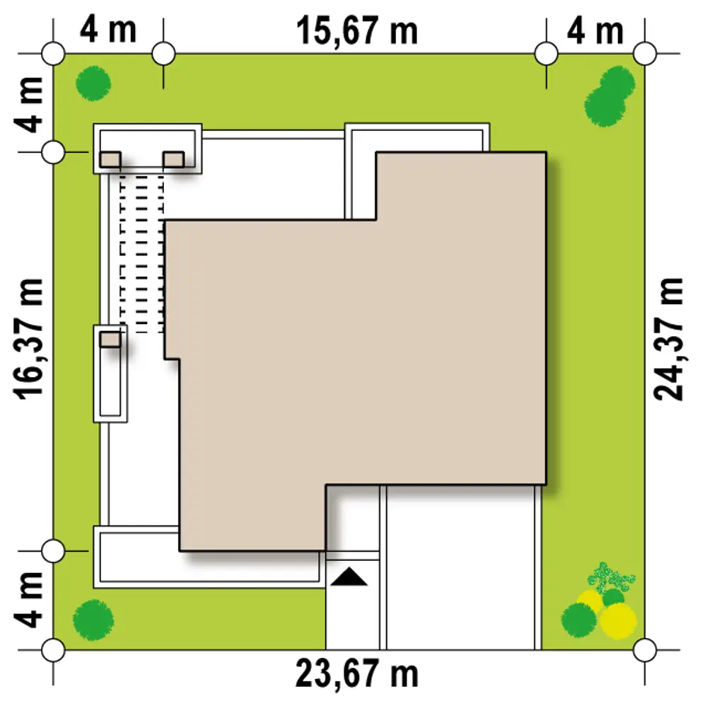 Przykładowa aranżacja najbliższego otoczenia budynku w postaci klombów zieleni daje możliwość cichego, spokojnego relaksu na tarasie.