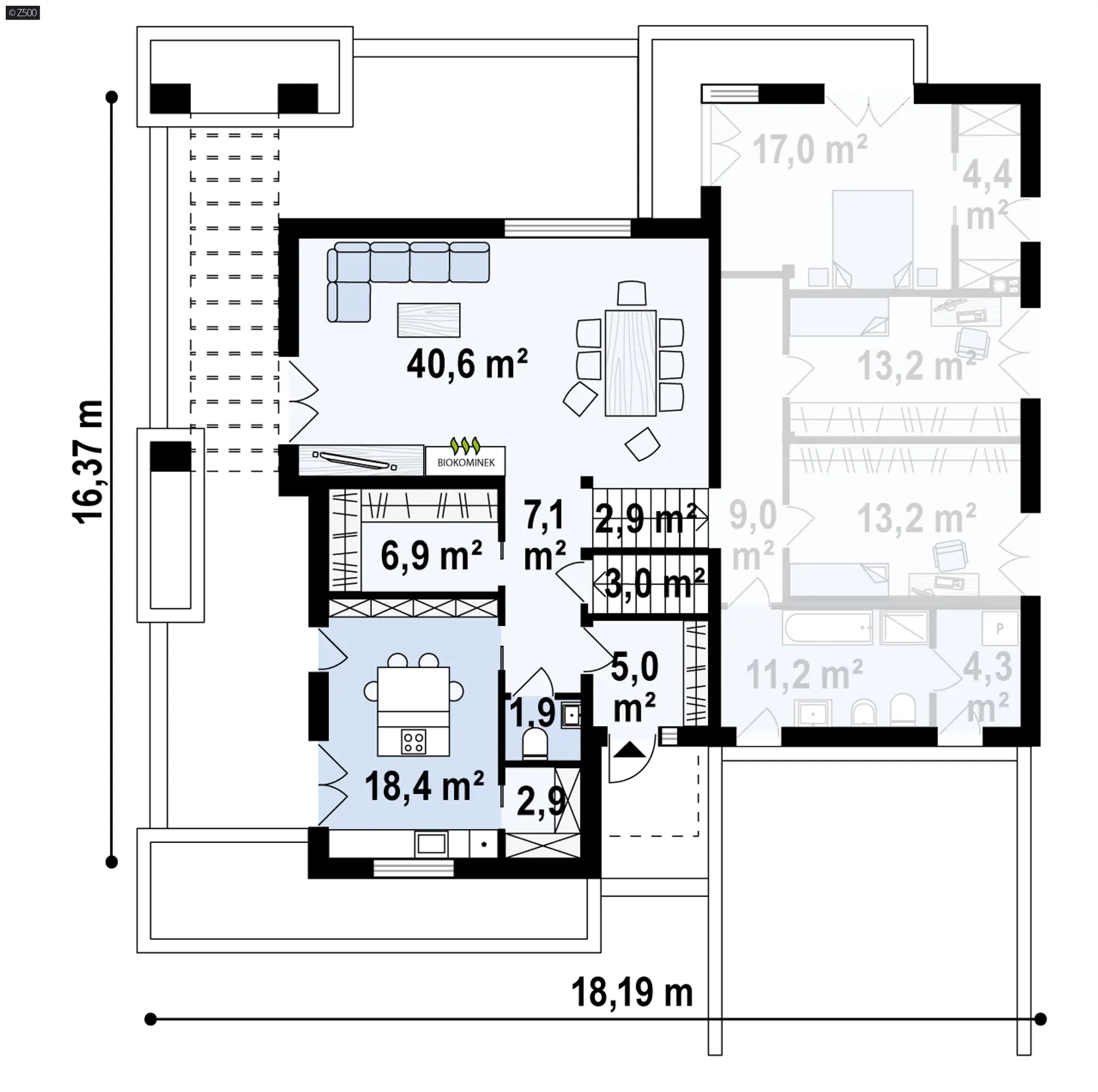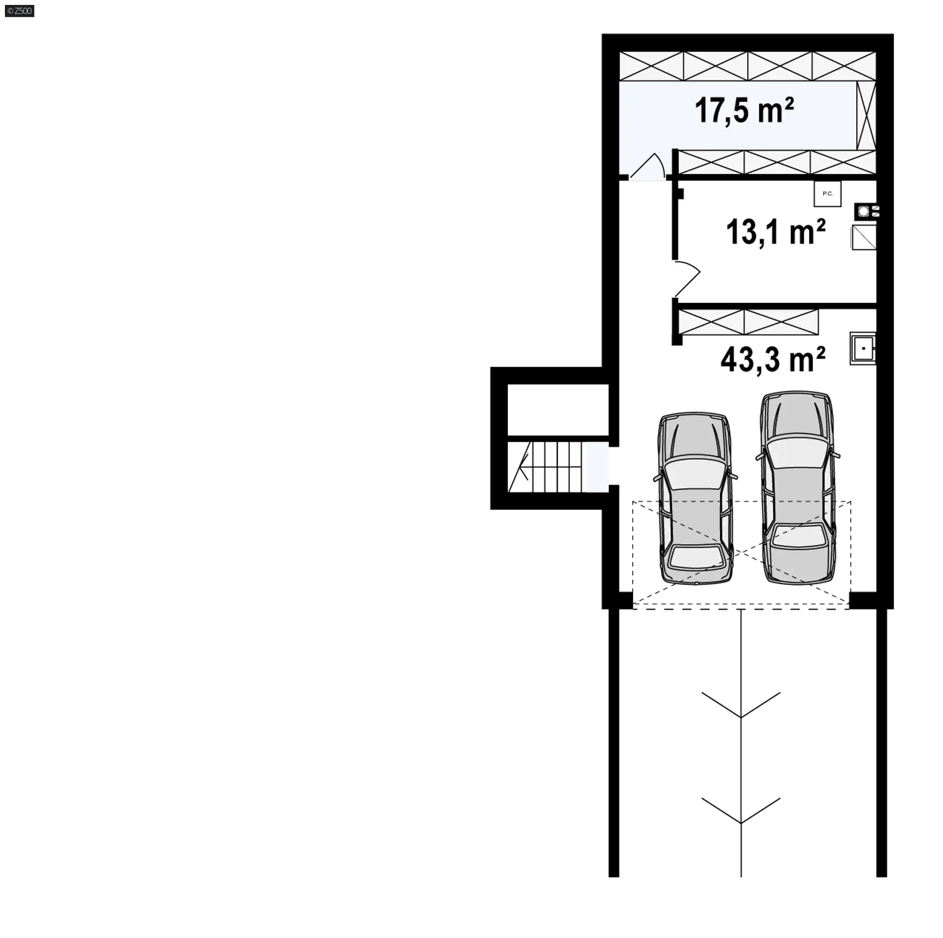 Dom został częściowo podpiwniczony, abyśmy doskonale mogli wykorzystać przestronną podziemną przestrzeń jako część techniczno – gospodarczą. Pamiętano również o dwustanowiskowym garażu, którym mogą być zainteresowani także cykliści.
