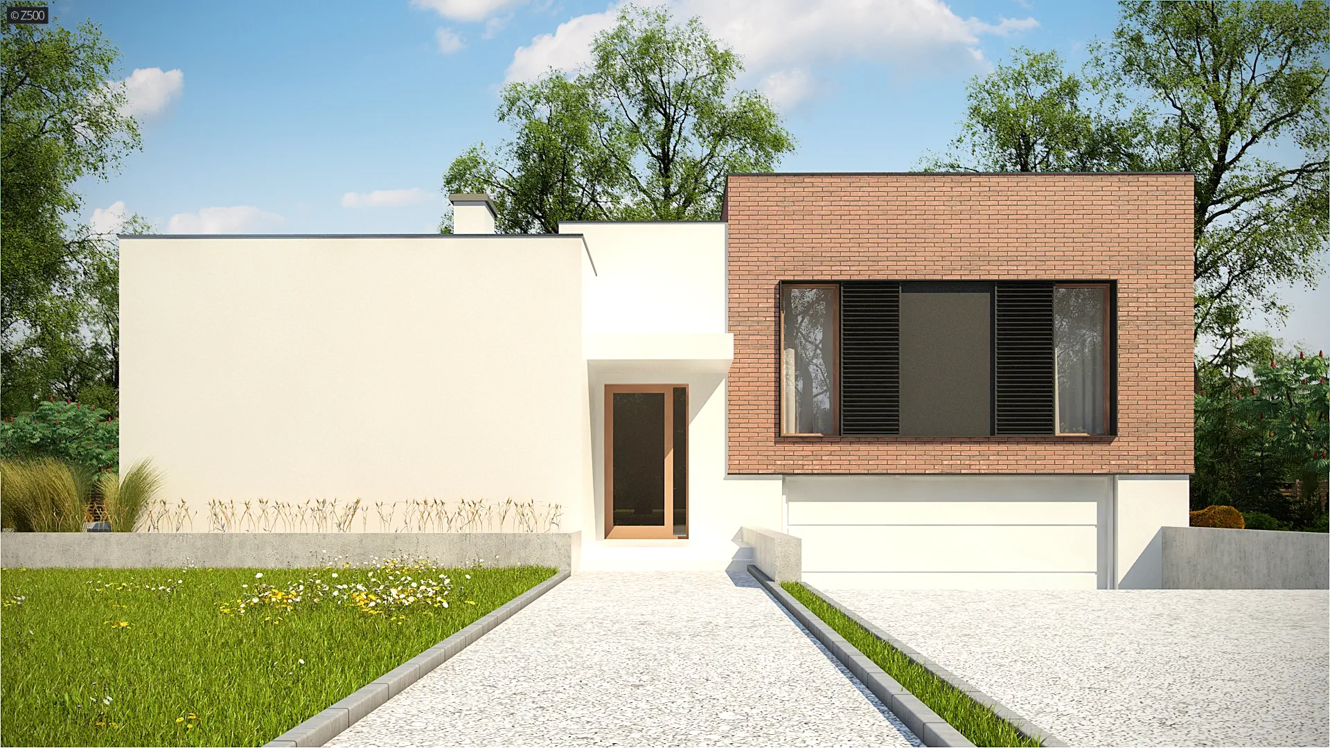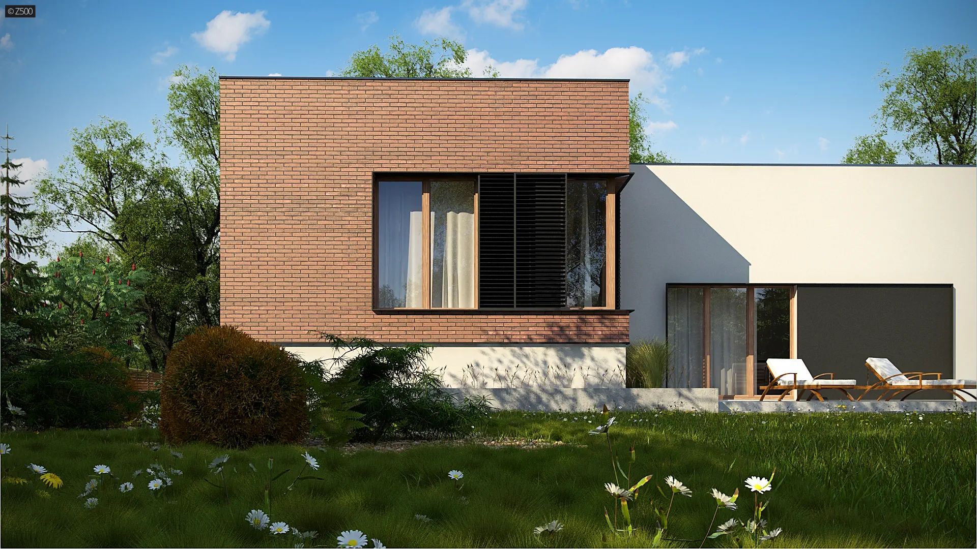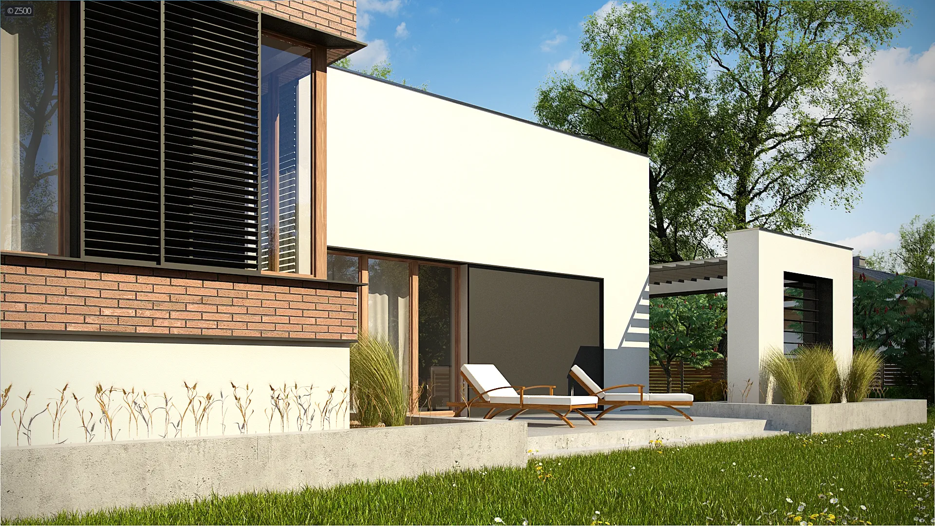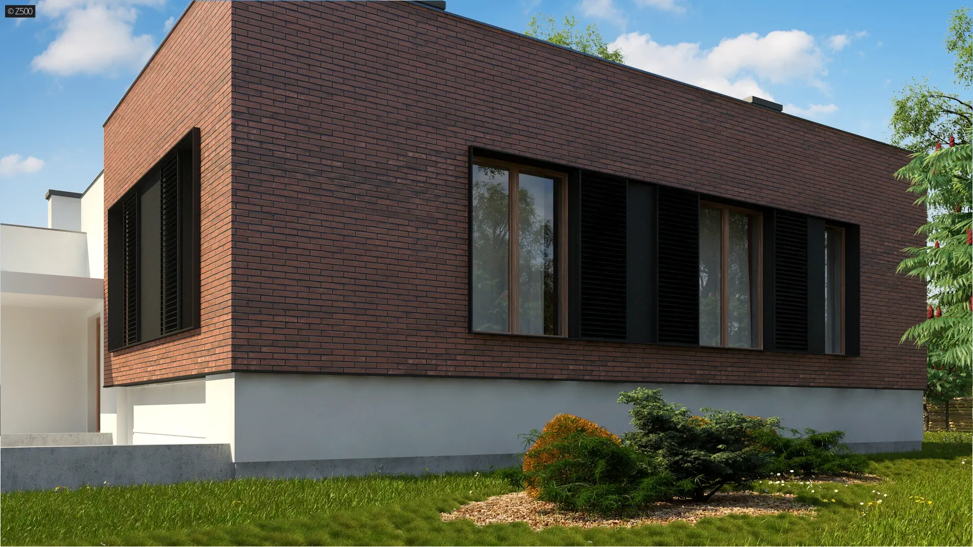 Zx 132 charakteryzuje prosta stylistyka, minimalizm oraz akcent kompozycji architektonicznej w postaci materiału elewacyjnego z płytek klinkierowych. Połączenie jasnych i ciemnych barw nadaje mu dobrego smaku oraz indywidualnego charakteru. Duże okna portfenetrowe umożliwiają przedostanie się większej ilości światła. Dodatkiem są przesuwne żaluzje, które dopełniają kompozycję i odcinają dopływ refleksów słonecznych gdy mamy ich nadmiar.