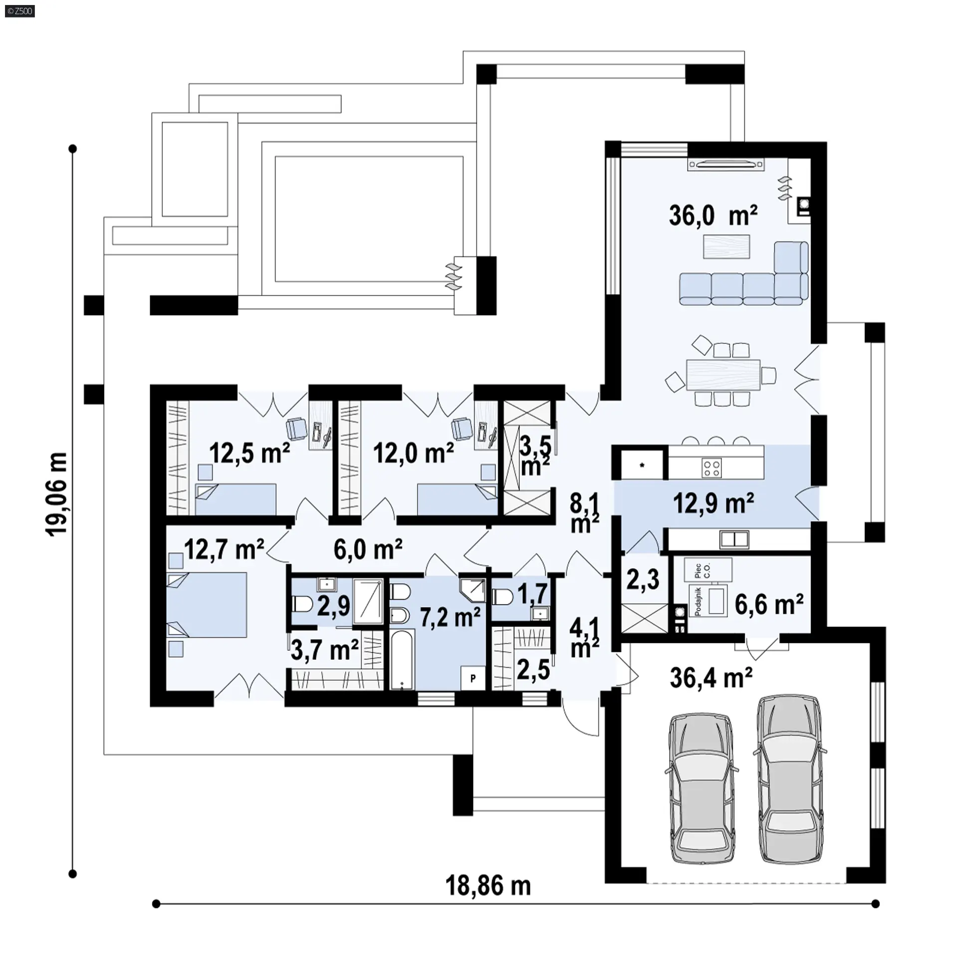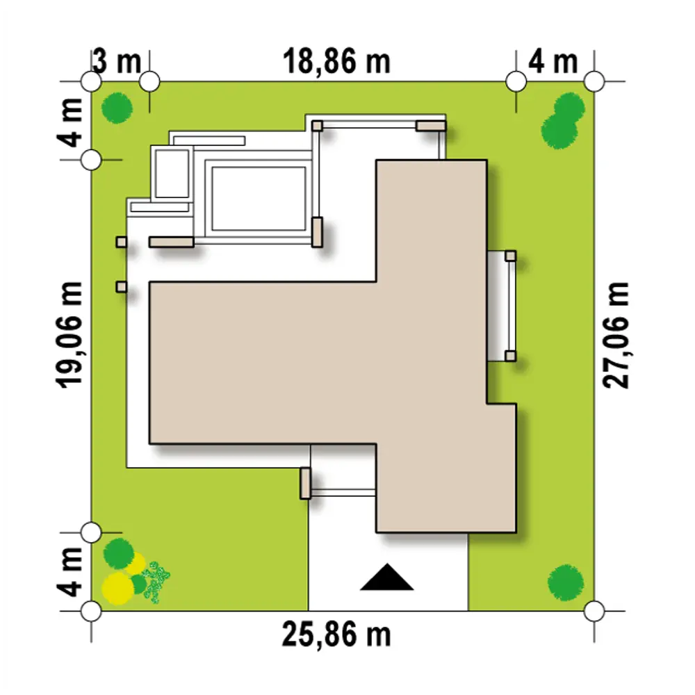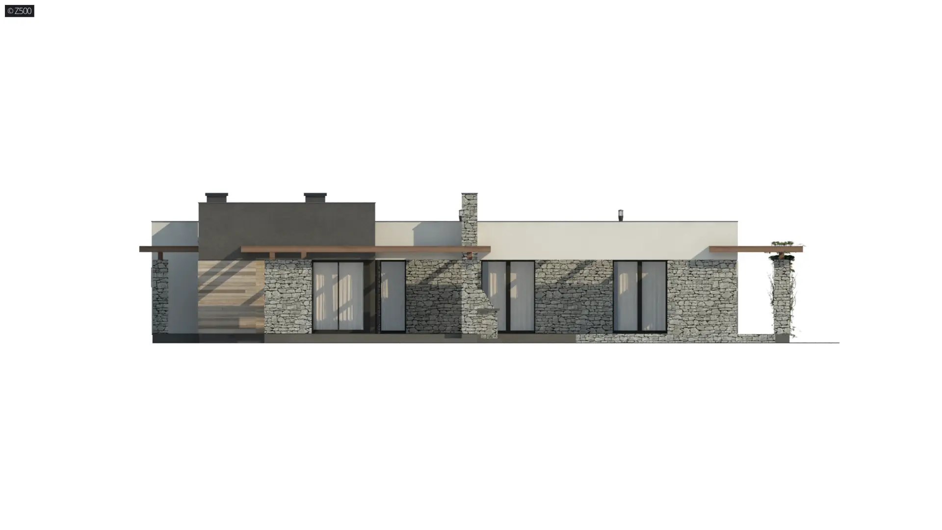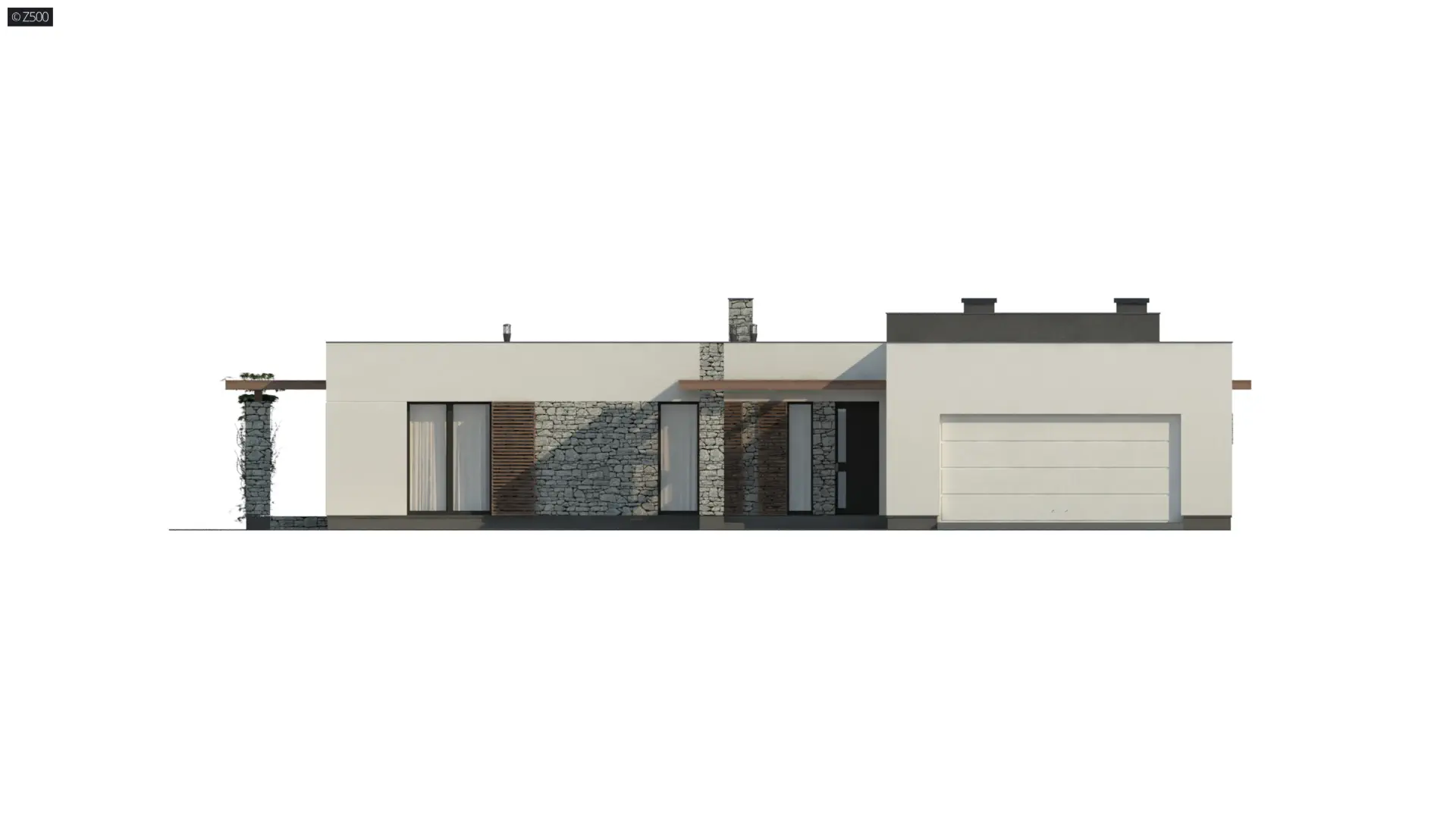 Zx137 to parterowy budynek z dwustanowiskowym garażem i płaskim dachem. Posiada duże przeszklenia i ażurowe zadaszenia nad częścią wejściową i ogrodową.