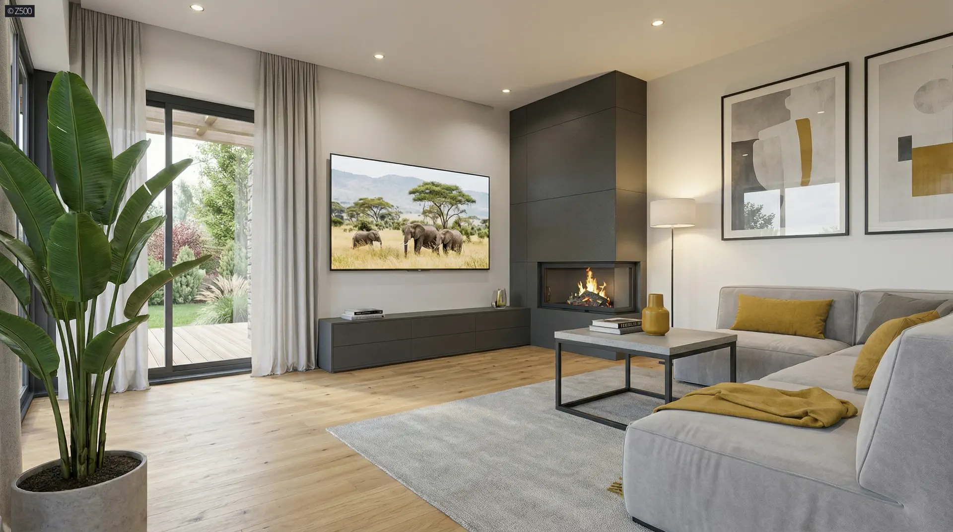Na wykończenie elewacji składa się surowa okładzina kamienna oraz tynk w kolorze białym.