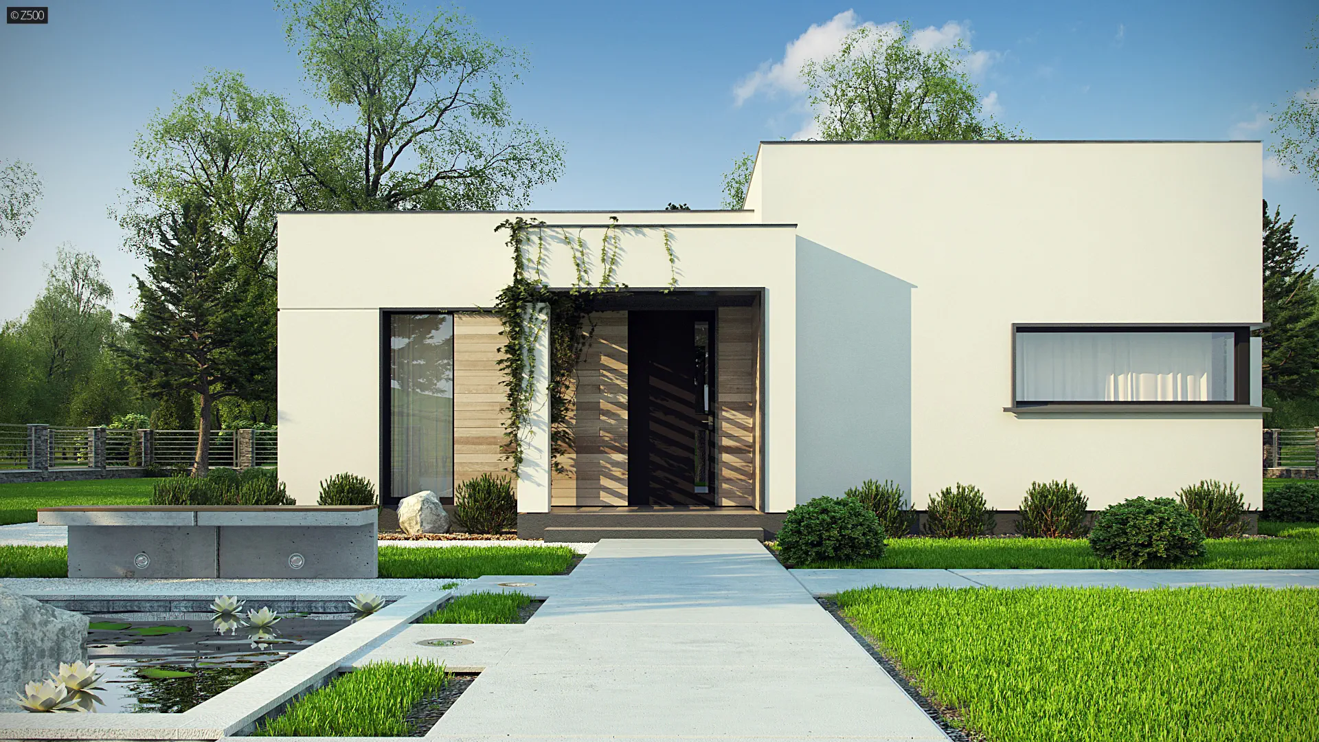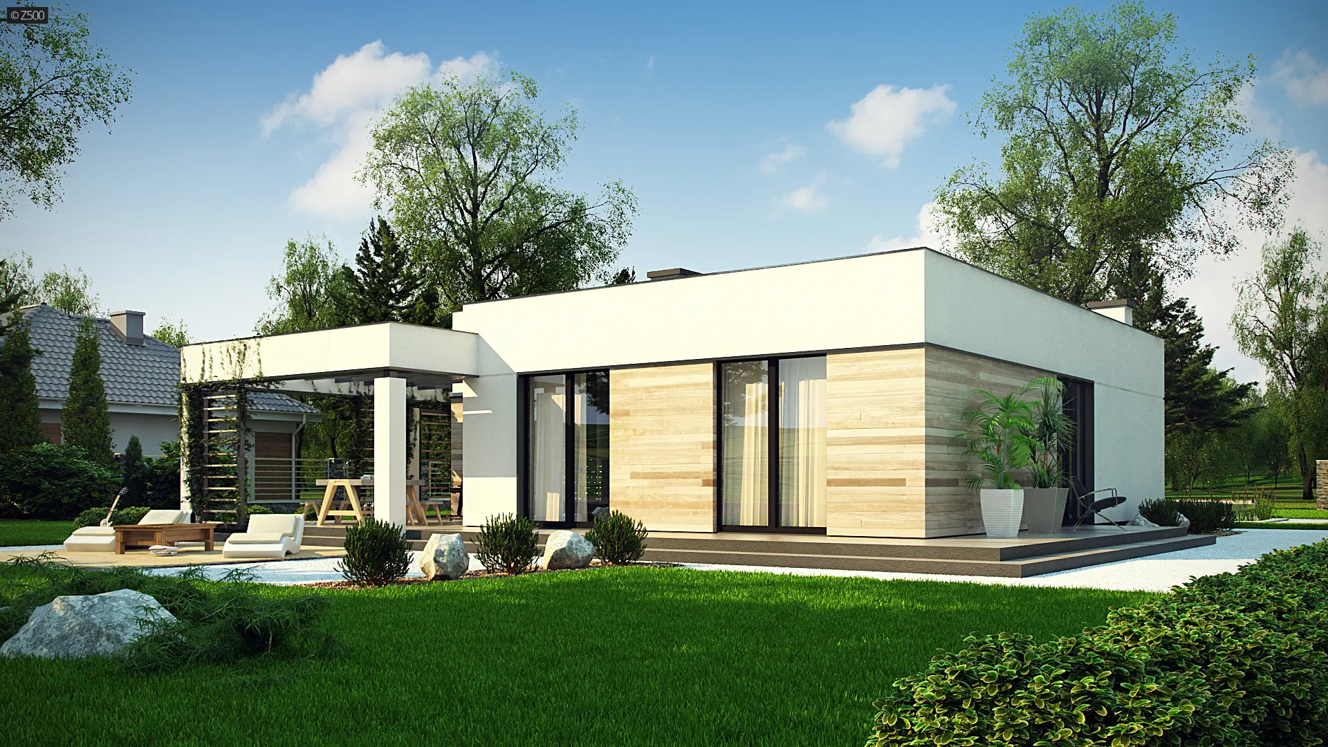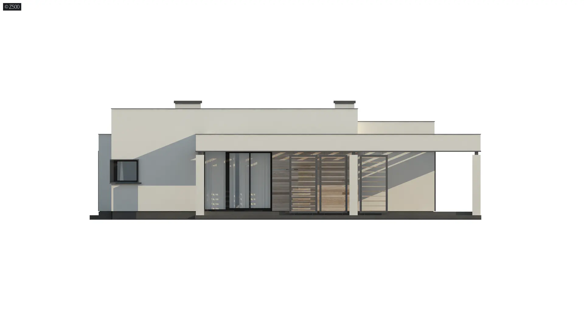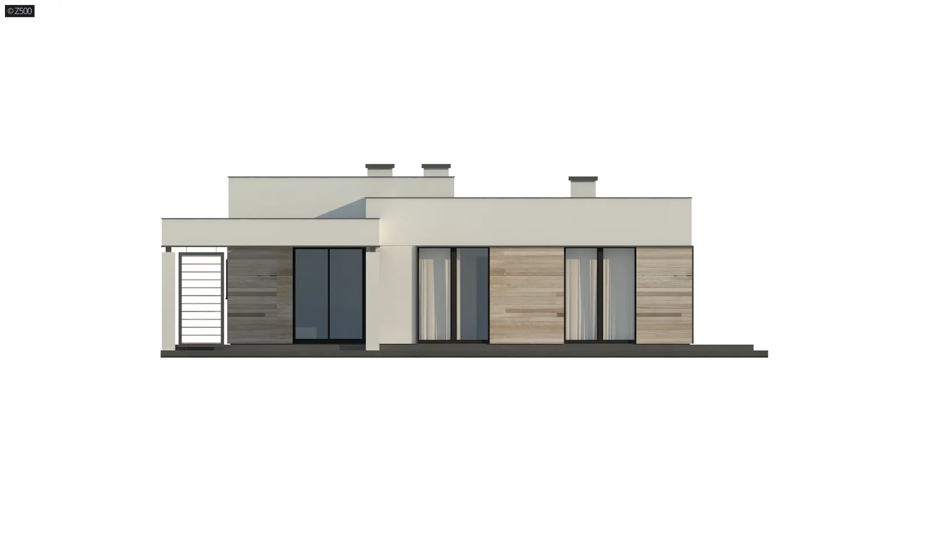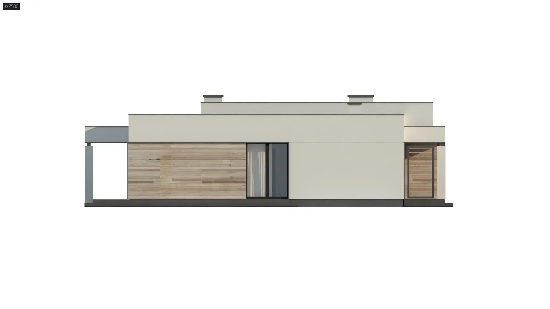 Zx138 D jest projektem domu parterowego o konstrukcji drewnianej (szkieletowej). Jego nowoczesna, surowa bryła, płaski dach oraz detale w postaci drewnianej okładziny elewacyjnej nadają mu osobliwego wyglądu.