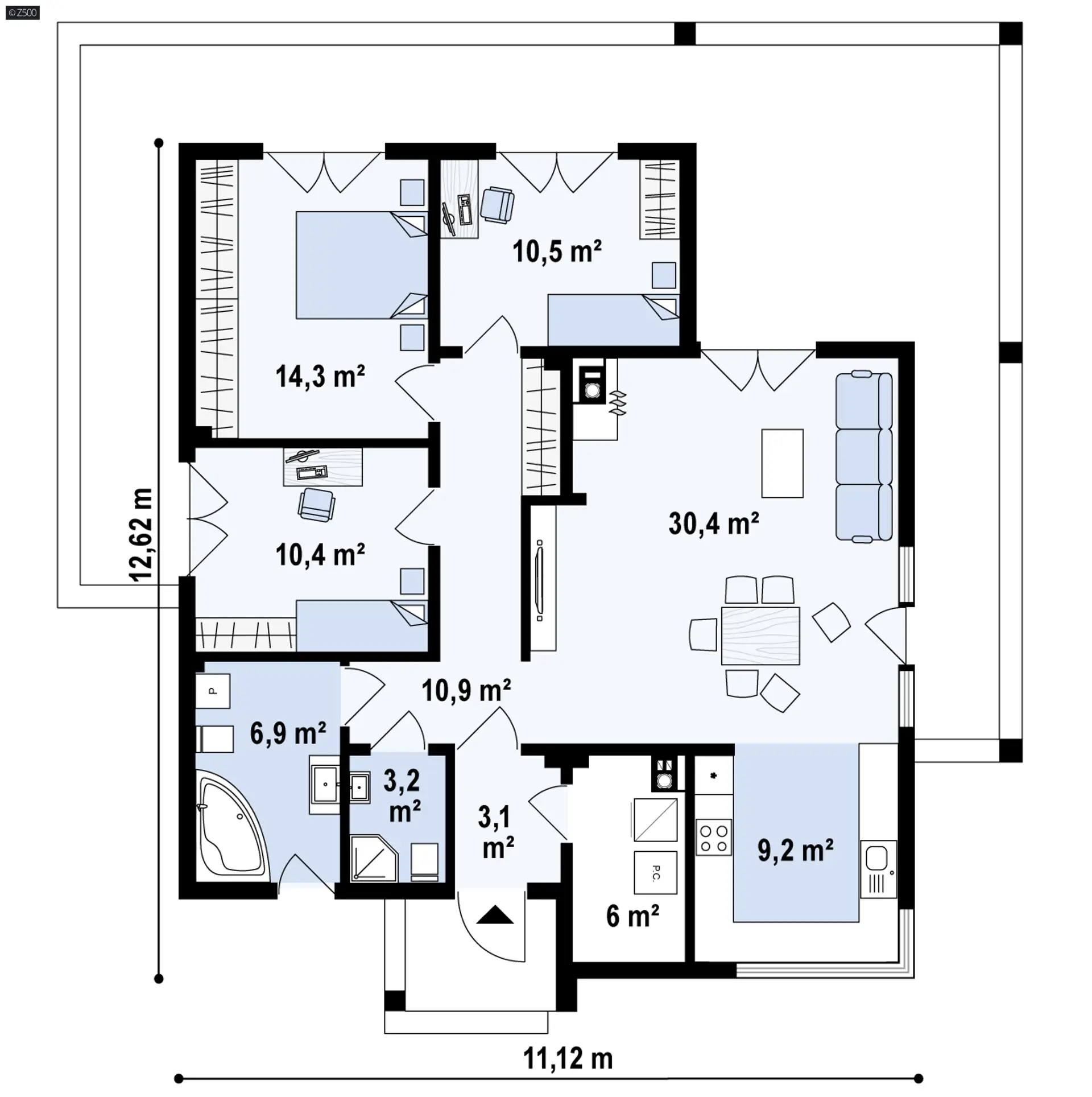 Bez wątpienia jednym z większych atutów jest rozciągający się z trzech stron świata taras okalający cały dom. Na nim pergole w postaci tarasowych żaluzji ozdobnych. Dzięki temu wielbiciele słonecznych kąpieli mogą „ścigać słońce”, od świtu do zmierzchu, przechodząc z jednego tarasu na drugi. Wyjście na zewnątrz prowadzi z każdego pokoju. Duże przeszklenia w postaci okien portfenetrowych znakomicie doświetlają wnętrza. 3 pokoje, z których każdy jest zaprojektowany na planie zbliżonym do kwadratu, dają efekt dużej ich ustawności.