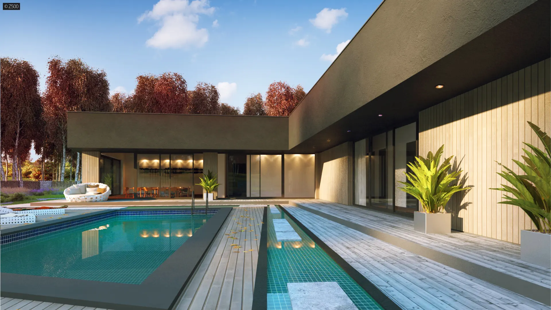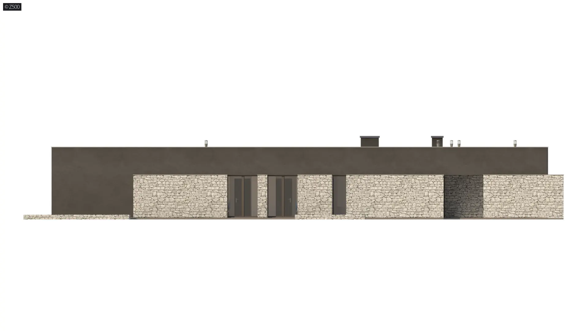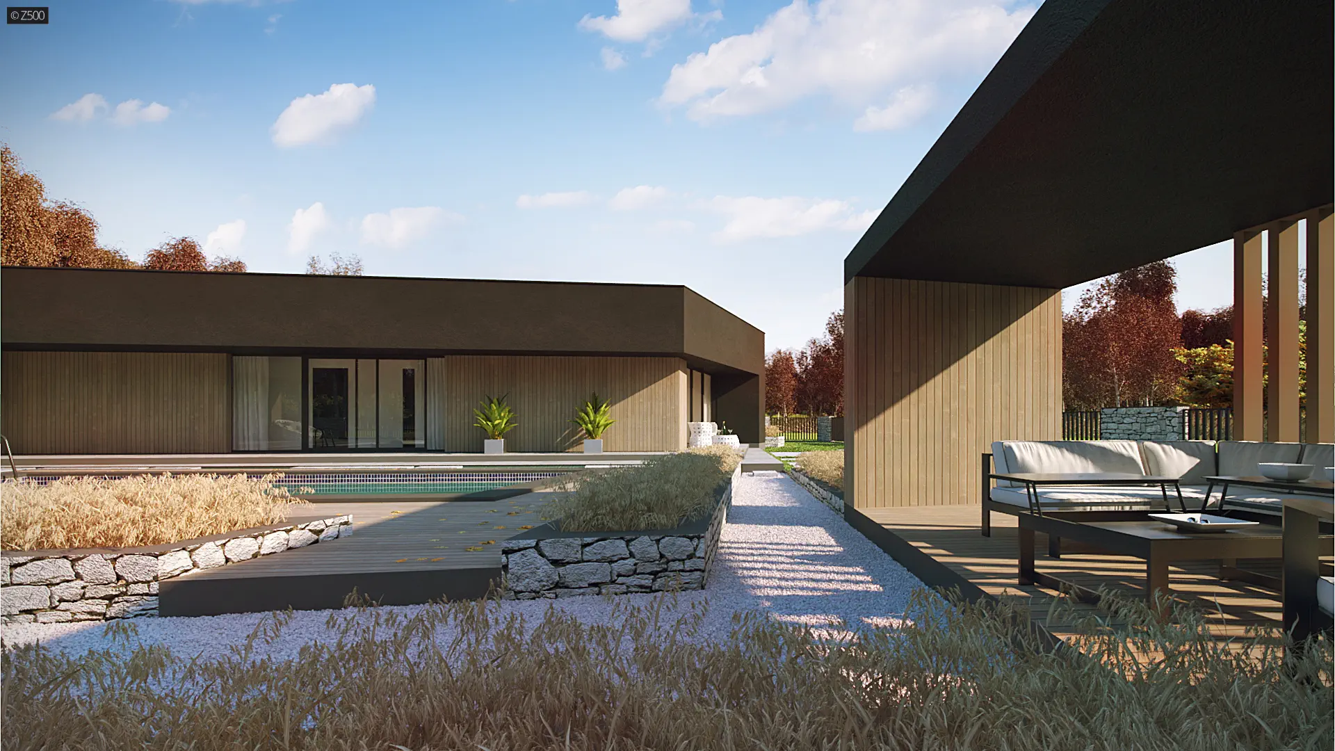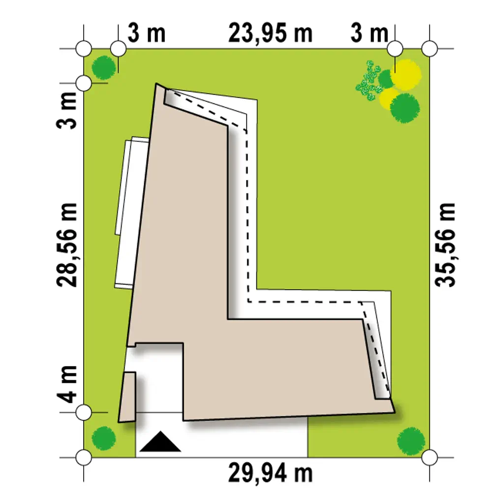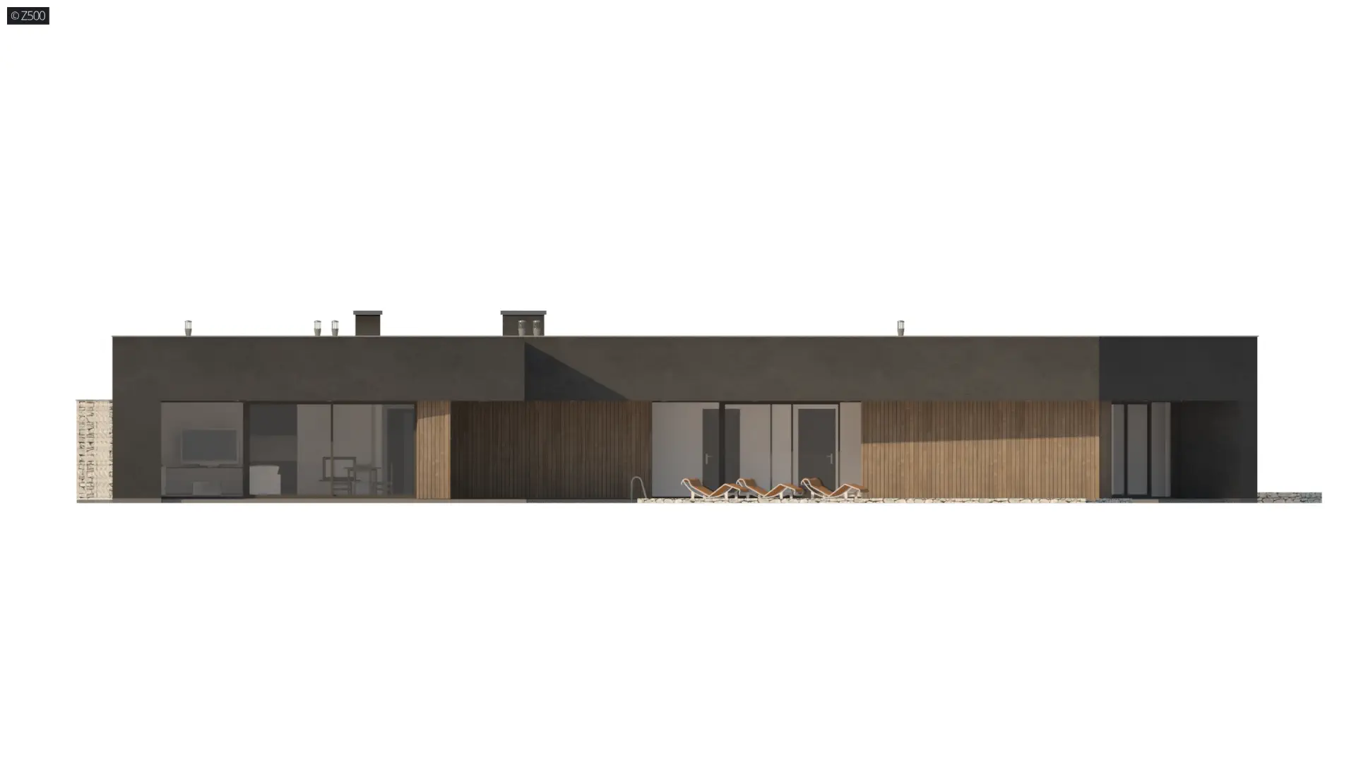 Zx142 to parterowa propozycja nowoczesnego domu w kształcie litery „L”, z płaskim dachem, dużymi przeszkleniami oraz trzema miejscami parkingowymi.