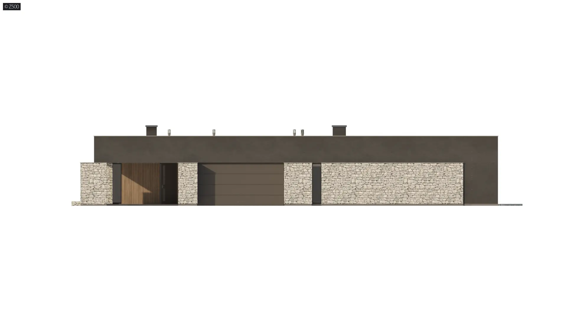 Elewację przyozdobiono kamieniem, drewnem i ciemnym grafitowym tynkiem.