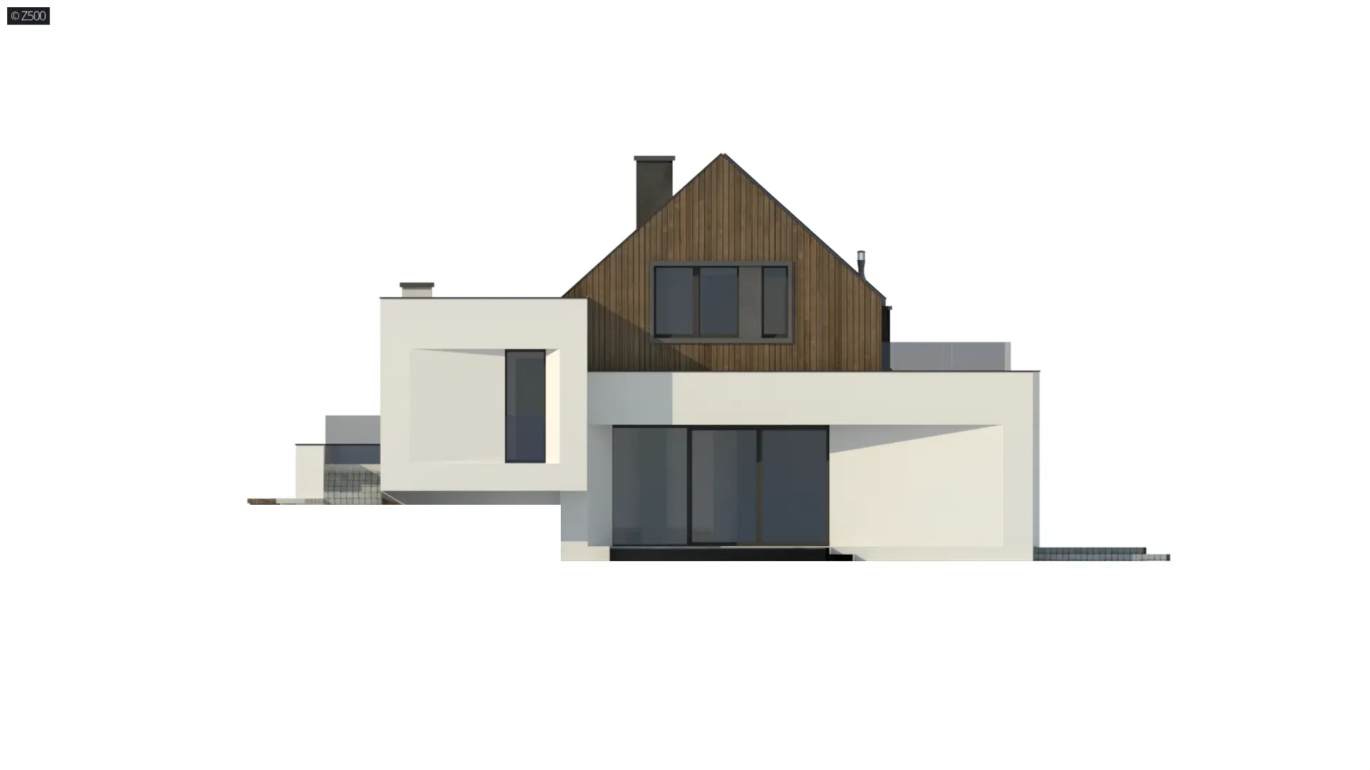 Bryła stanowi połączenie nowoczesności z tradycyjnym dachem dwuspadowym. Jej nowatorska forma została wyrażona w białych, prostopadłościennych formach brył, okalających dom dachem dwuspadowym. Całość podkreślono drewnianą elewacją i śnieżnym, białym tynkiem.