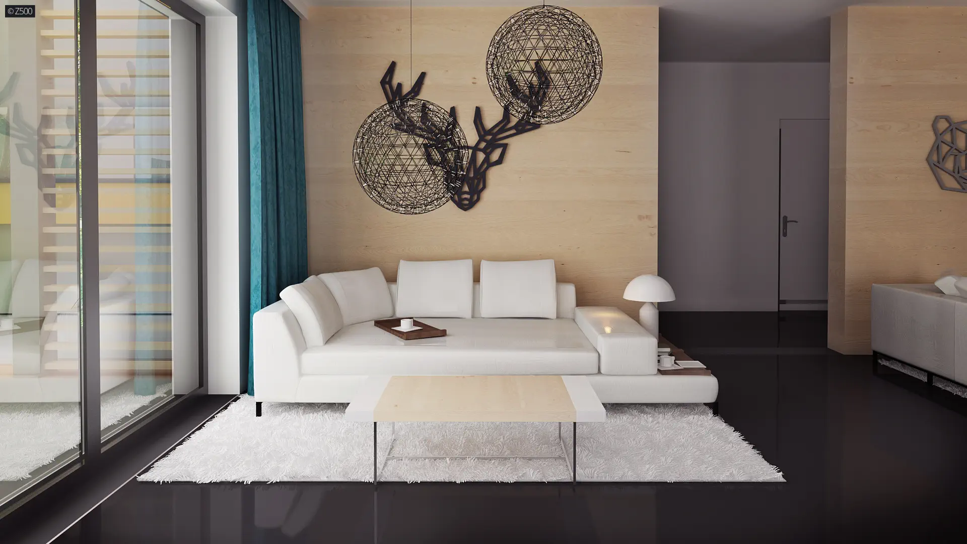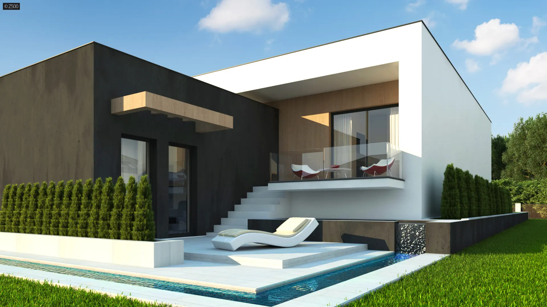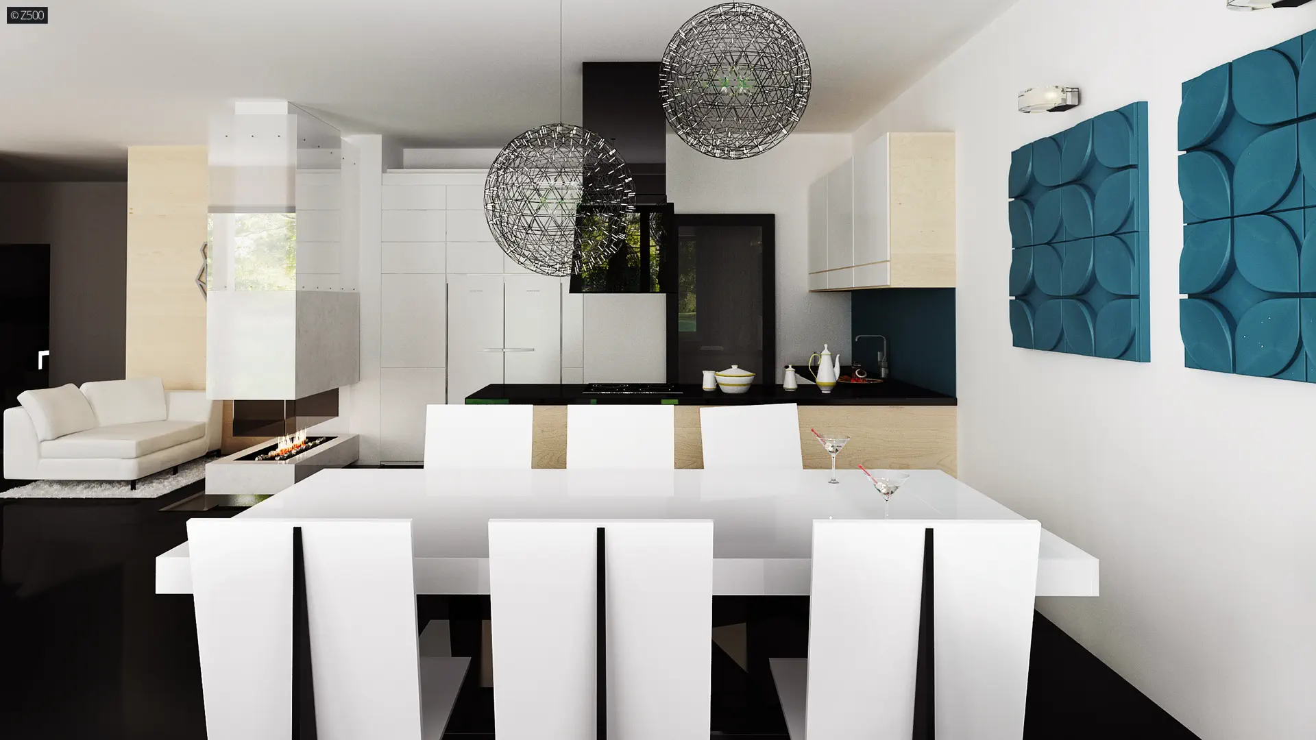 Elewację wykończono w stonowanej kolorystyce dwóch chłodnych barw – bieli i szarości. Ciepła dodaje trzeci odcień – kremowe drewniane elementy ozdabiające elewację. Z każdego pomieszczenia domu, prowadzi wyjście na taras lub balkon, co niewątpliwie stanowi duży atut.