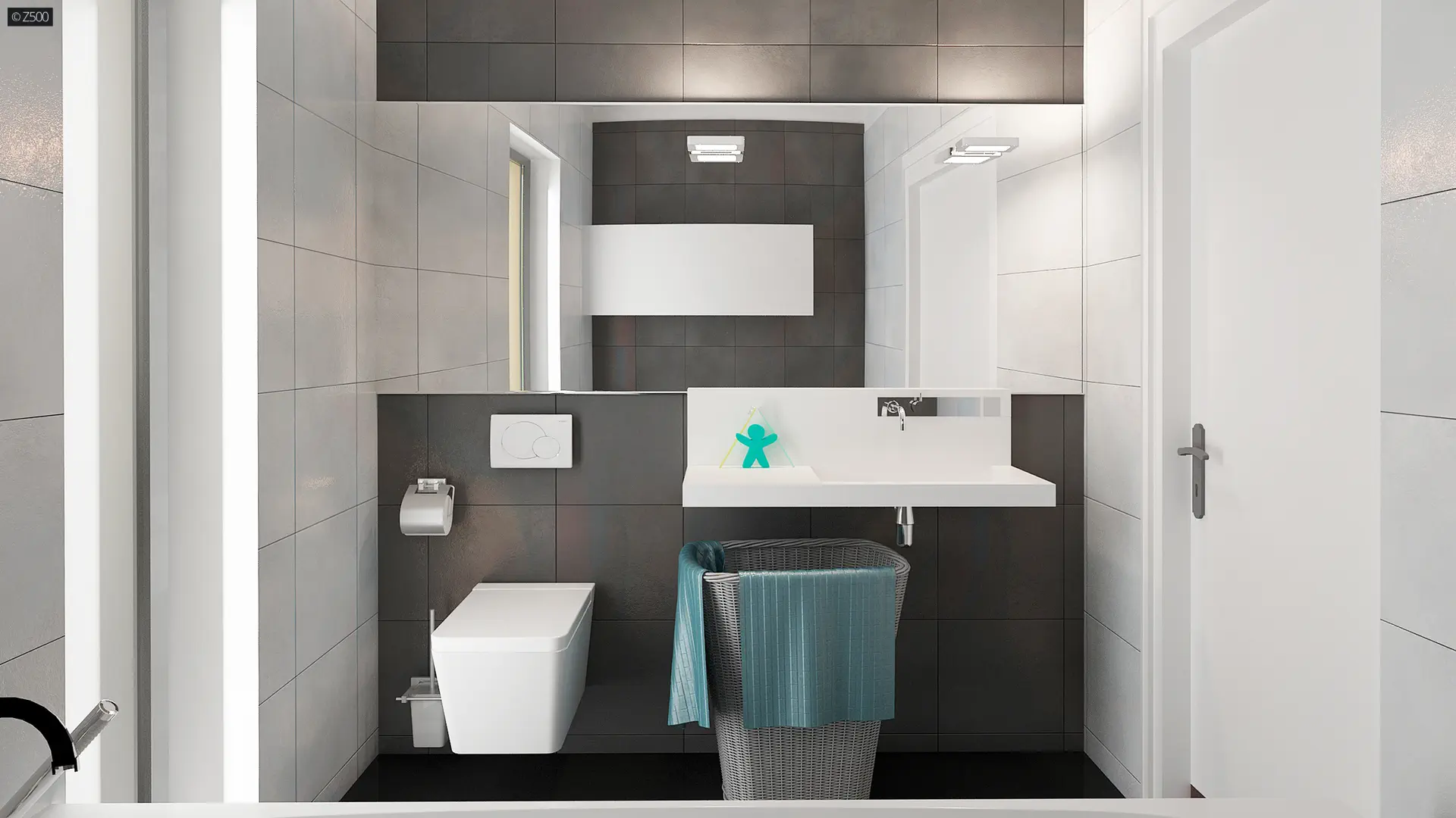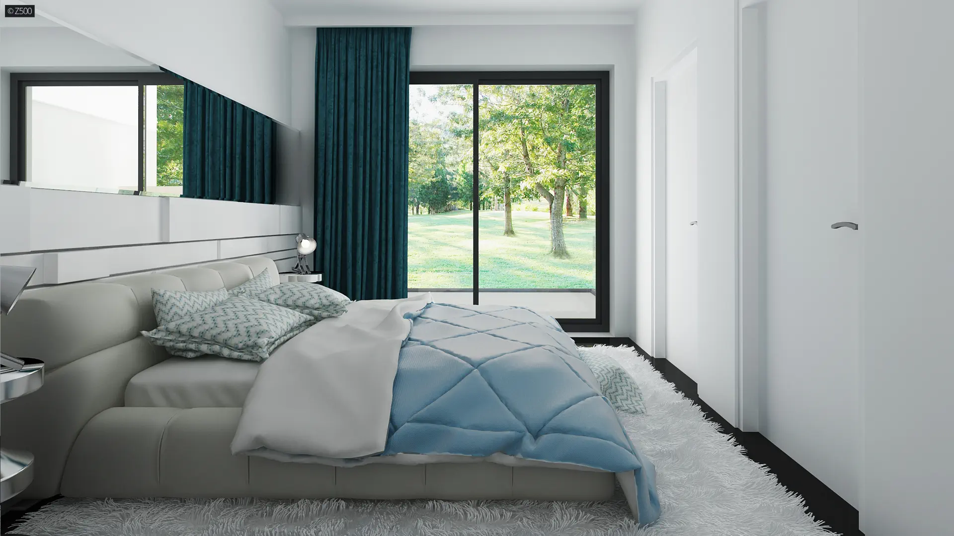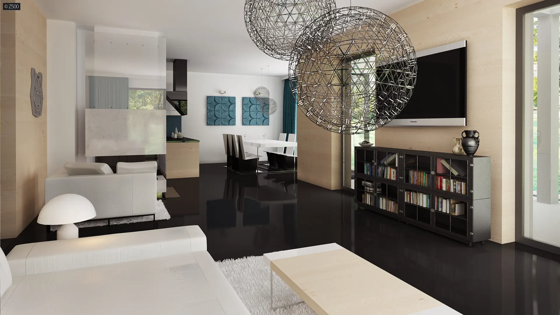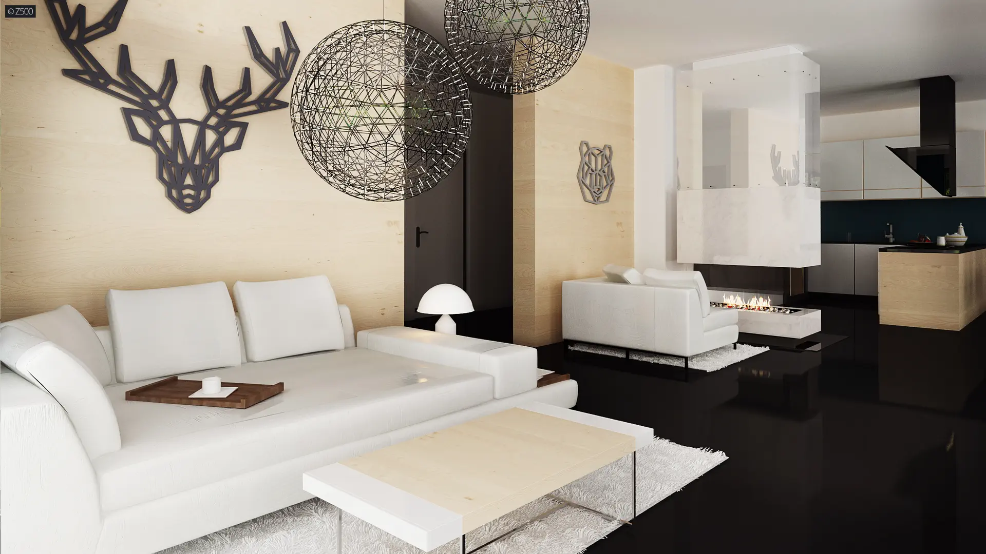 Elewację wykończono w stonowanej kolorystyce dwóch chłodnych barw – bieli i szarości. Ciepła dodaje trzeci odcień – kremowe drewniane elementy ozdabiające elewację. Z każdego pomieszczenia domu, prowadzi wyjście na taras lub balkon, co niewątpliwie stanowi duży atut.