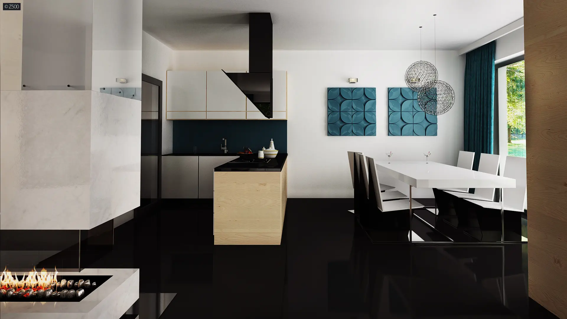 Poziom 0 to strefa dzienna domu. Z ustawnego gabinetu dwoje drzwi prowadzi na taras. Przestronny, widny salon stanowi część reprezentacyjną domu. Ciepły kominek elektryczny rozgranicza aneks kuchenny i część jadalną od pięknie urządzonego salonu.