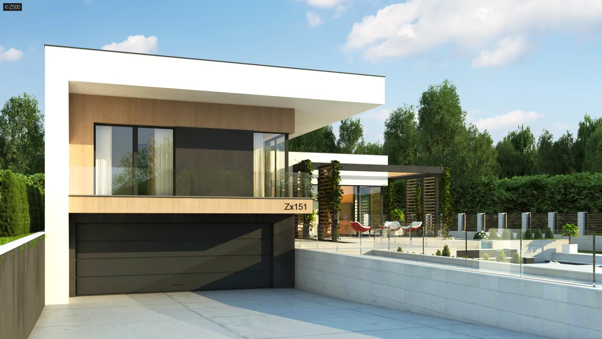 Zx151 stanowi propozycję nowoczesnego domu z płaskim dachem, dużymi przeszkleniami, częściowym podpiwniczeniem i półpiętrami.
