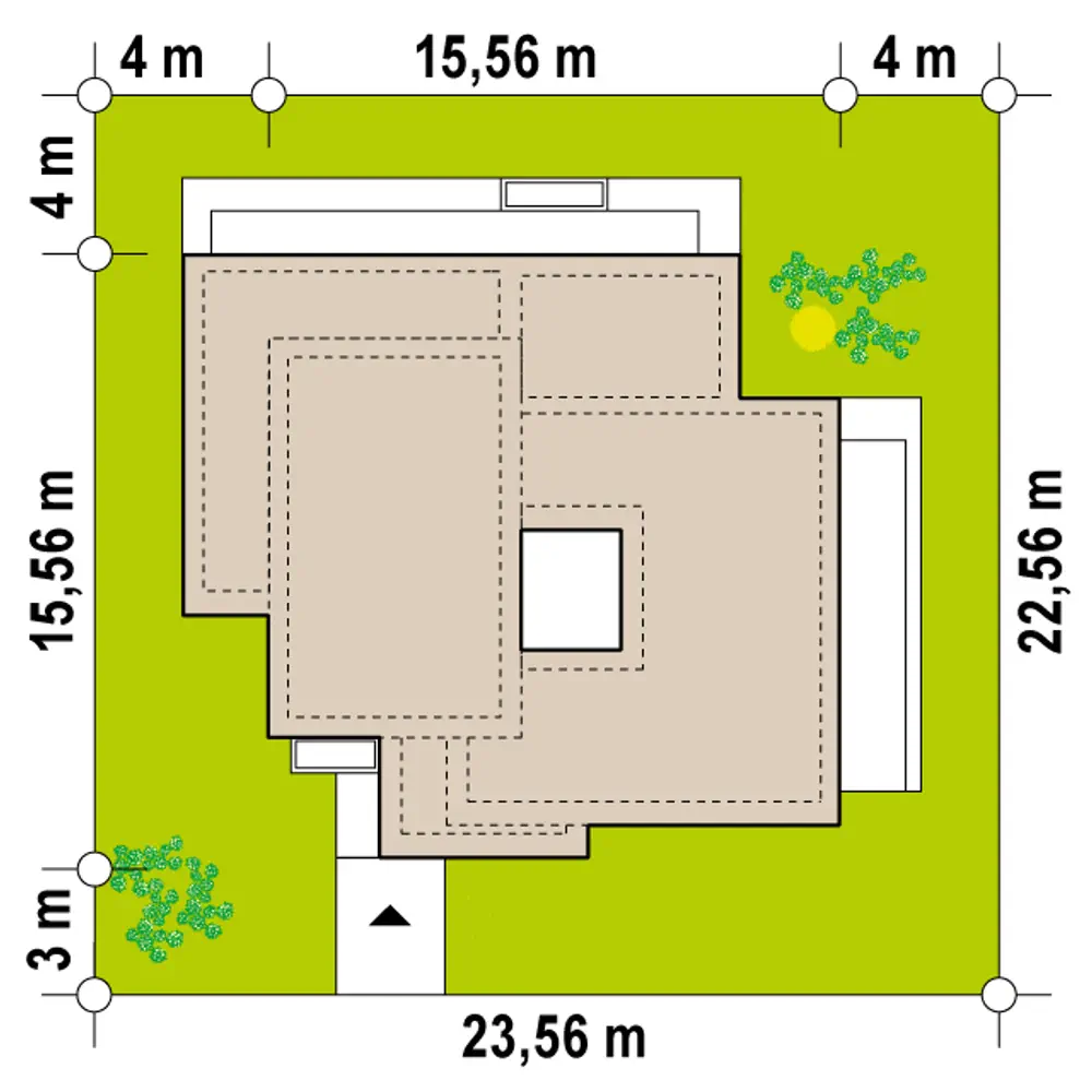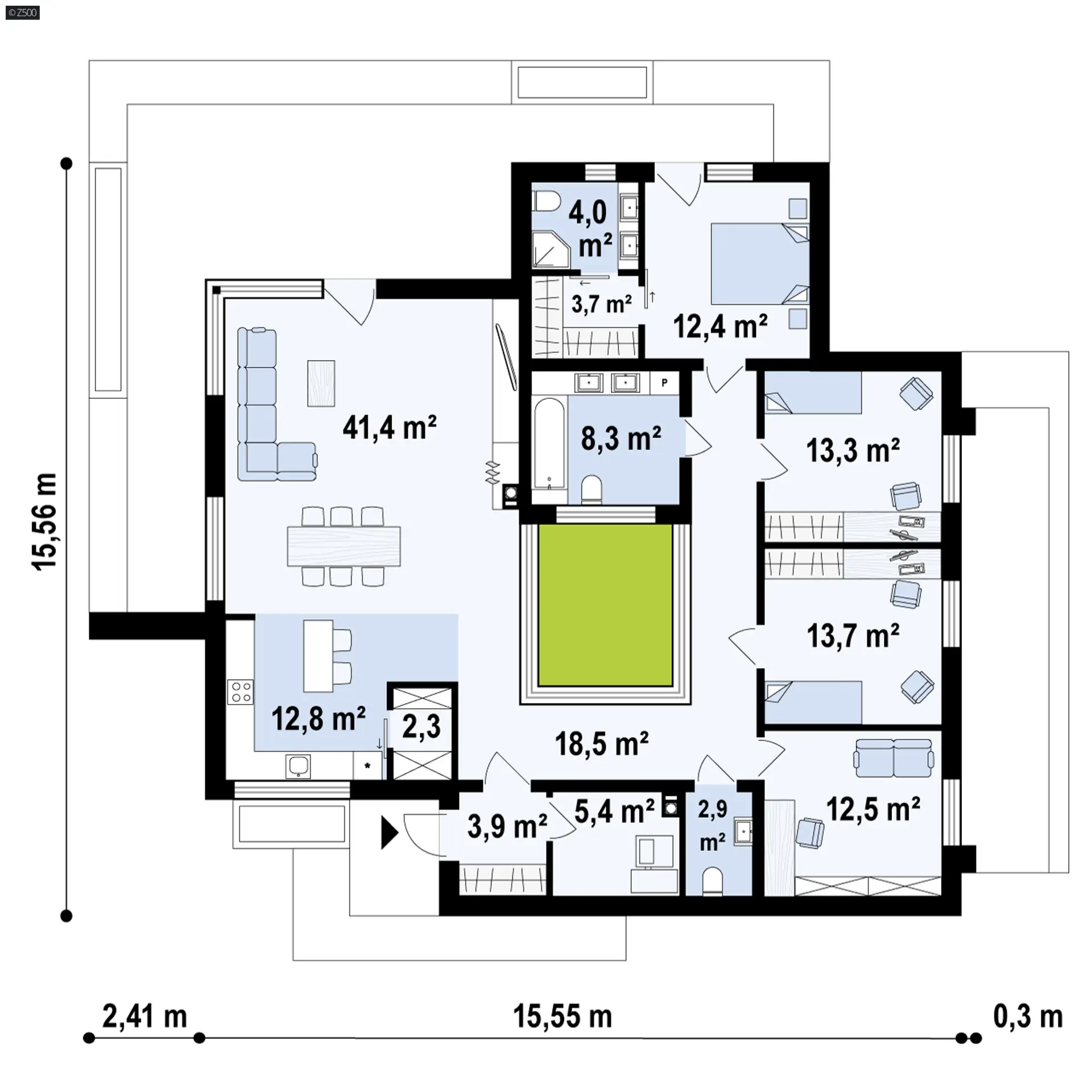 Nowoczesny dom parterowy z 4 sypialniami oraz patio wewnątrz.