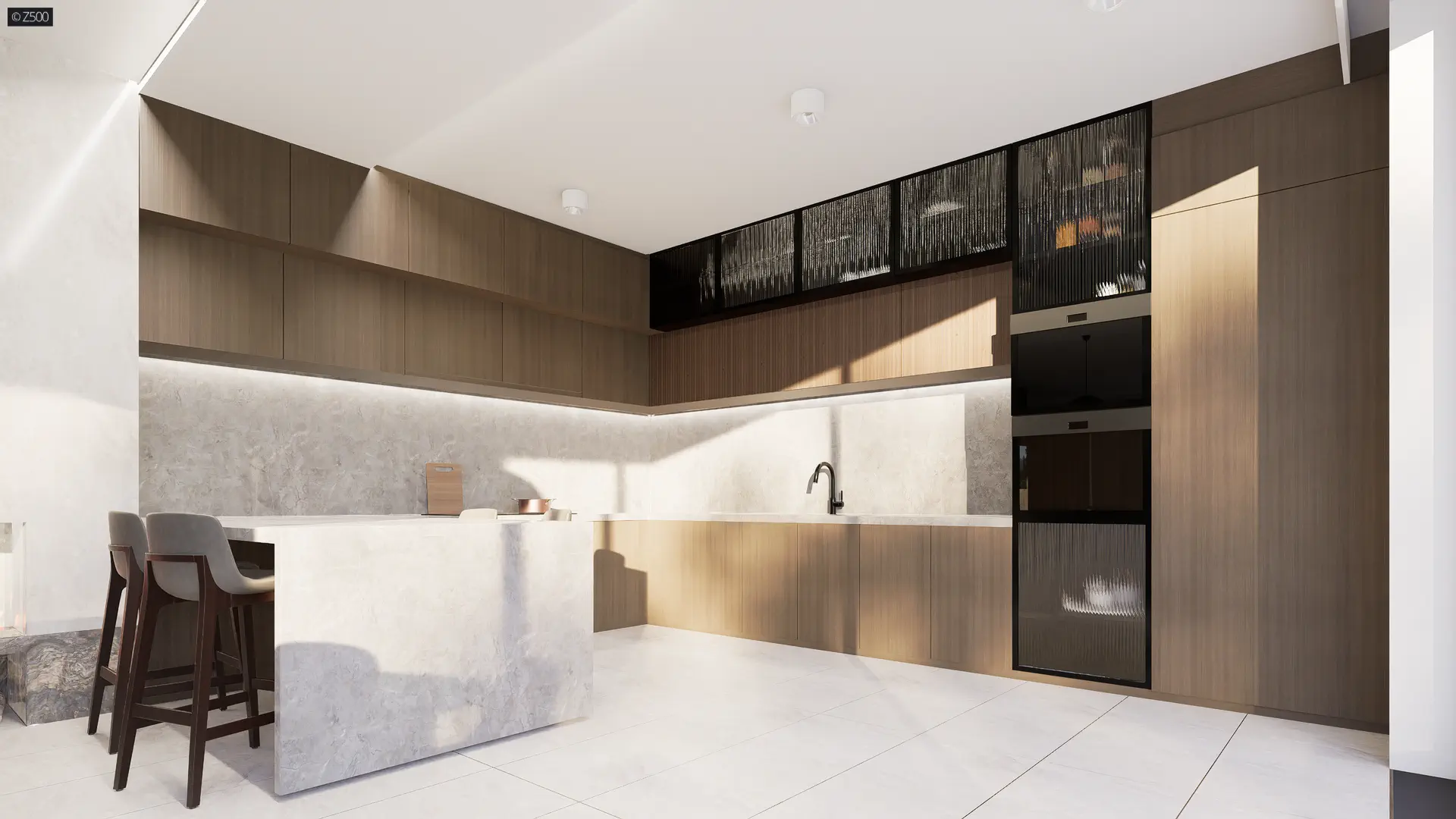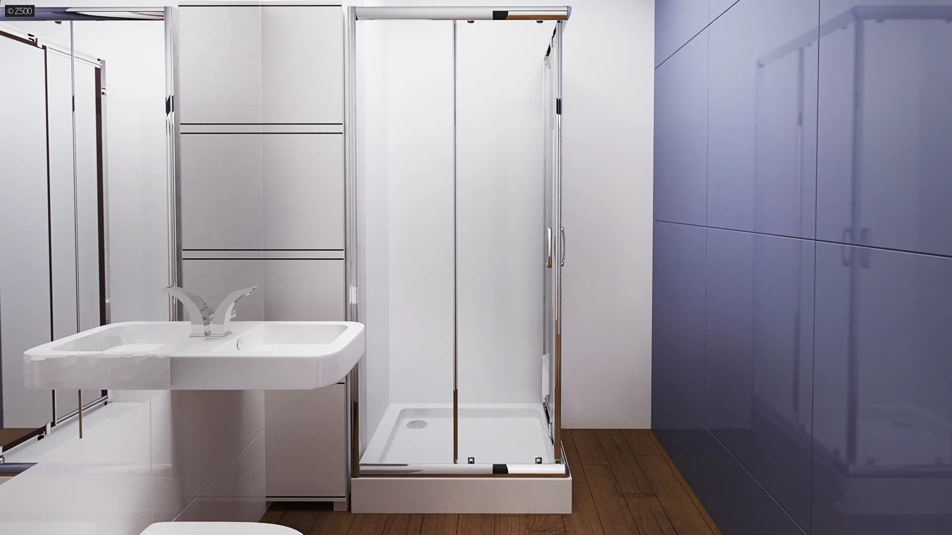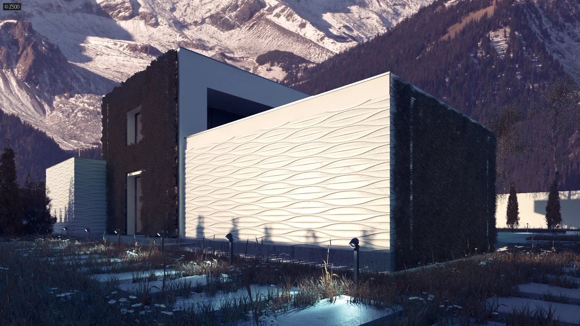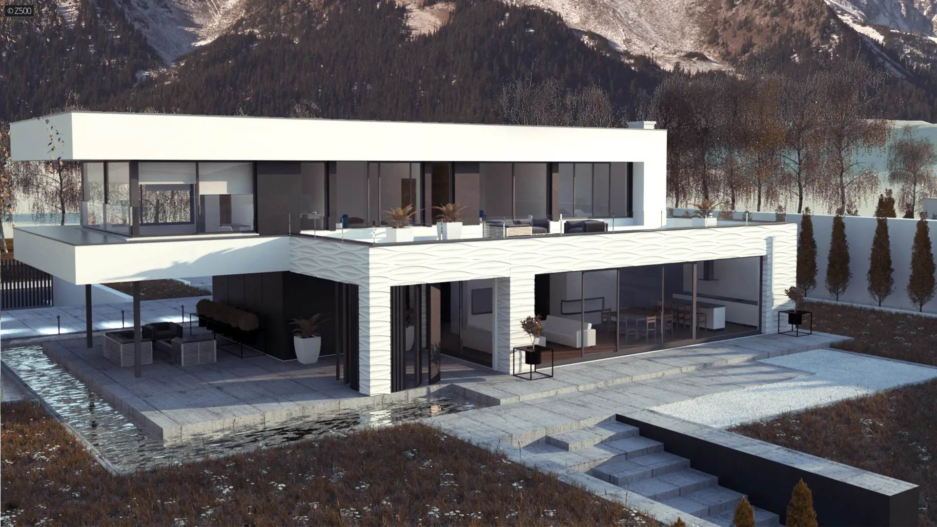 Zx154 to przestronny nowoczesny dom dla wymagających. Elewacja budynku została zaprojektowana w chłodnej bieli oraz ciemnym, grafitowym tynkiem umieszczonym we wnękach. W całym domu zastosowano duże przeszklenia. Nie zapomniano o zadaszeniu wejścia jak i tarasów. W projekcie zastosowano stropodachy oraz pokazano możliwość zrobienia zielonej elewacji. Dom ma być nowoczesny, praktyczny ale również przyjazny środowisku.