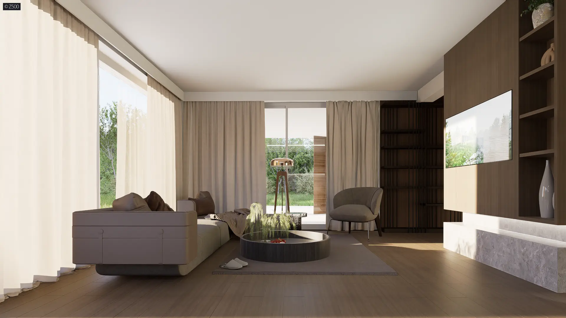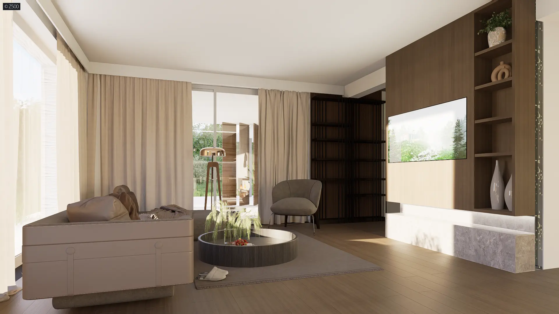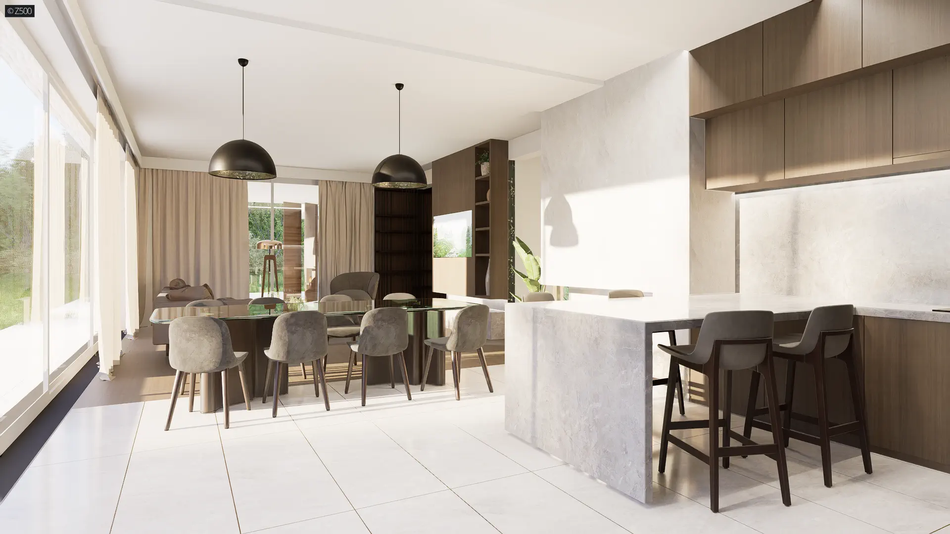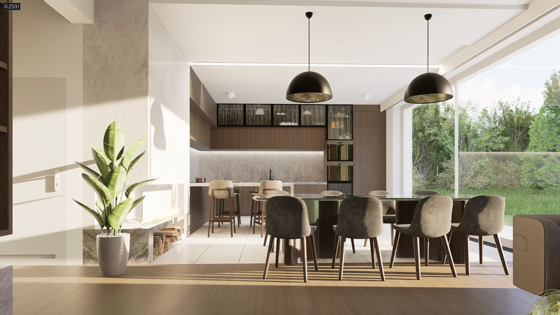 W parterze zaprojektowano otwartą część dzienną przeszkloną na ogród. Lewe skrzydło to garaż na dwa samochody i pomieszczenie gospodarcze. Znalazło się tu również miejsce na sypialnię z garderobą oraz łazienką. Może pełnić rolę sypialni głównej, miejsca dla starszych rodziców, którzy z nami mieszkają lub części mieszkalnej dla służby. Przy salonie, wytyczono pomieszczenie rekreacyjne. Ze względu na potrzeby może pełnić funkcję biblioteki, gabinetu czy pokoju zabaw np. bilard.