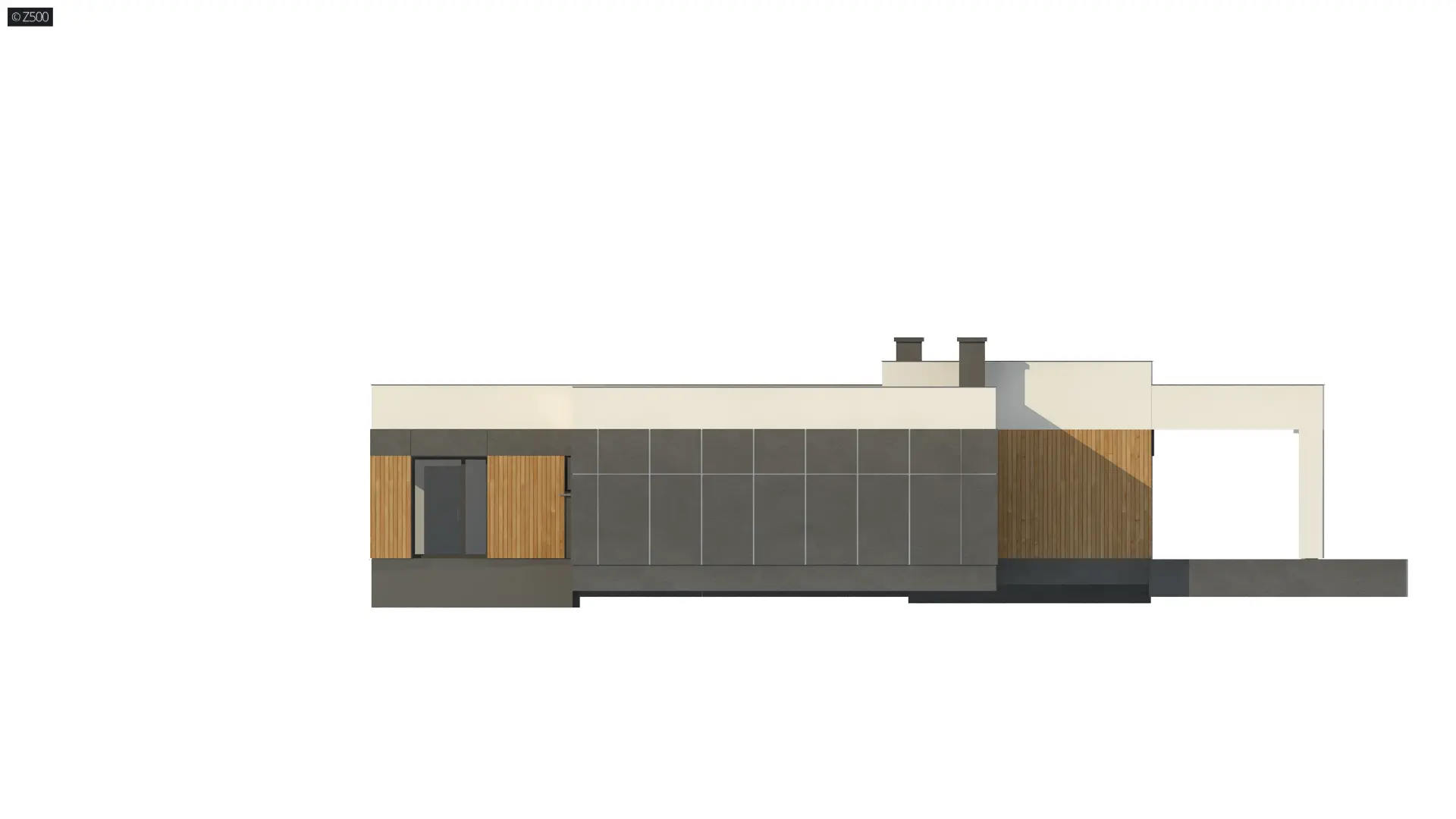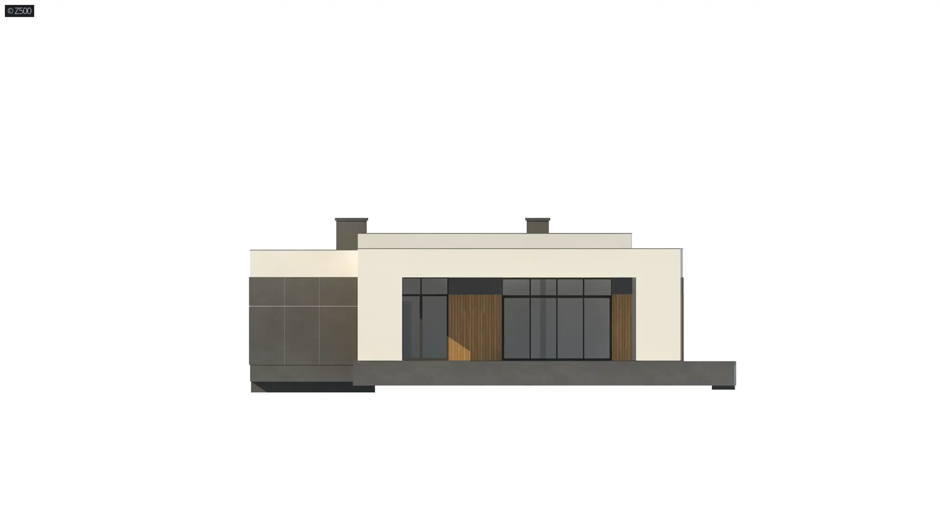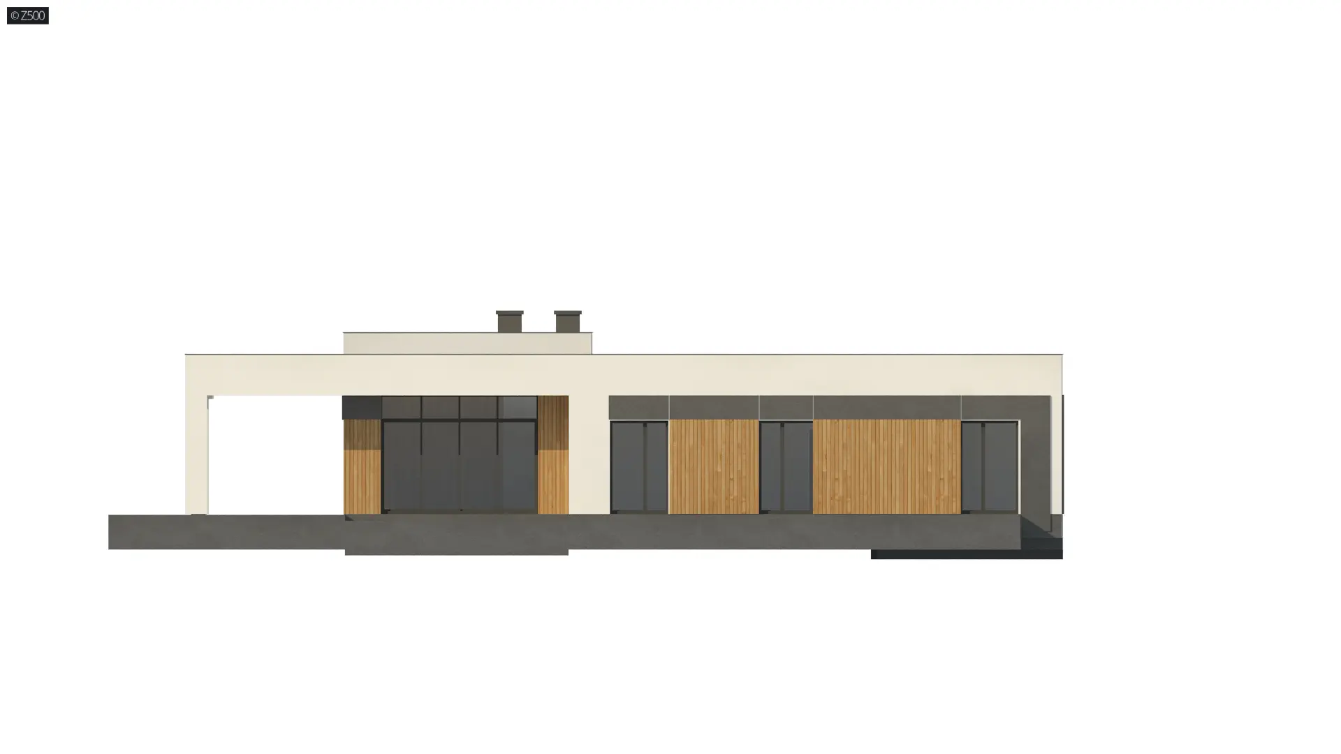 Parterowy, nowoczesny dom z płaskim dachem, z garażem jednostanowiskowym i odwróconym układem pomieszczeń, gdzie sypialnie rozplanowano w skrzydle od frontu. Elewację wykończono w bieli, szarościach oraz drewnie.