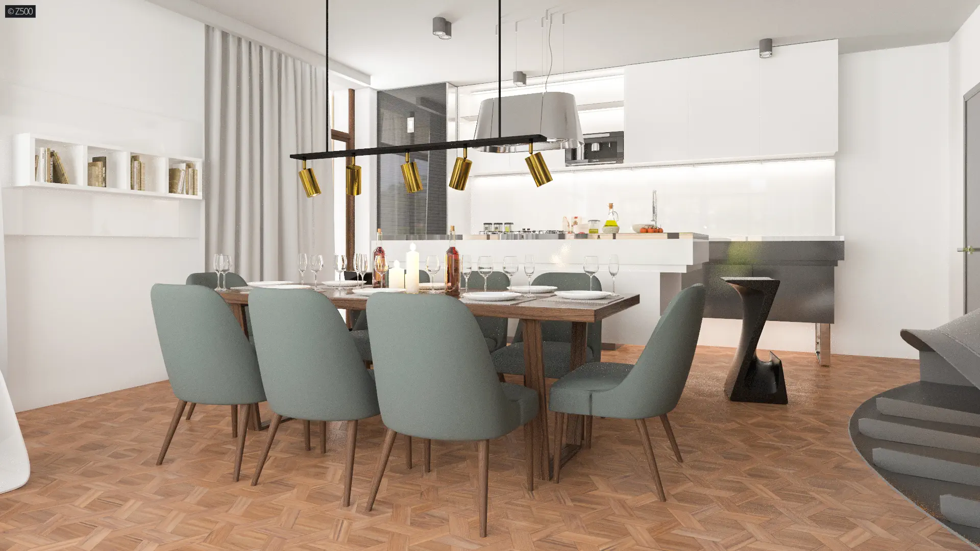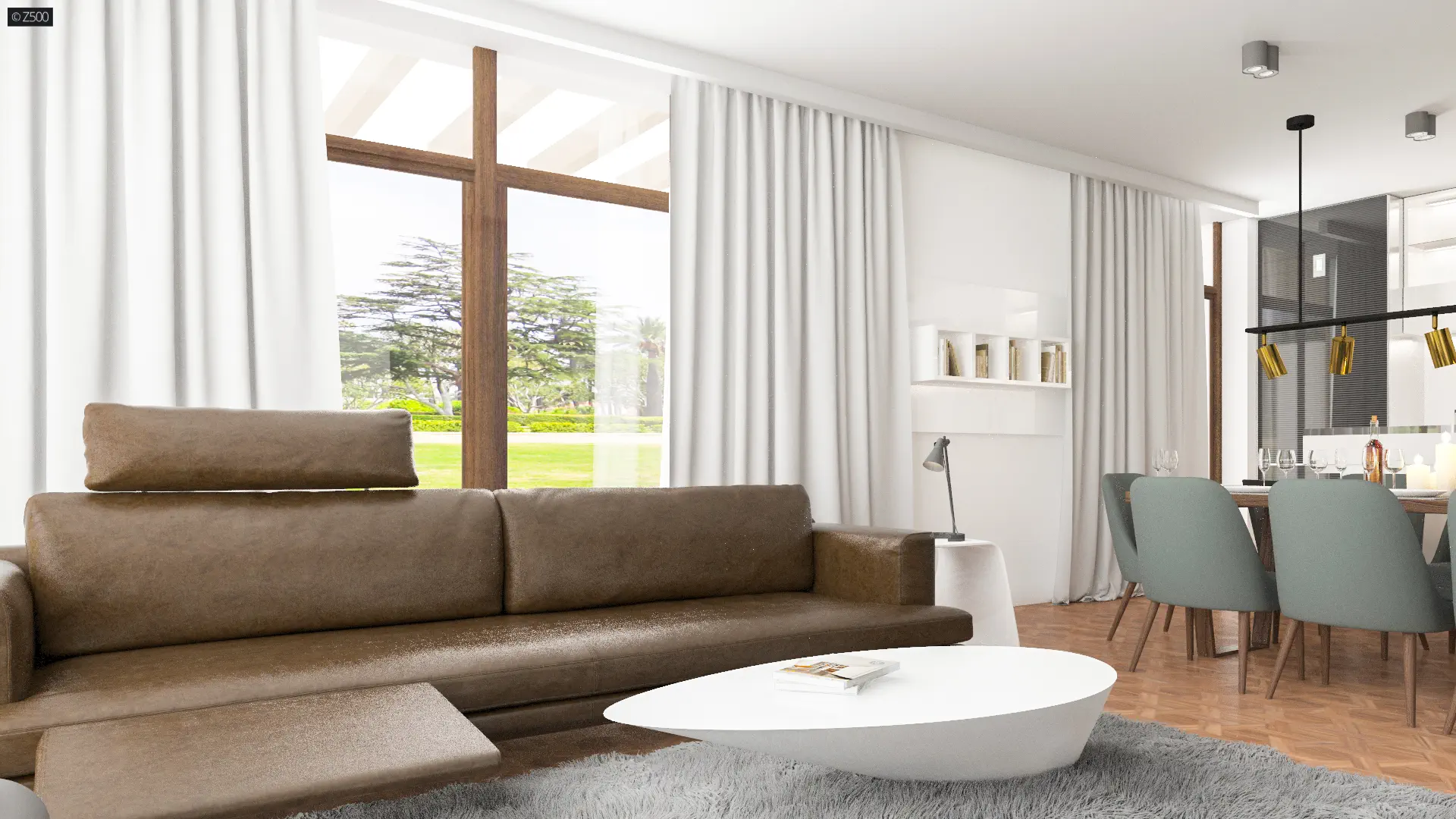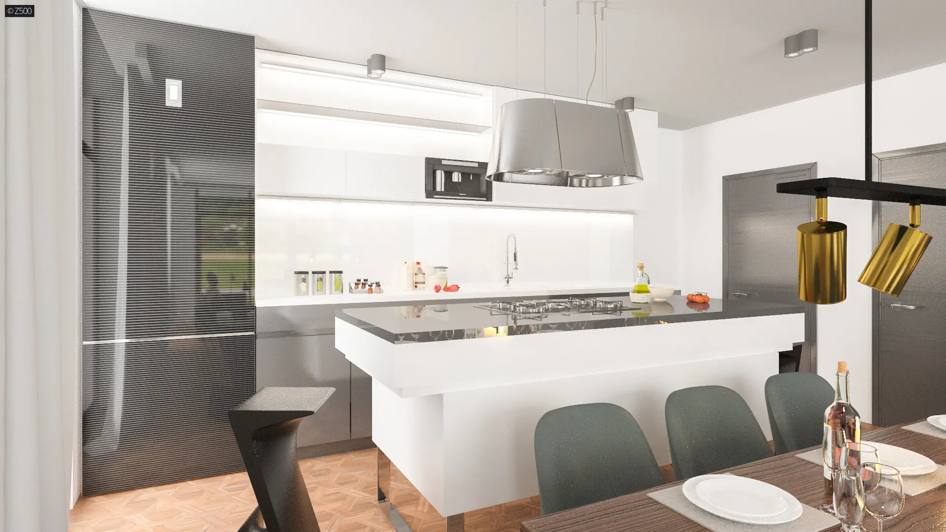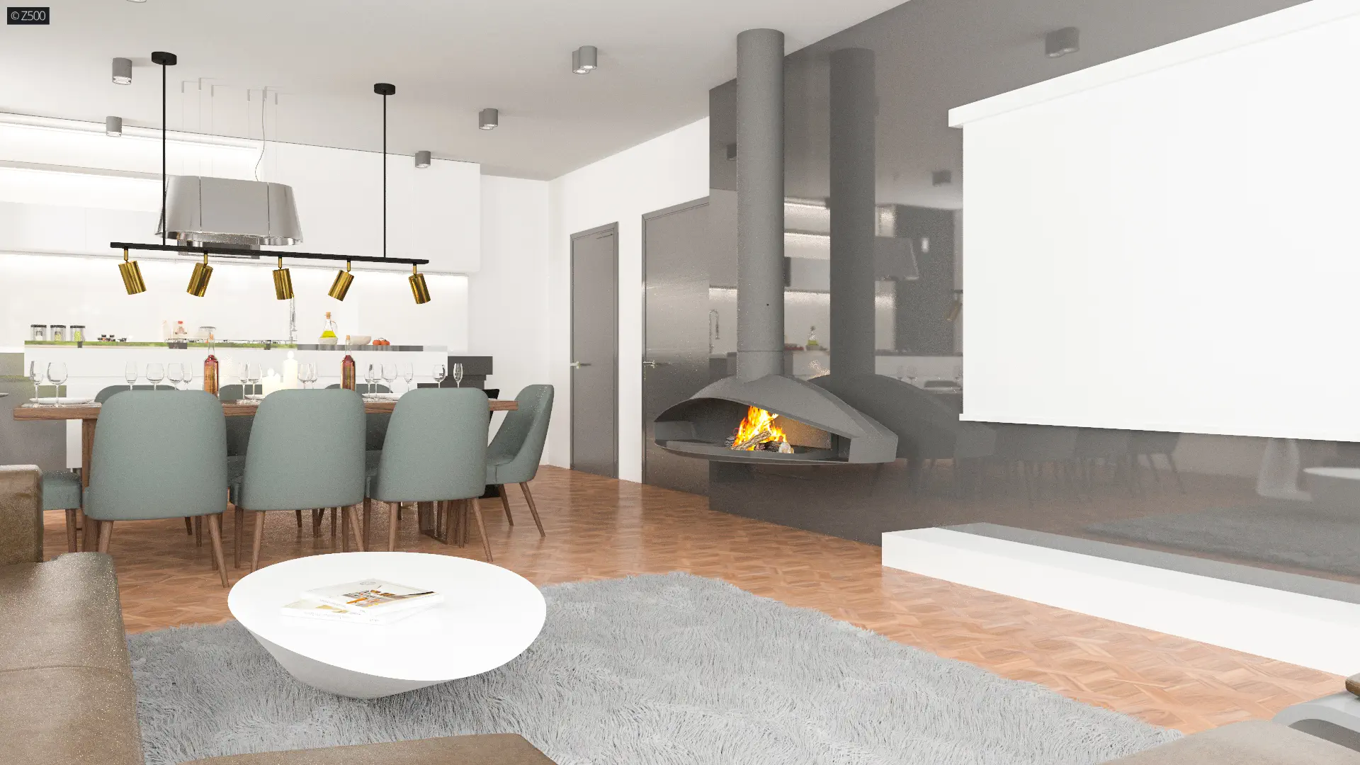 Wejście do domu zostało umieszczone w centralnej części budynku. Z sieni wejście prowadzi do holu, który jest ogniwem łączącym dzienną i nocną część domu. Dwuskrzydłowe drzwi prowadzą do gustownie urządzonego salonu połączonego z jadalnią i aneksem kuchennym. Wyspę kuchenną doceni każda osoba lubująca się w przyrządzaniu rozmaitych posiłków. Kominek, strzegący ciepła domowego ogniska, umieszczono w optymalnym miejscu, gromadzącym domowników. Przeszklona ściana przesuwna daje możliwość powiększenia przestrzeni salonowej o część tarasową. To idealne miejsce na urządzenie pierwszego, wiosennego grilla, podejmowanie gości i spędzanie czasu wolnego z rodziną.