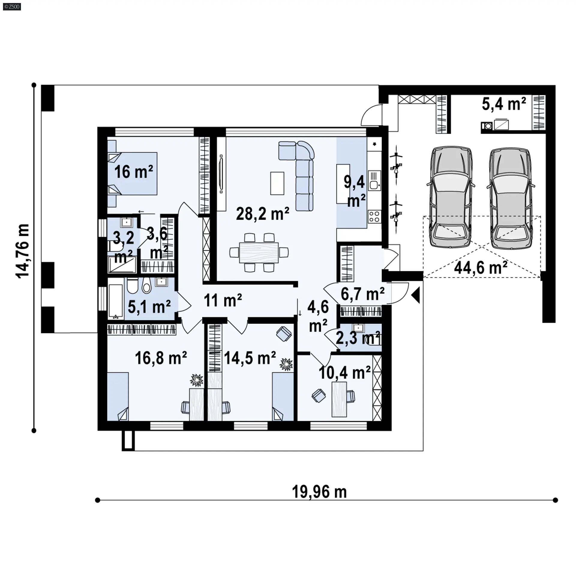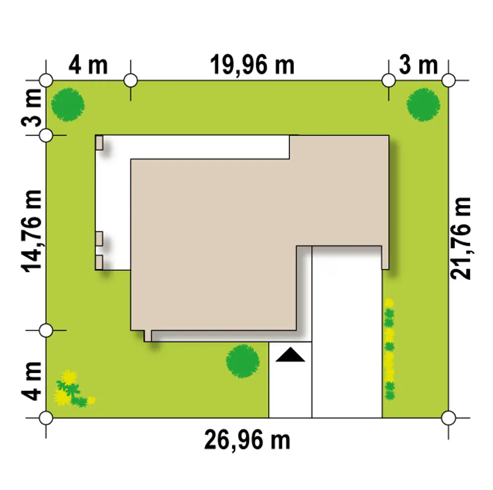 Dom parterowy z 3 pokojami oraz strefą dzienną i garażem 2 stanowiskowym.