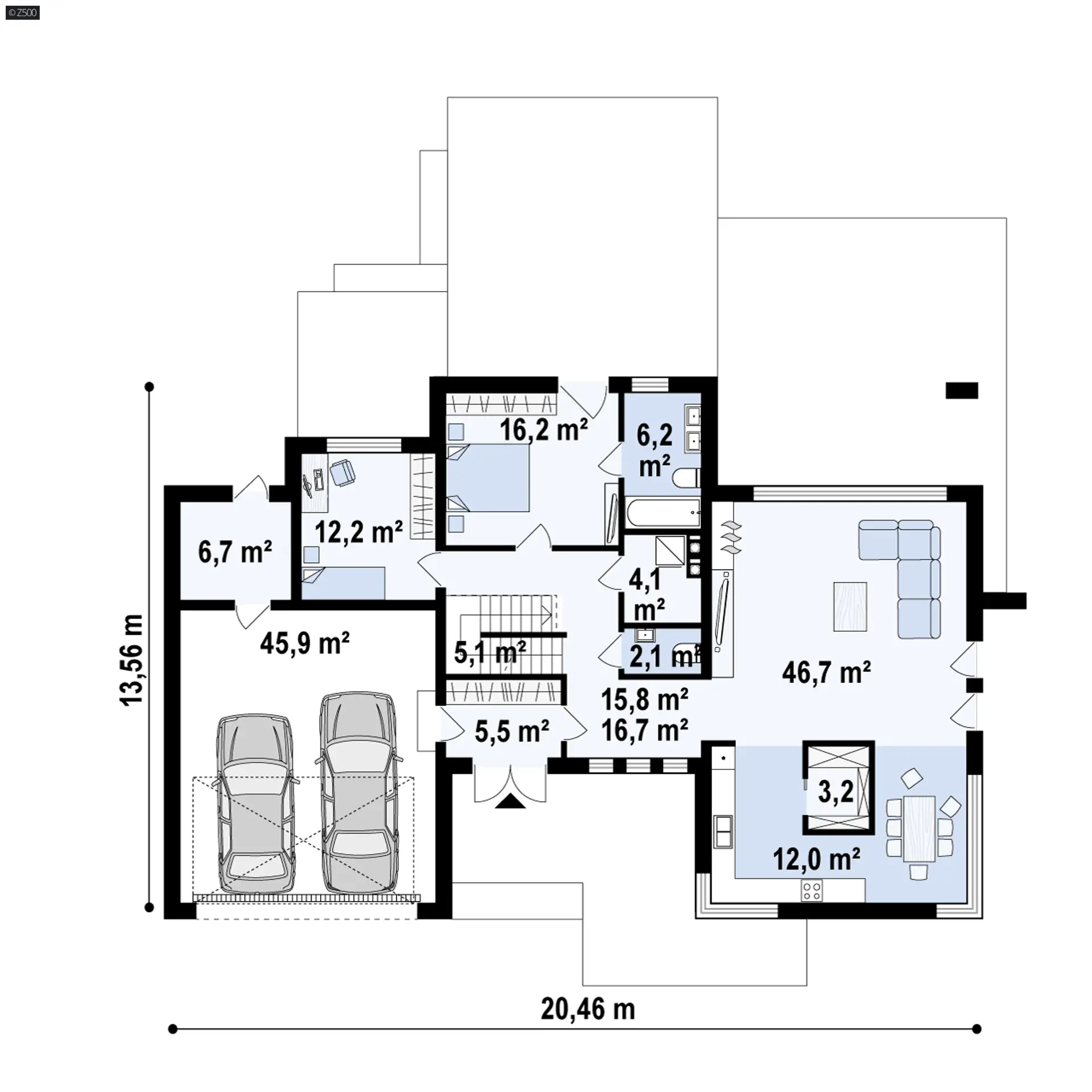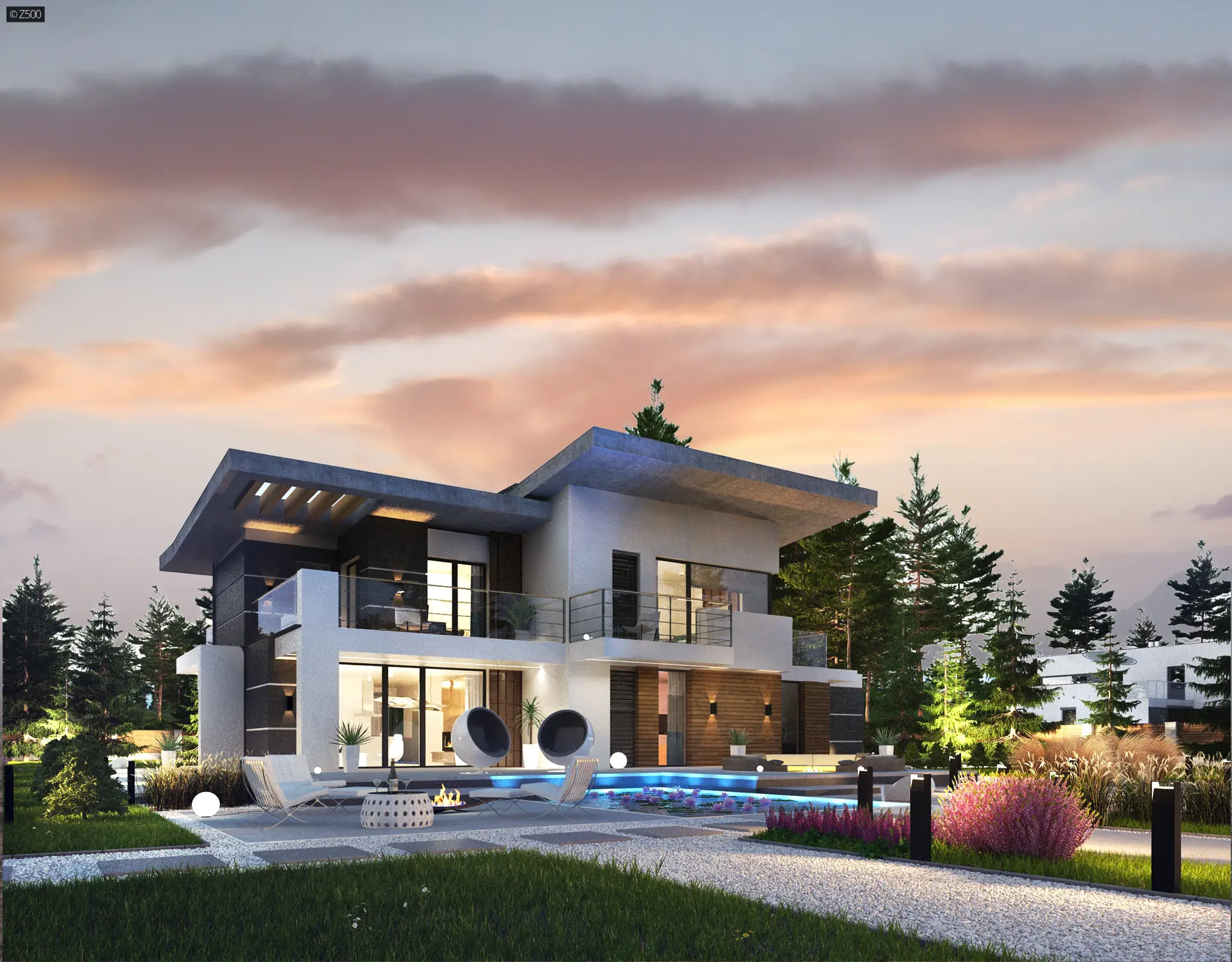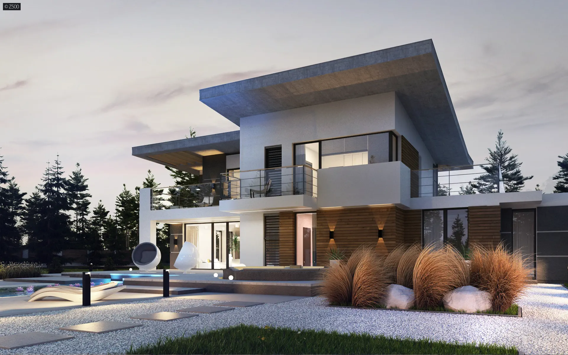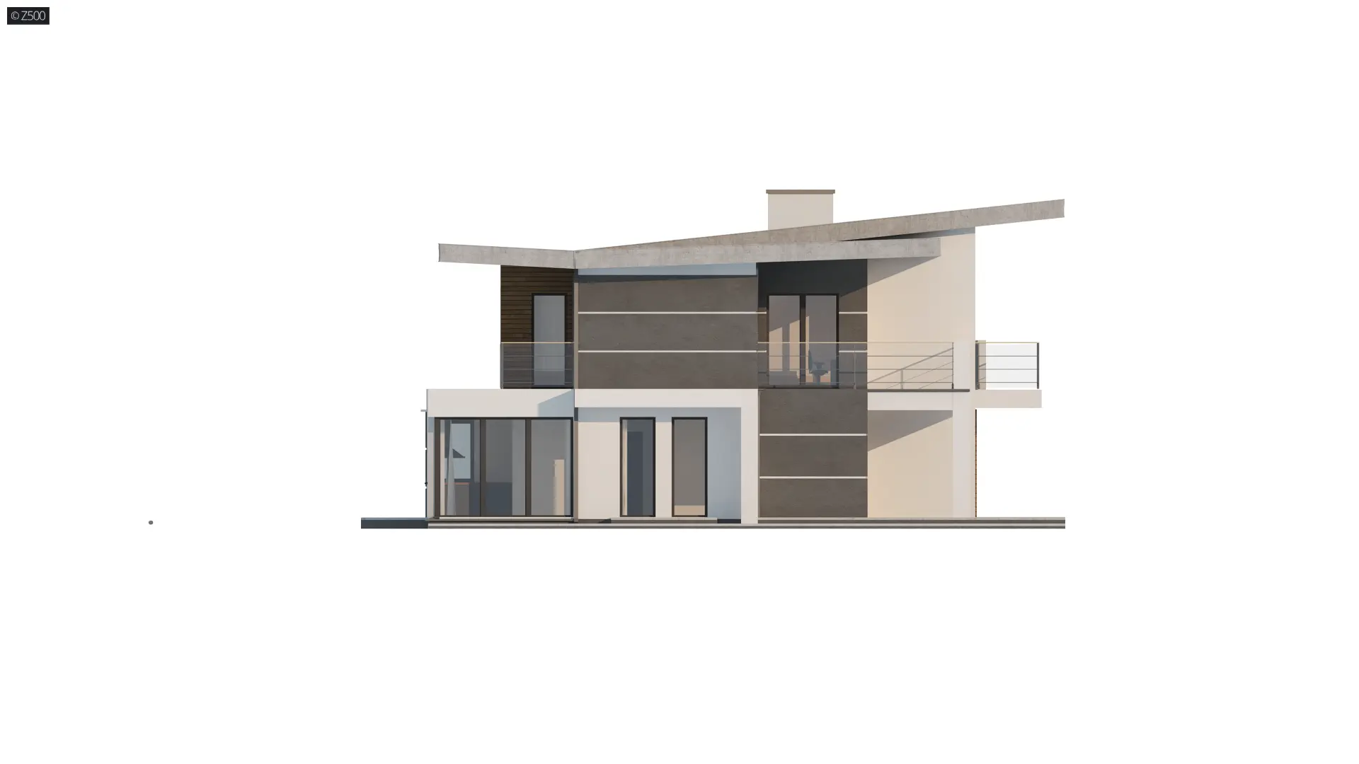 Nowoczesny piętrowy dom z garażem oraz tarasem, sypialnia na parterze z łazienką