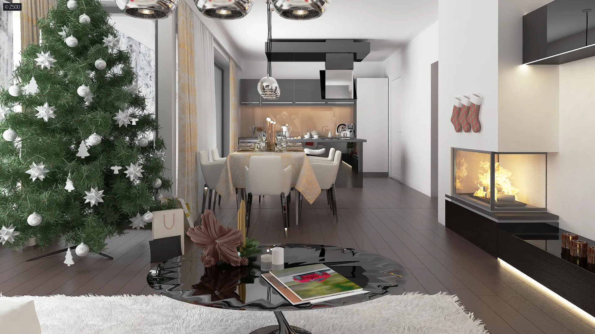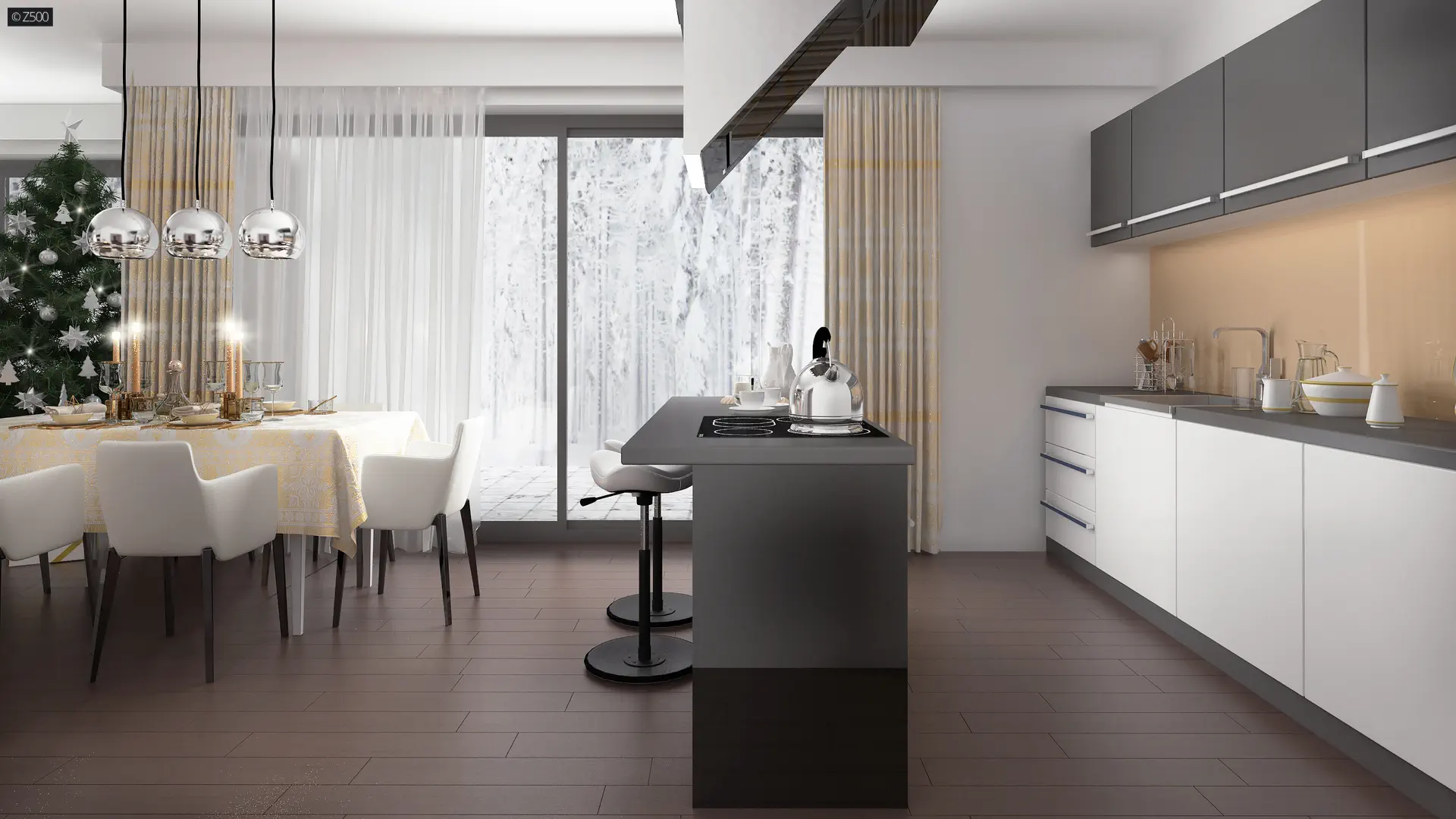 Na parterze znajduje się część dzienna z gabinetem, dwustanowiskowy garaż i pomieszczenia gospodarcze. Salon z jadalnią oraz kuchnia znajdują się od strony ogrodowej i są doświetlone całkowicie przeszkloną ścianą z drzwiami przesuwnymi na taras. Układ kuchni jest bardzo ergonomiczny i wygodny. Dodatkowe przejście przez spiżarnię do garażu ułatwi wniesienie zakupów do domu. Centralne usytuowanie kominka pozwoli na maksymalne zmniejszenie strat ciepła i dodatkowo ogrzeje pomieszczenia na parterze i piętrze.