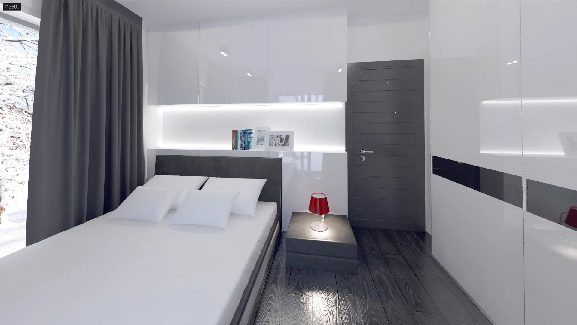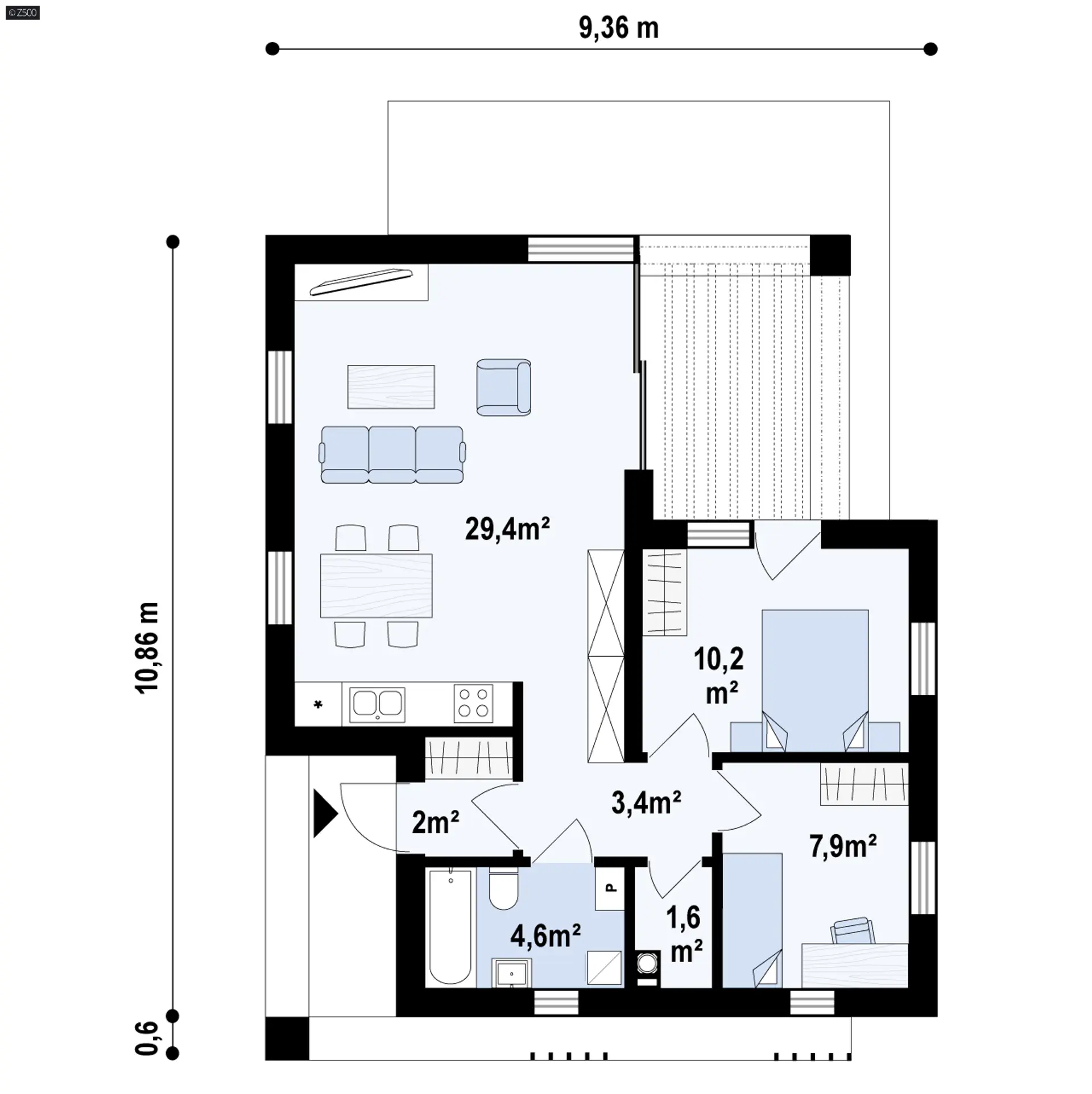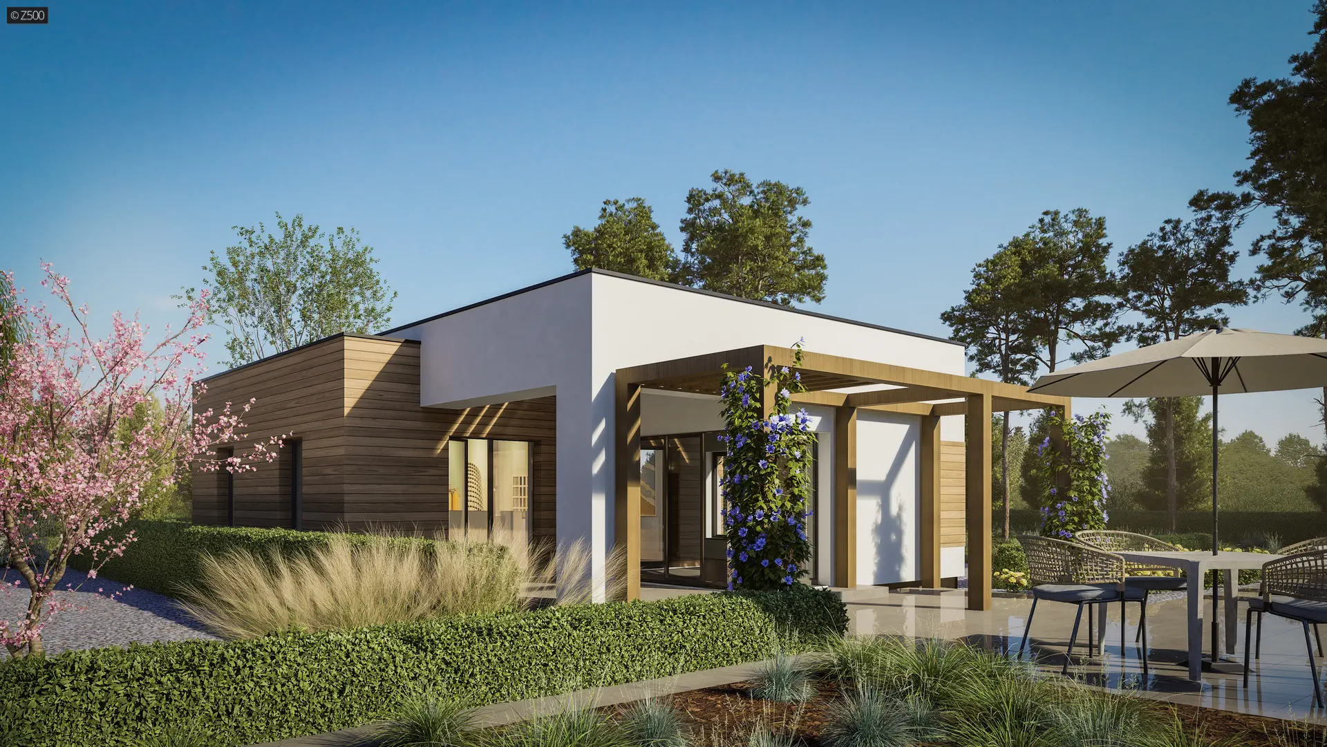Zx256 to propozycja niewielkiego, parterowego domu w technologii murowanej. Nowoczesna bryła z dachem płaskim jest podkreślona poprzez niewielkie nadwieszenia, tarasy i duże przeszklenia. Elewacja jest częściowo pokryta eleganckim, ponadczasowym kamieniem.
