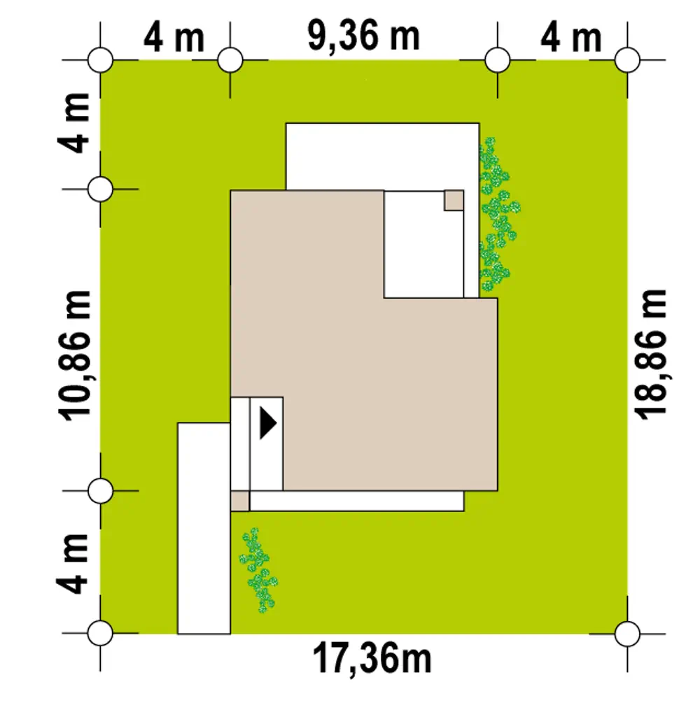 Budynek posiada wejście w bocznej elewacji i jest idealny na wąską działkę. Pomimo małej powierzchni, w domu zaprojektowano przestronny salon, aneks kuchenny z miejscem na stół jadalny, 2 sypialnie, schowek i łazienkę. Wyraźnie wydzielona część dzienna i jedna z sypialni posiadają otwarcie na taras i ogród.