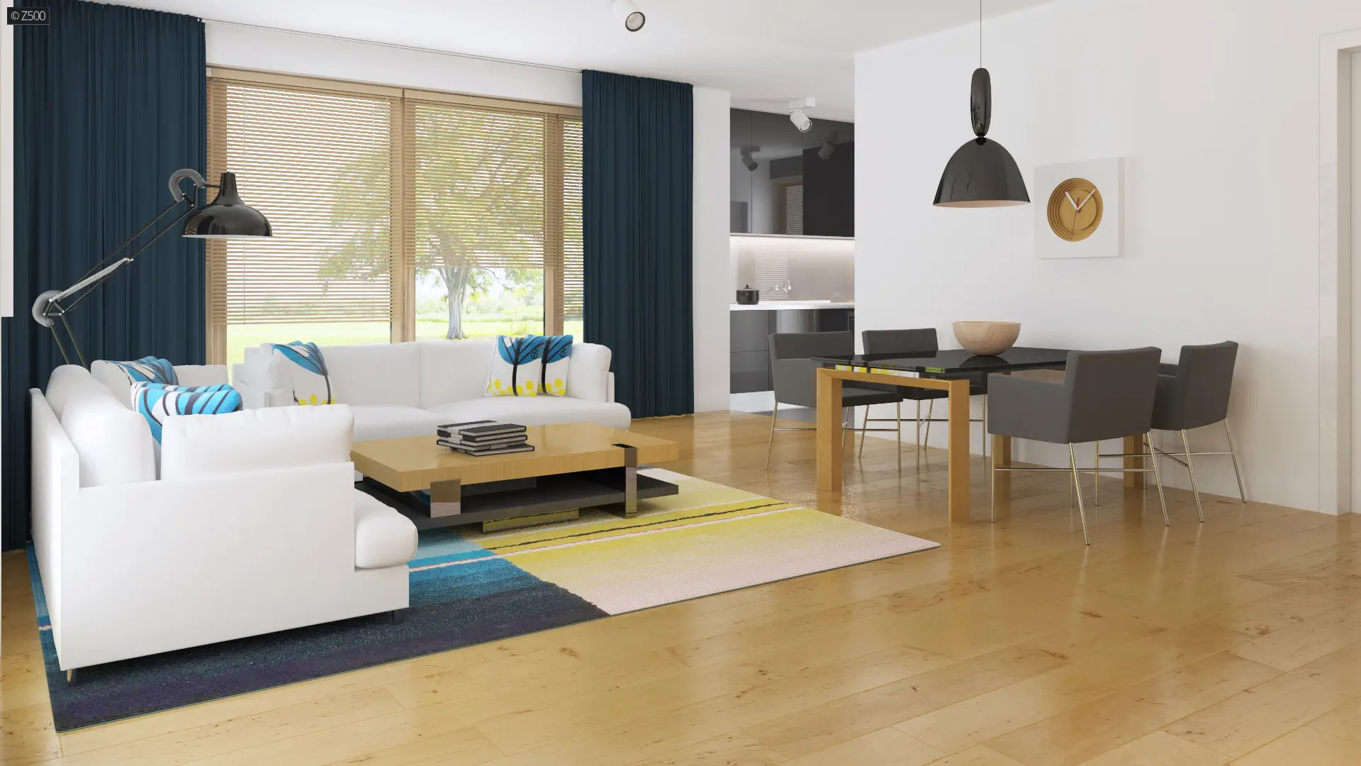 Nowoczesny dom z dużym, jasnym salonem i garażem jednostanowiskowym.