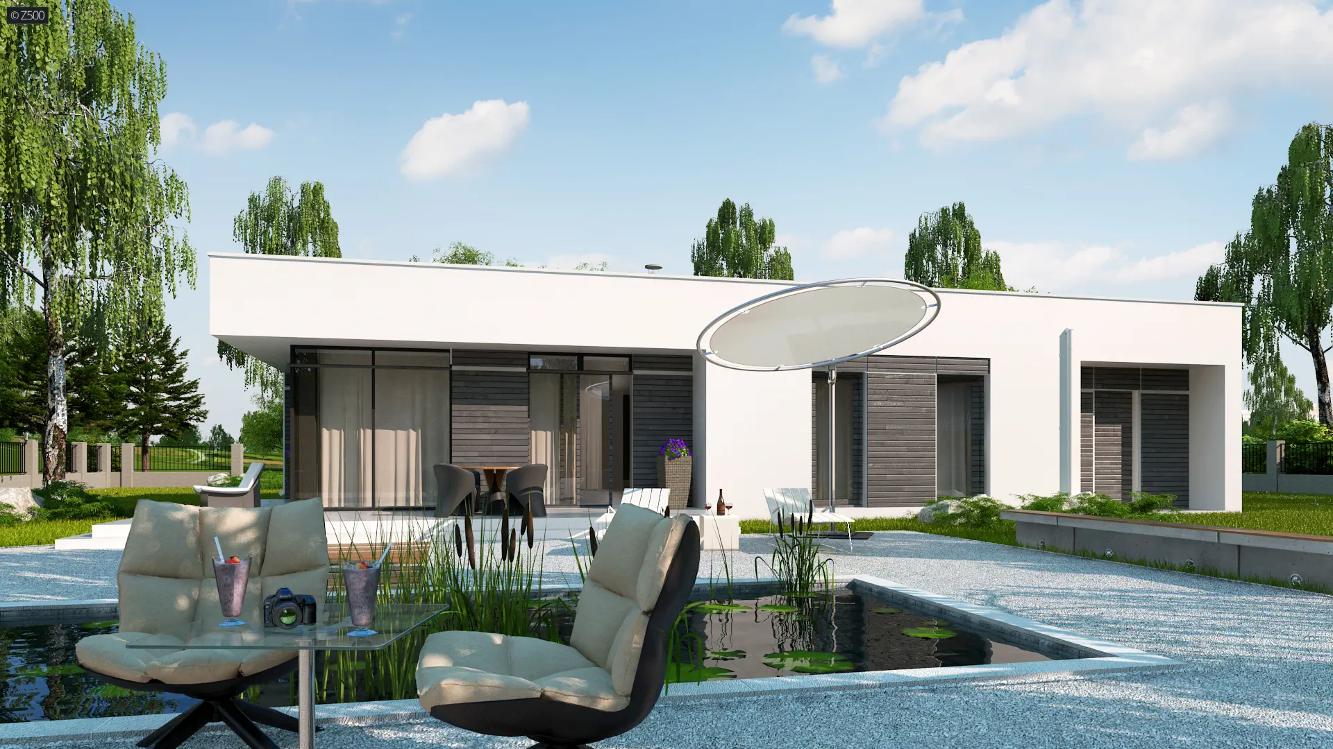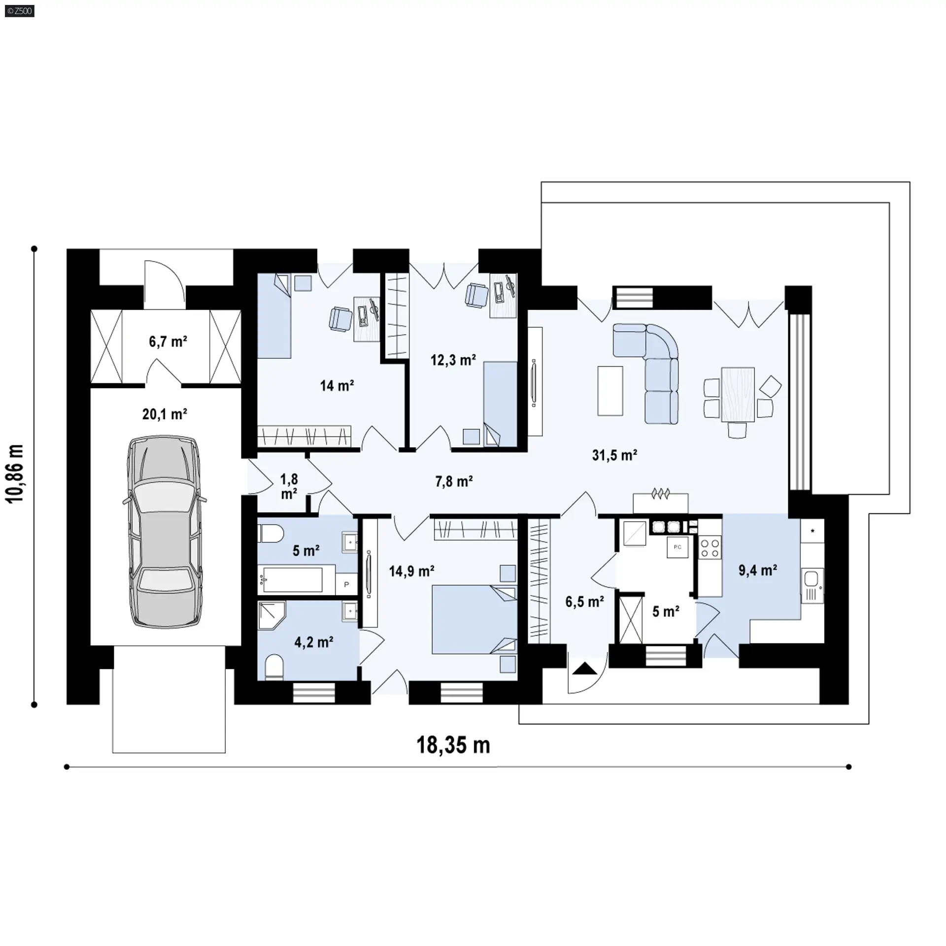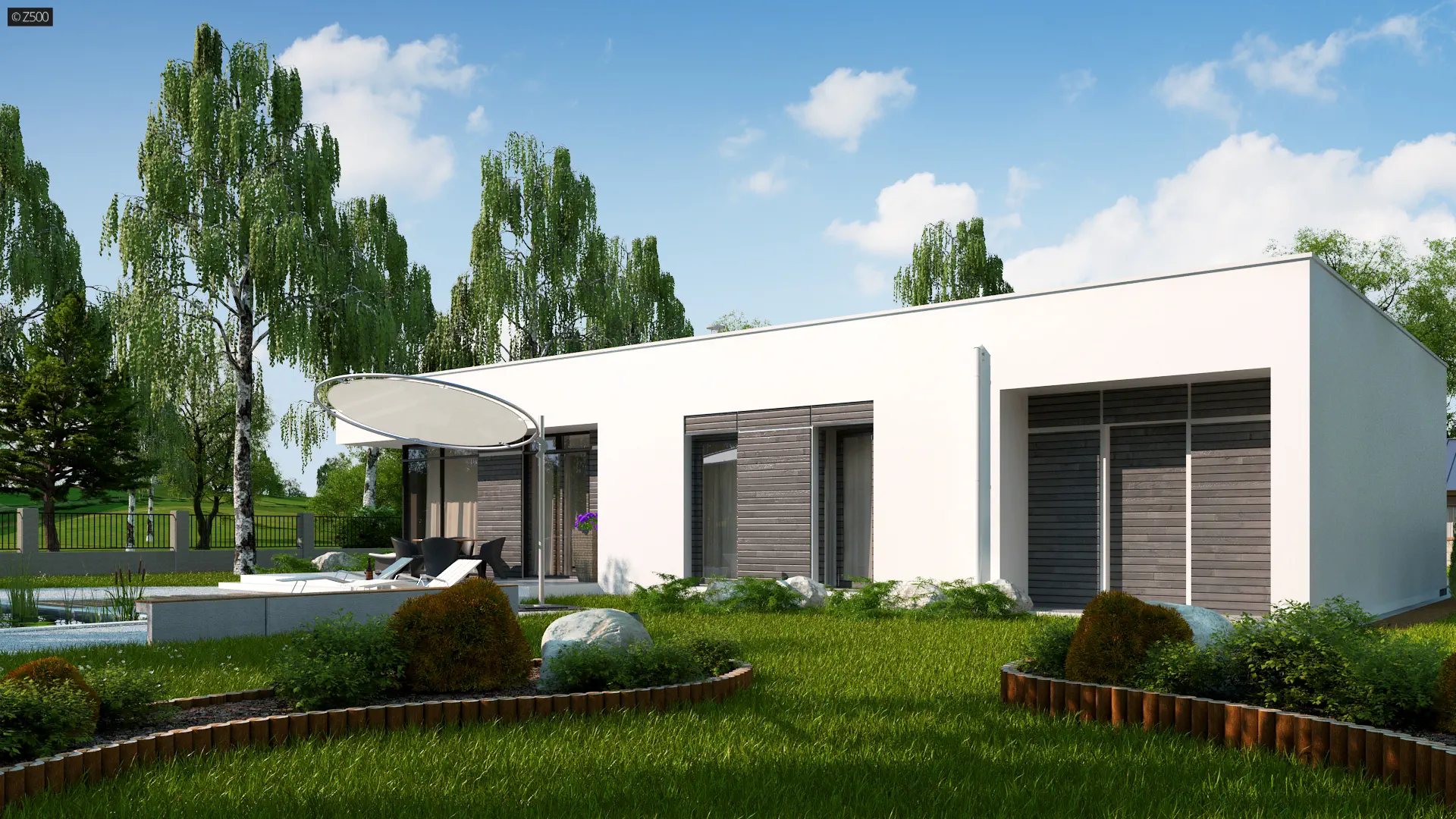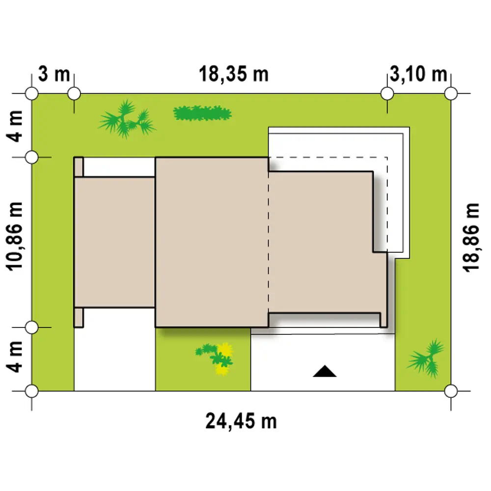 Projekt domu Zx35 GL to nowoczesny dom z dużym, jasnym salonem i garażem jednostanowiskowym.. W układzie przewidziano 3 sypialnie, 2 łazienki, salon 31,45 m², garaż jednostanowiskowy. Minimalna działka: 25,35 m × 18,86 m.