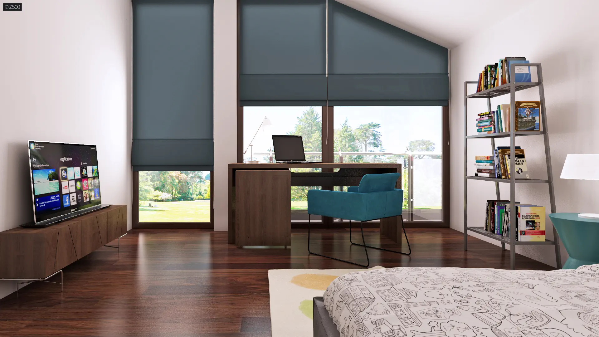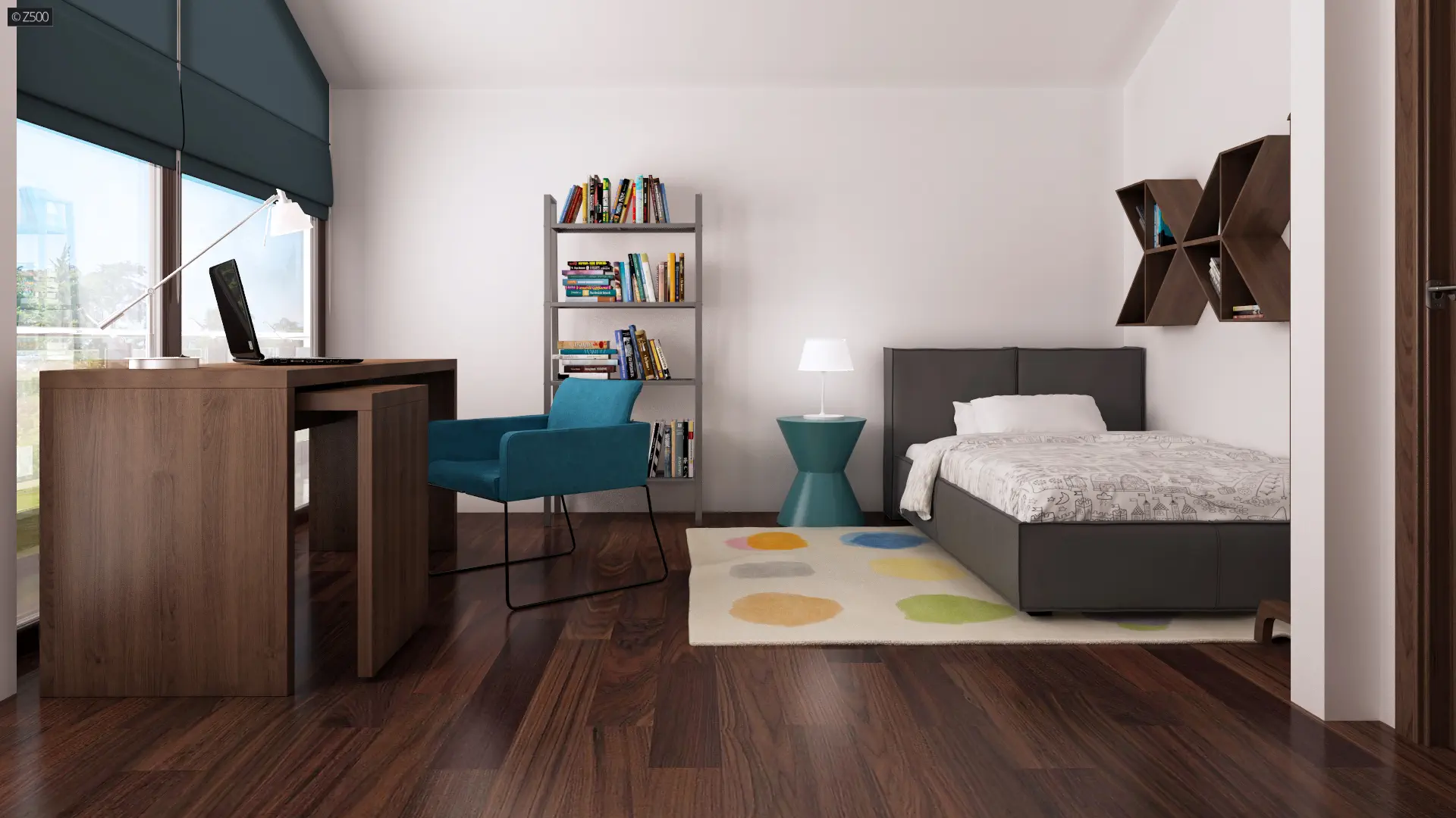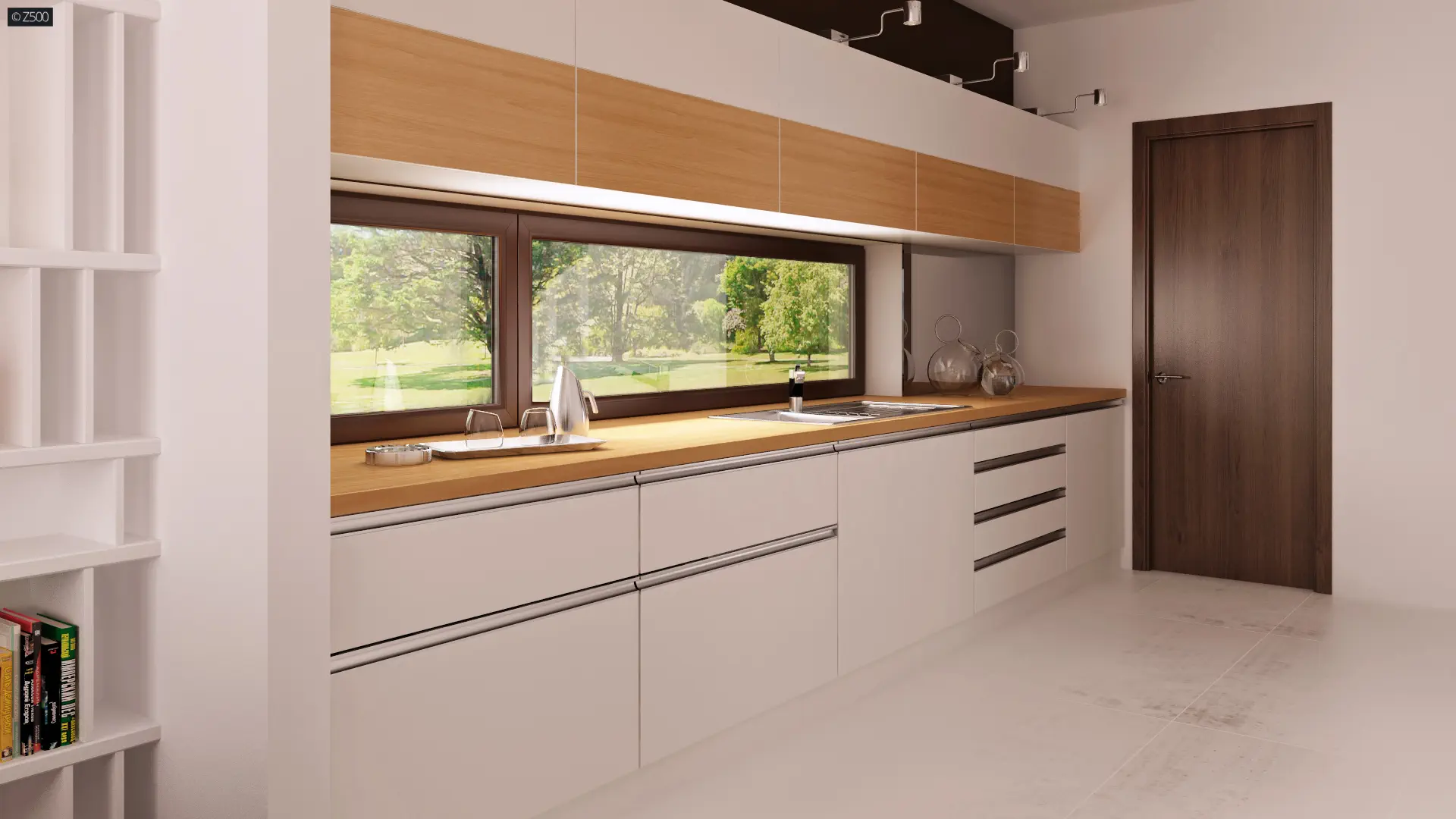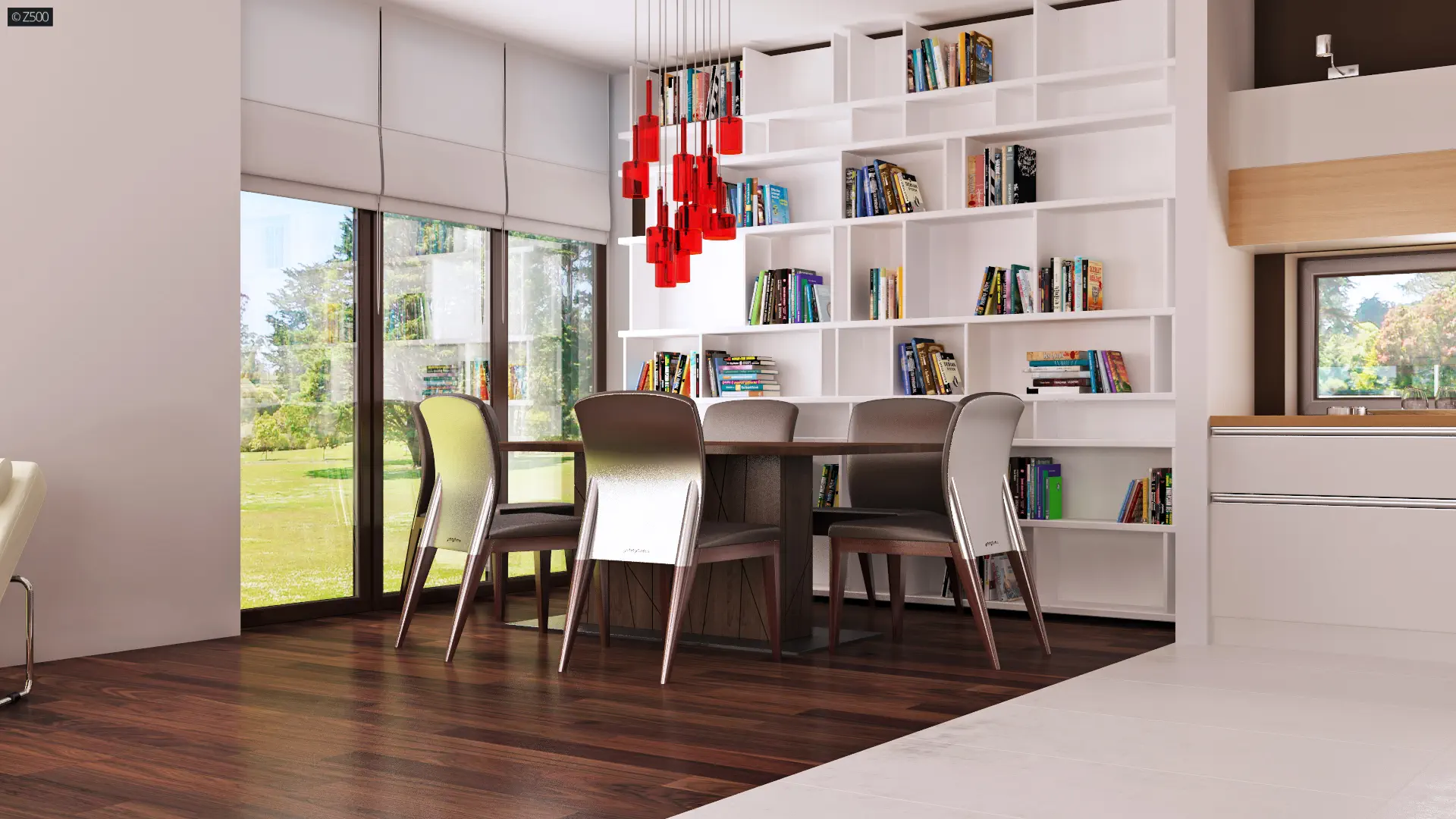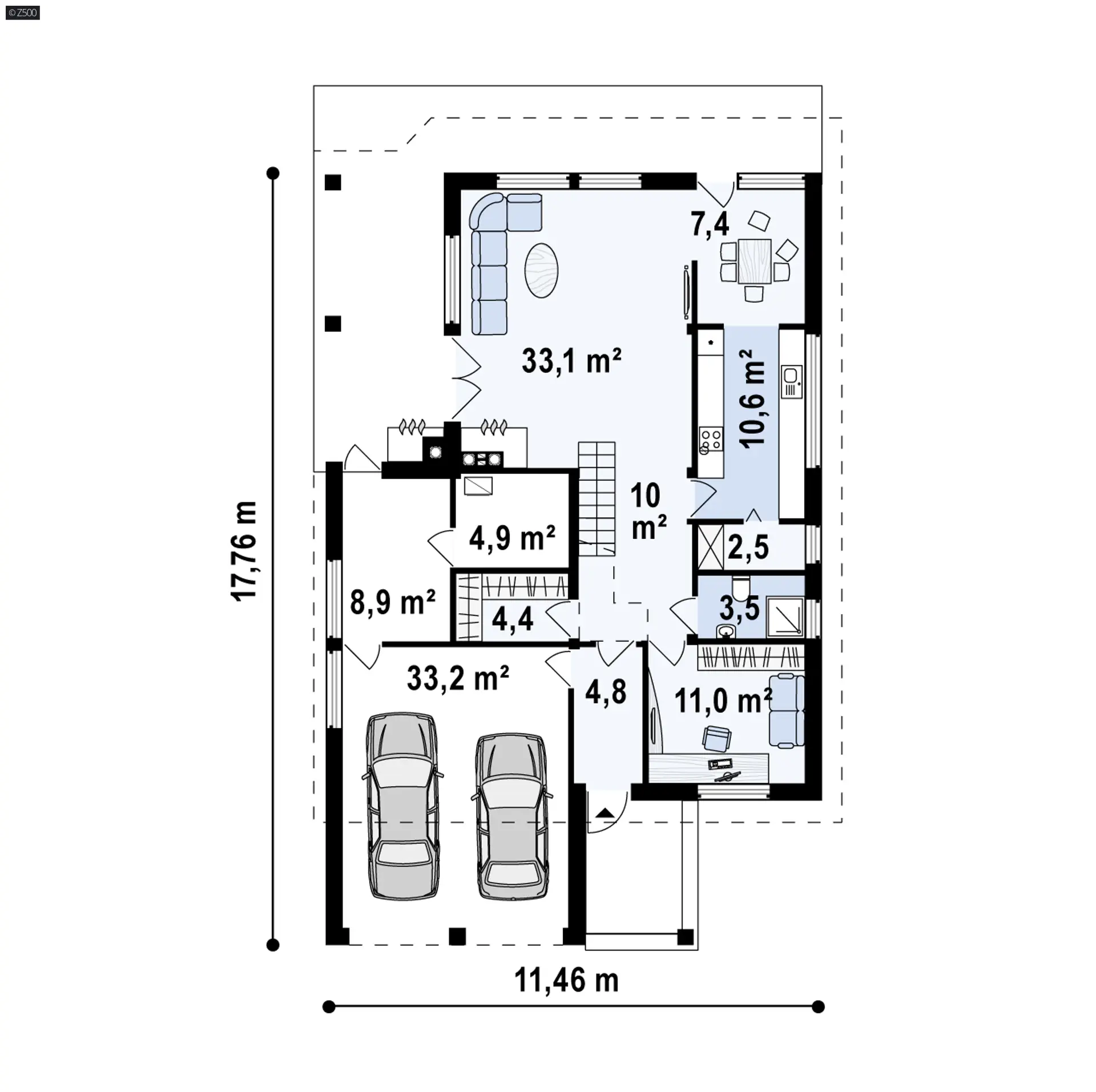 Centralny hol który stanowi ciąg komunikacyjny parteru dzieli go jednocześnie na strefy użytkowe. Obszerna przestrzeń dzienna - salon z kuchnią i jadalnią otwarte są na ogród. Kolejnymi zaletami projektu Zx50 są liczne zakamarki, miejsca na szafy i schowki. Garaż połączony z budynkiem ułatwia dostęp do strefy gospodarczej domu.