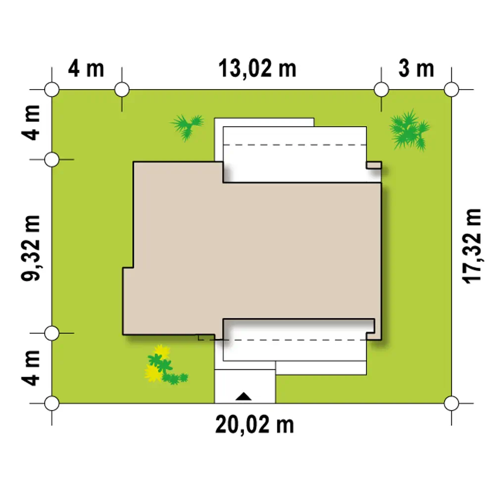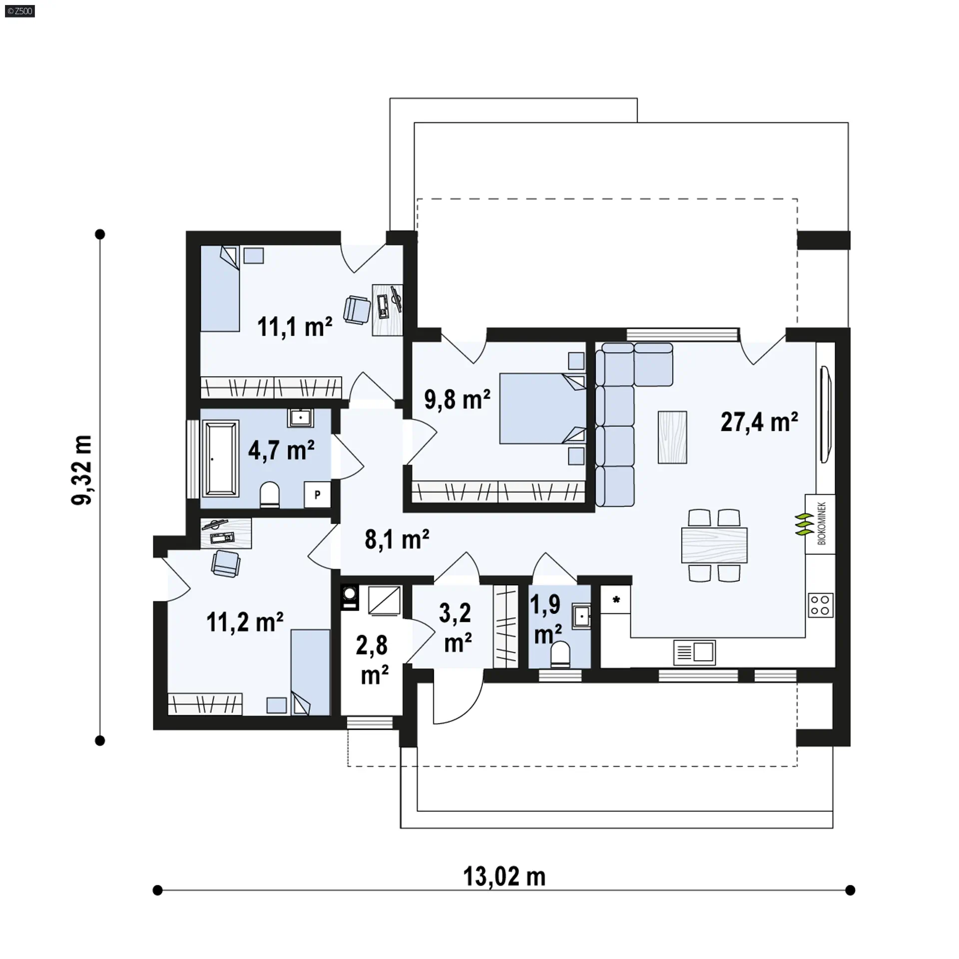 Dom został podzielony na dwie strefy: dzienną oraz nocną. W strefie dziennej, czyli z prawej strony znajduje się salon łączony z kuchnią, z którego można się dostać bezpośrednio na taras oraz WC. W strefie nocnej, czyli z lewej strony umiejscowione zostały trzy pokoje, pomieszczenie gospodarcze oraz łazienka. Z dwóch pokoi również można się dostać bezpośrednio na taras.