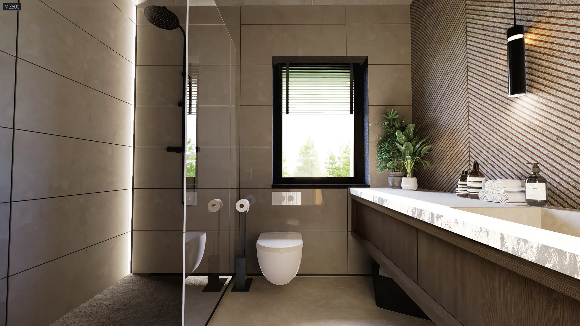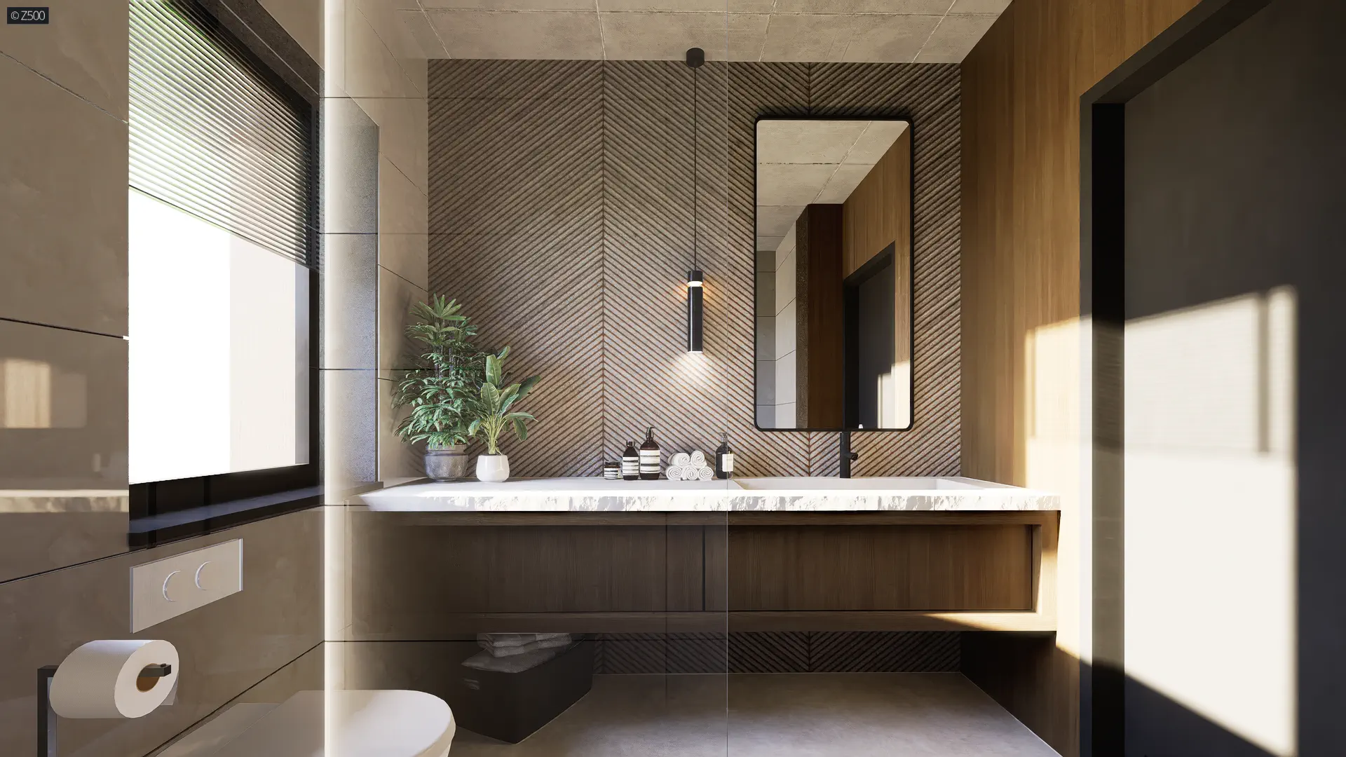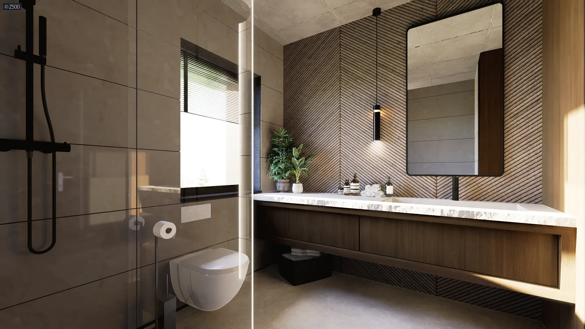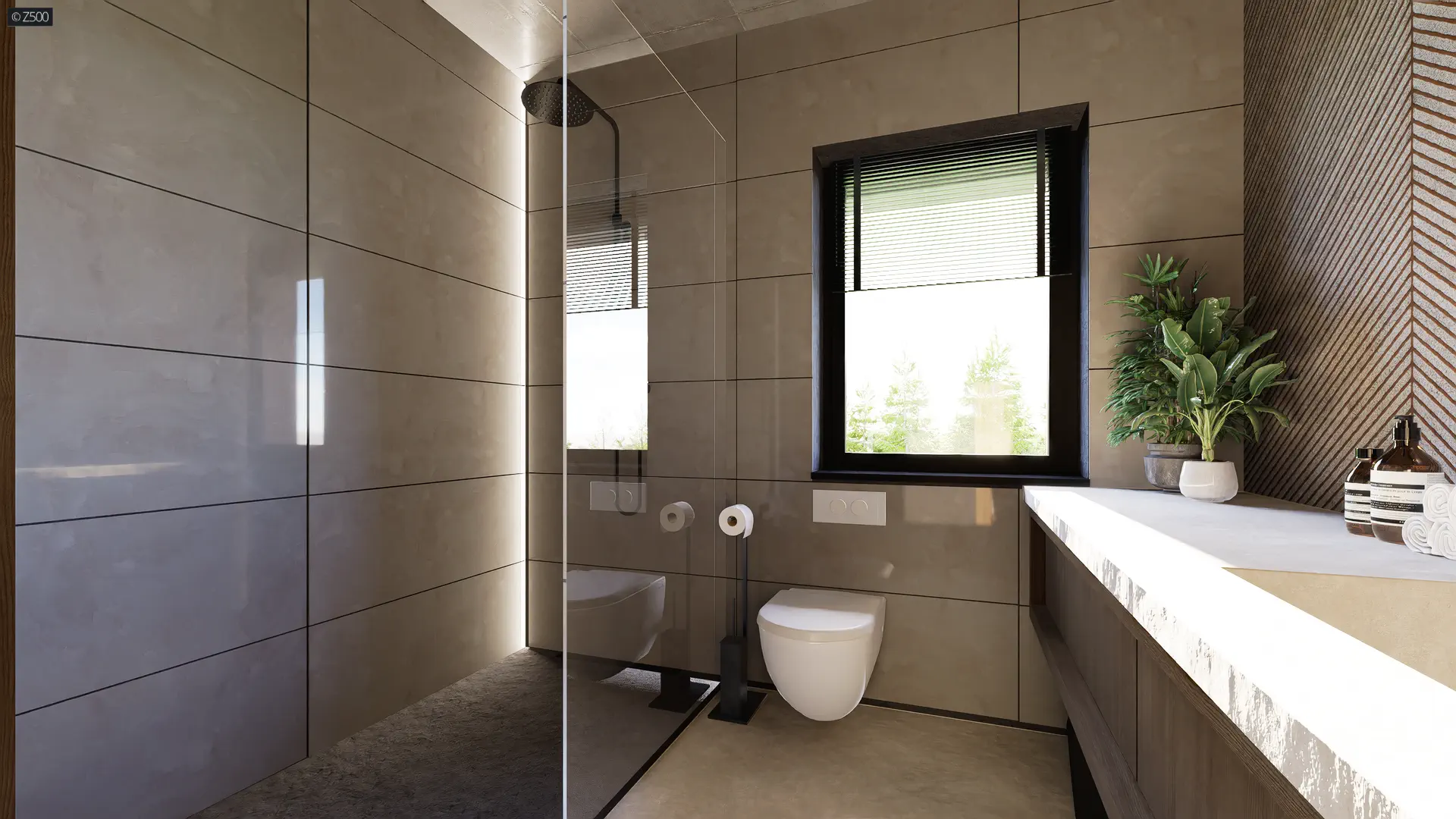Na górze natomiast mieści się część nocna z pokojami mieszkańców oraz dwiema łazienkami. Osobne pomieszczenie, zaprojektowane z myślą o garderobie, mogące stać się również „kącikiem majsterkowicza”, stanowi dodatkowy atut. Na piętrze, którego pełną wysokość stanowią 265cm (bez skosów!), znajdują się dwa dobrze doświetlone pokoje z miejscami specjalnie przeznaczonymi na szafy oraz sypialnią z osobną garderobą. Nad jednostanowiskowym garażem, znajduje się prywatne wyjście na taras, na którym możemy spędzać dużo wolnego czasu. Wspólna łazienka, doświetlona dwoma pełnowymiarowymi oknami pomieści komfortową wannę.