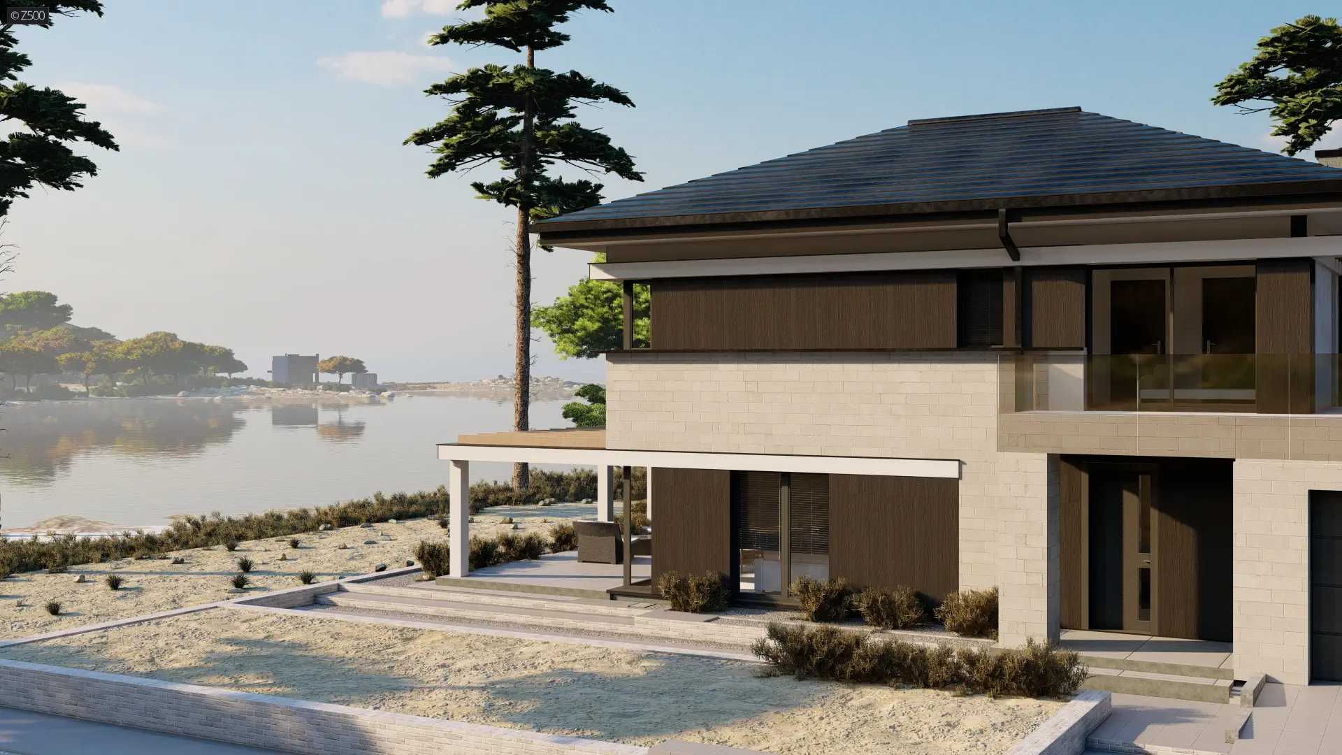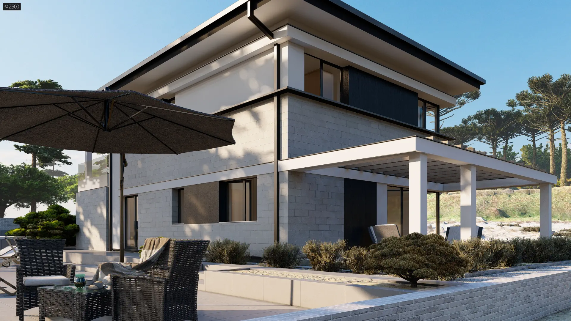 Nowoczesny dom piętrowy z dachem kopertowym i wjazdem od południa.