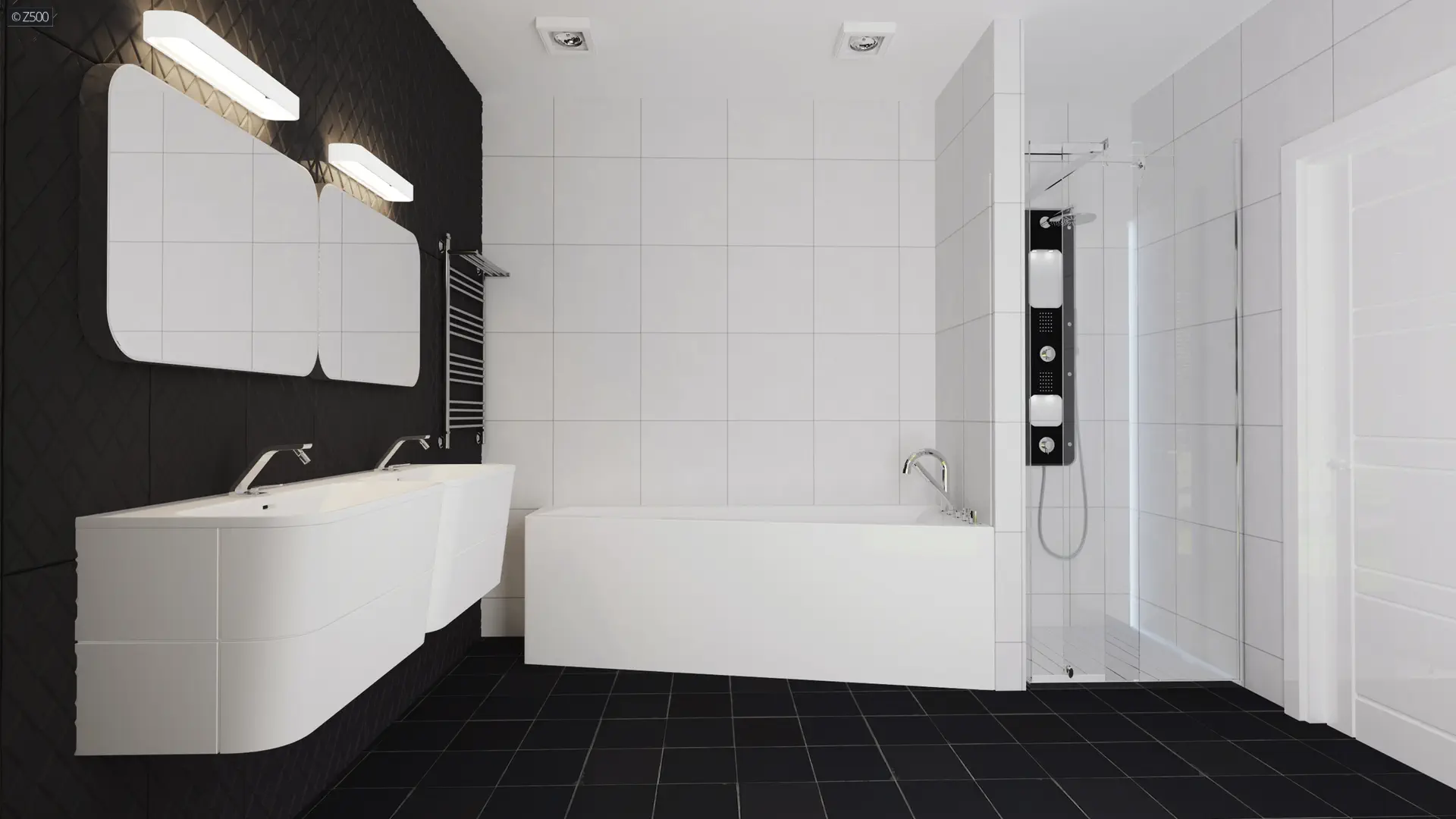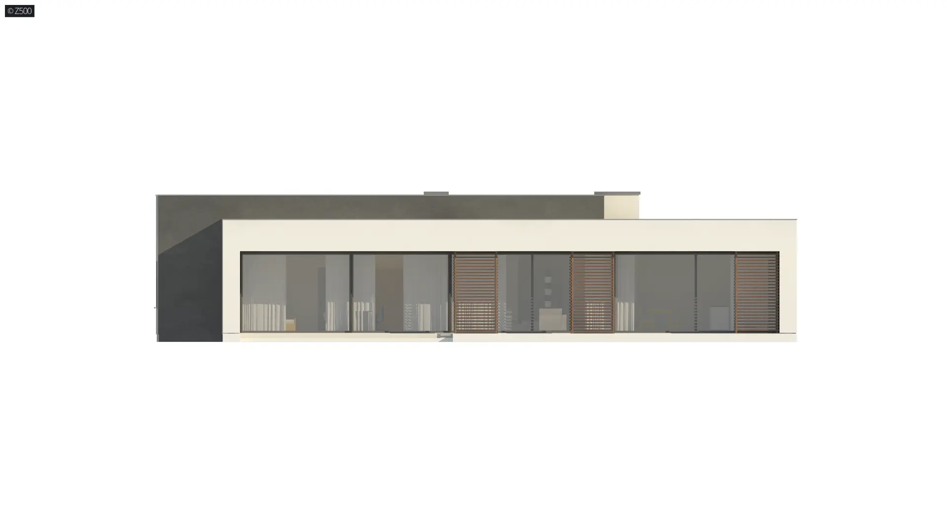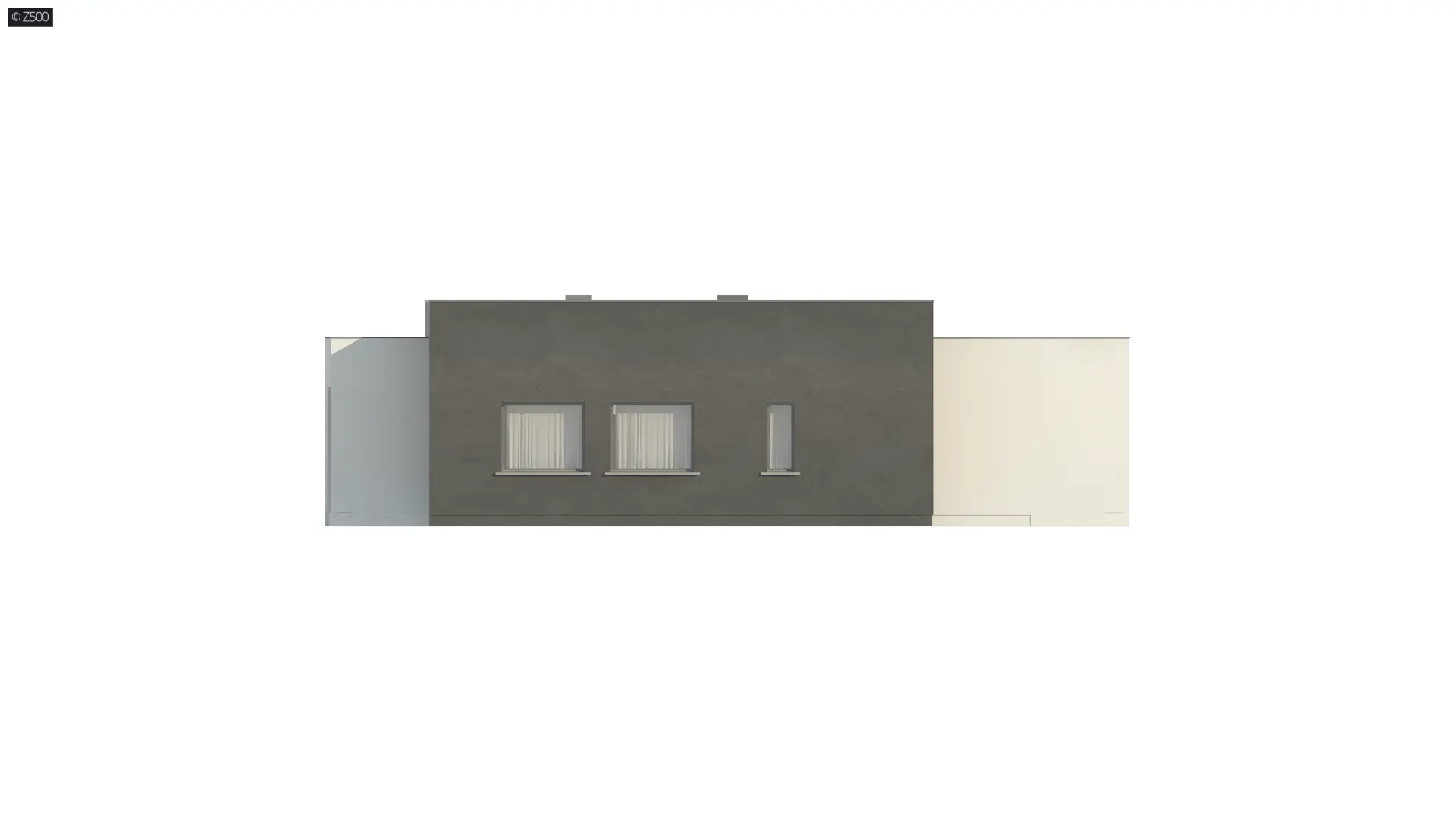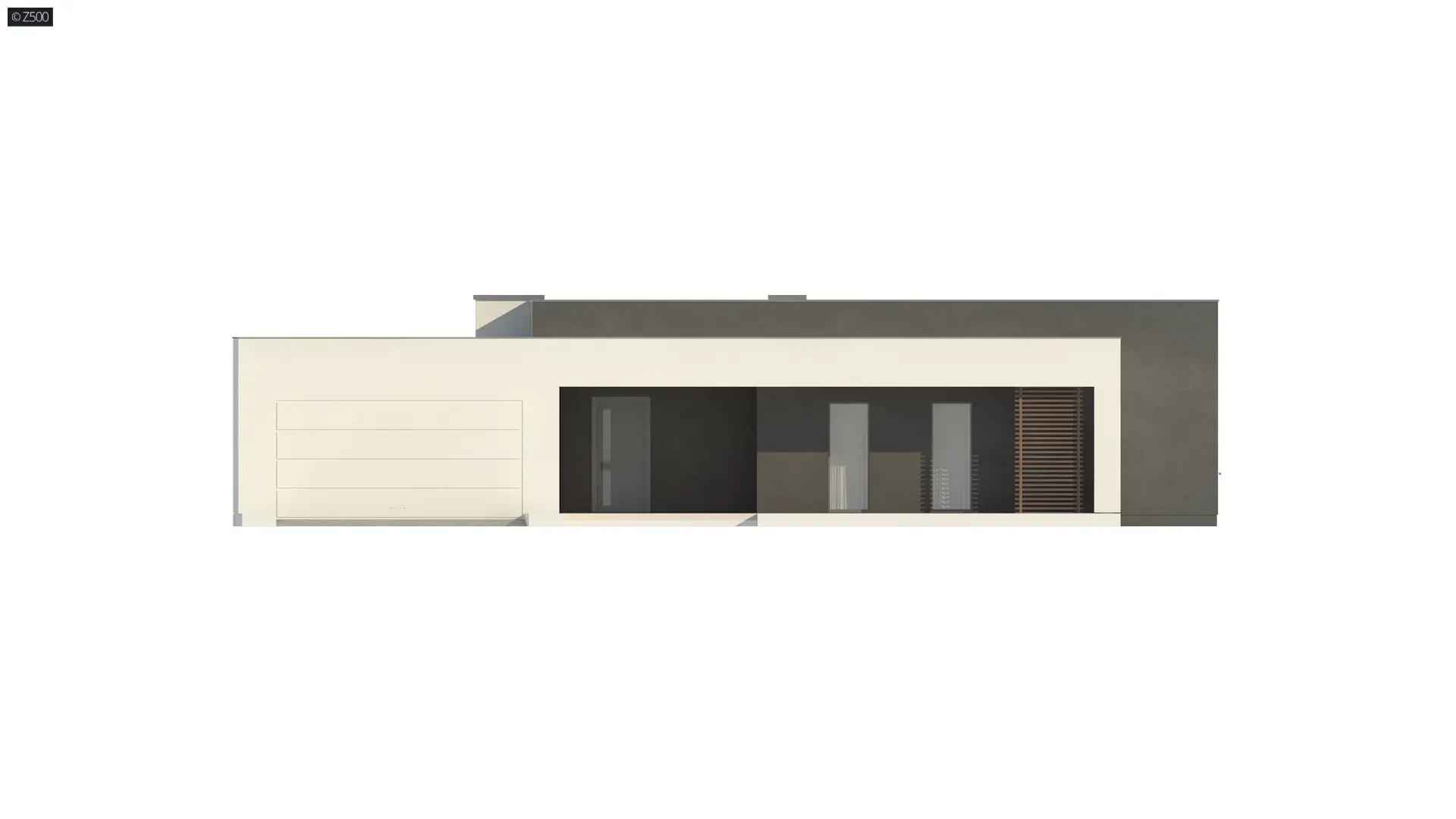 Zx72 – Nowoczesny, przestronny dom parterowy z dwustanowiskowym garażem o powierzchni niespełna 180 m2. Jego prosta bryła w postaci dwóch przenikających się sześcianów wyraźnie podkreślono czarnym i białym kolorem elewacji. Dodatkowo całą część ogrodową przeszklono w zagłębieniu tarasu, nadając jej nieszablonowego wyglądu.