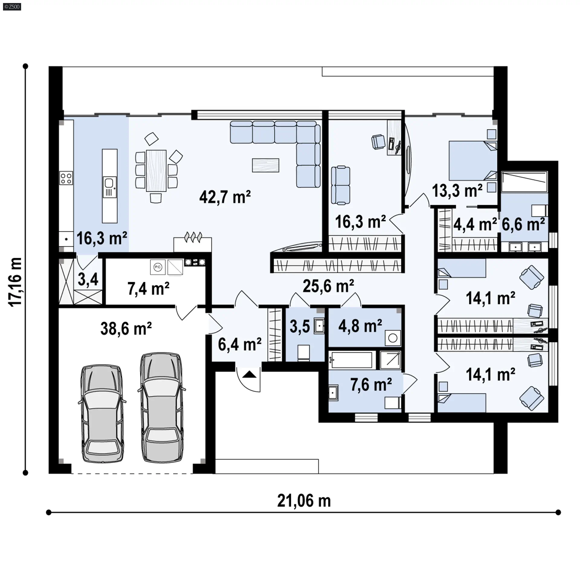 Nowoczesny dom parterowy z czterema sypialniami, dwustanowiskowym garażem