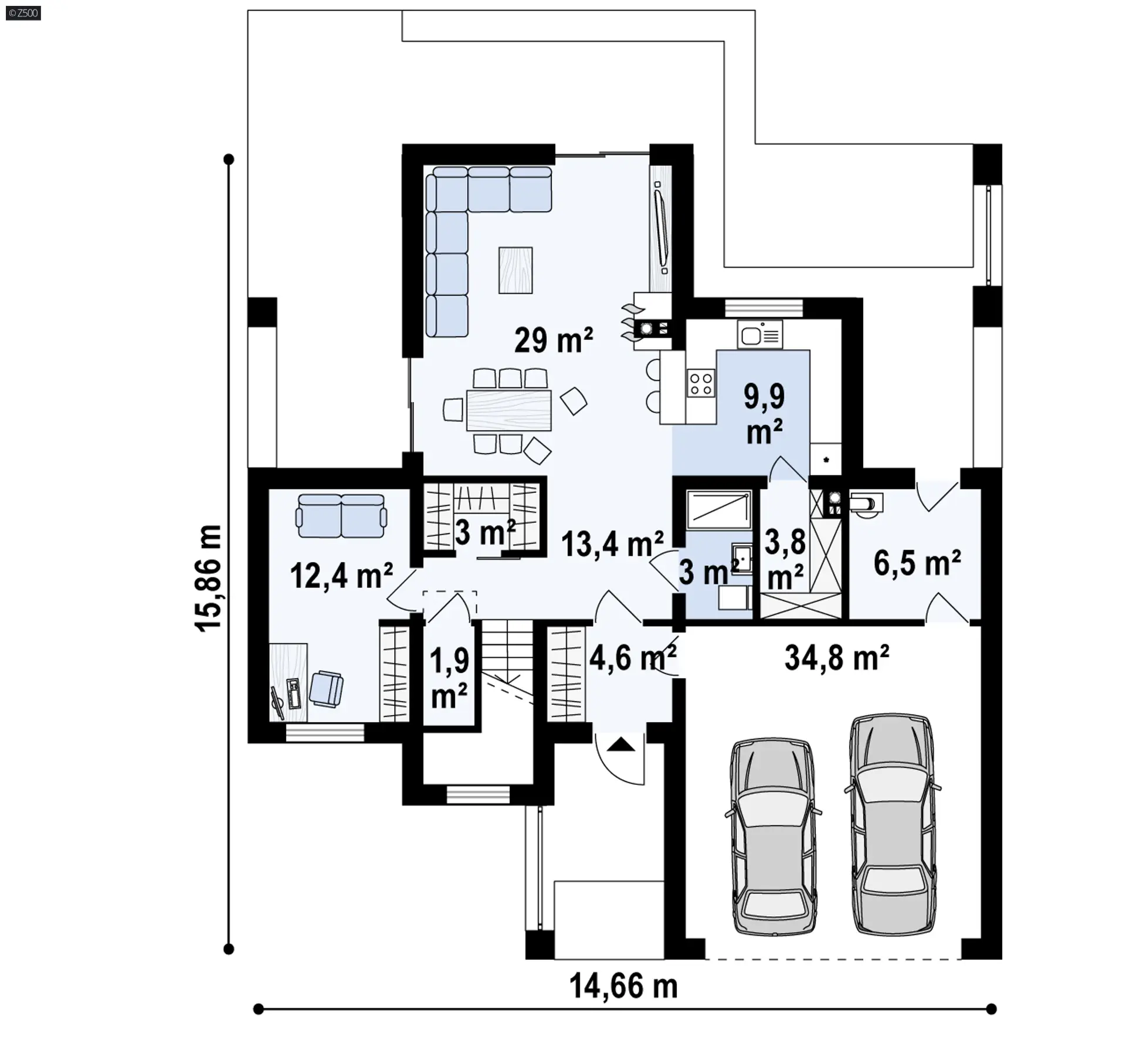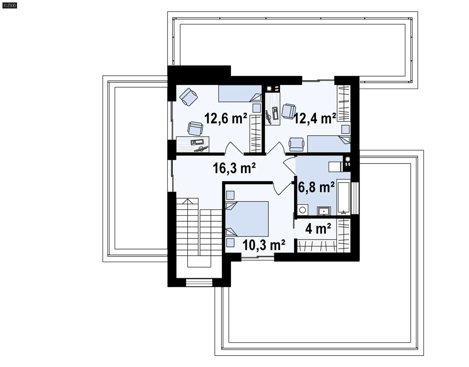 nowoczesny dom piętrowy z garażem 2-stanowiskowym oraz tarasami na piętrze.