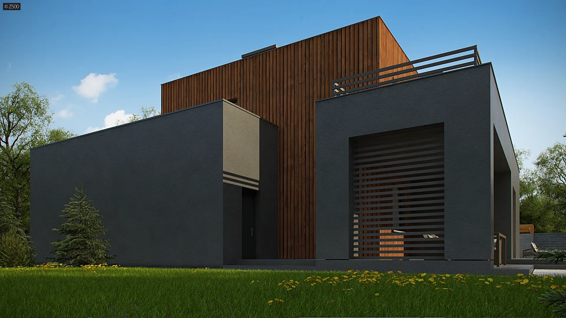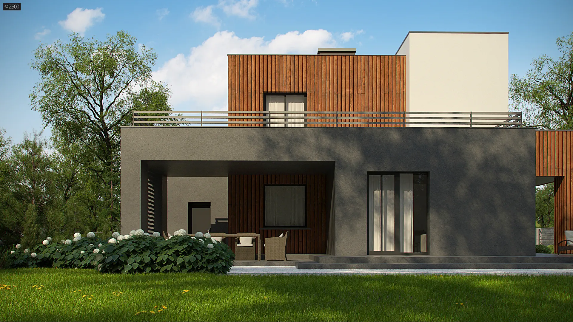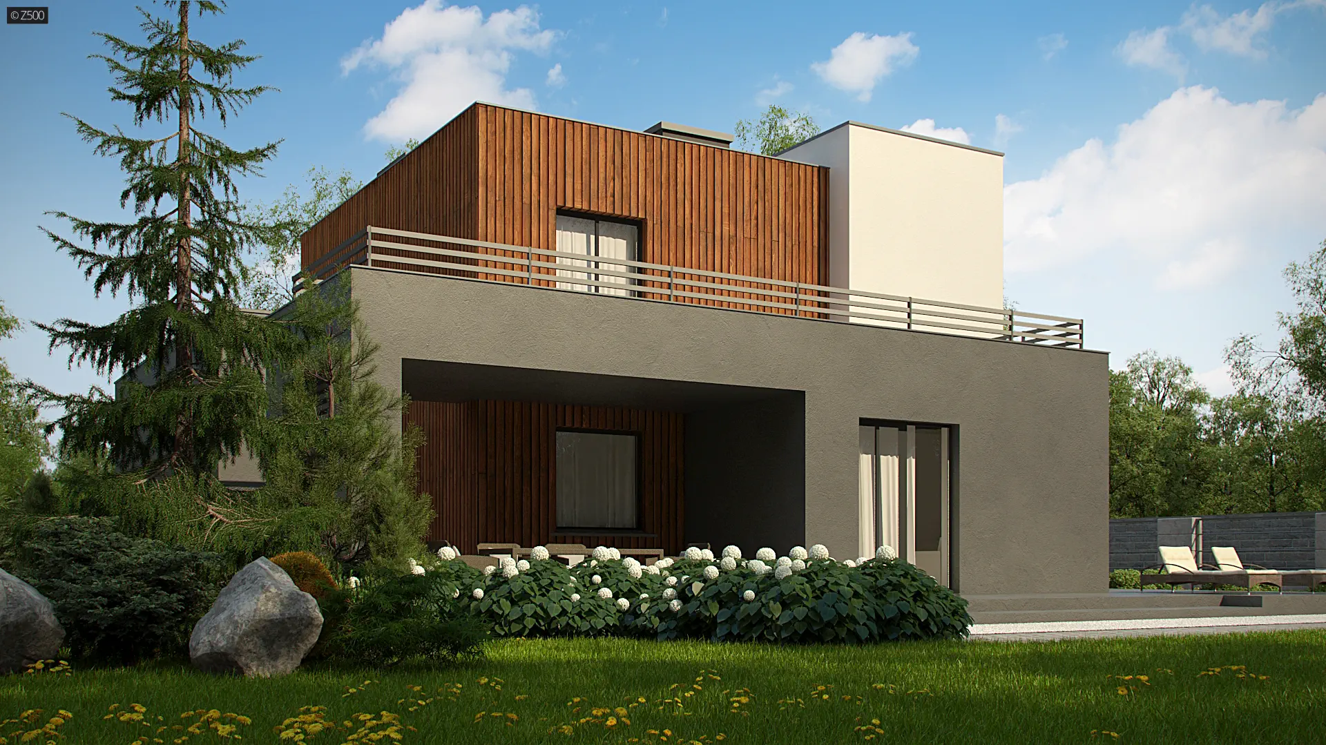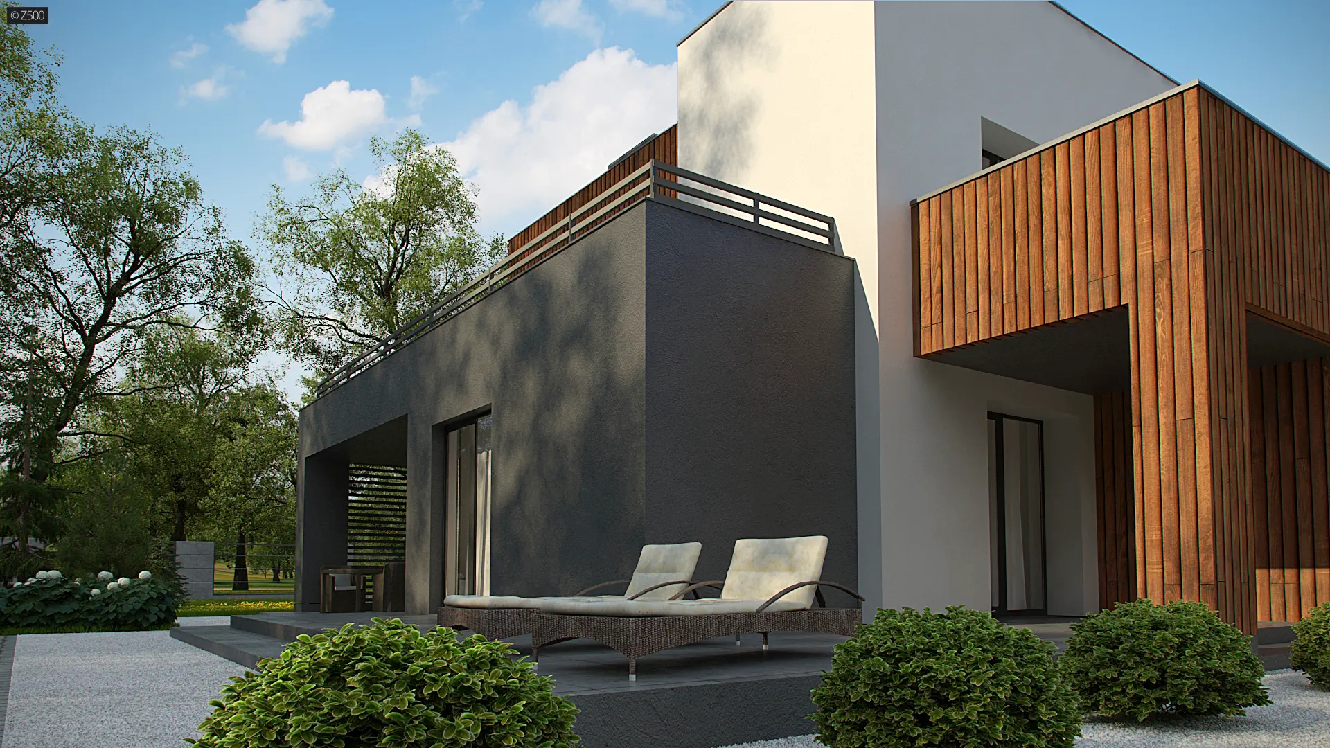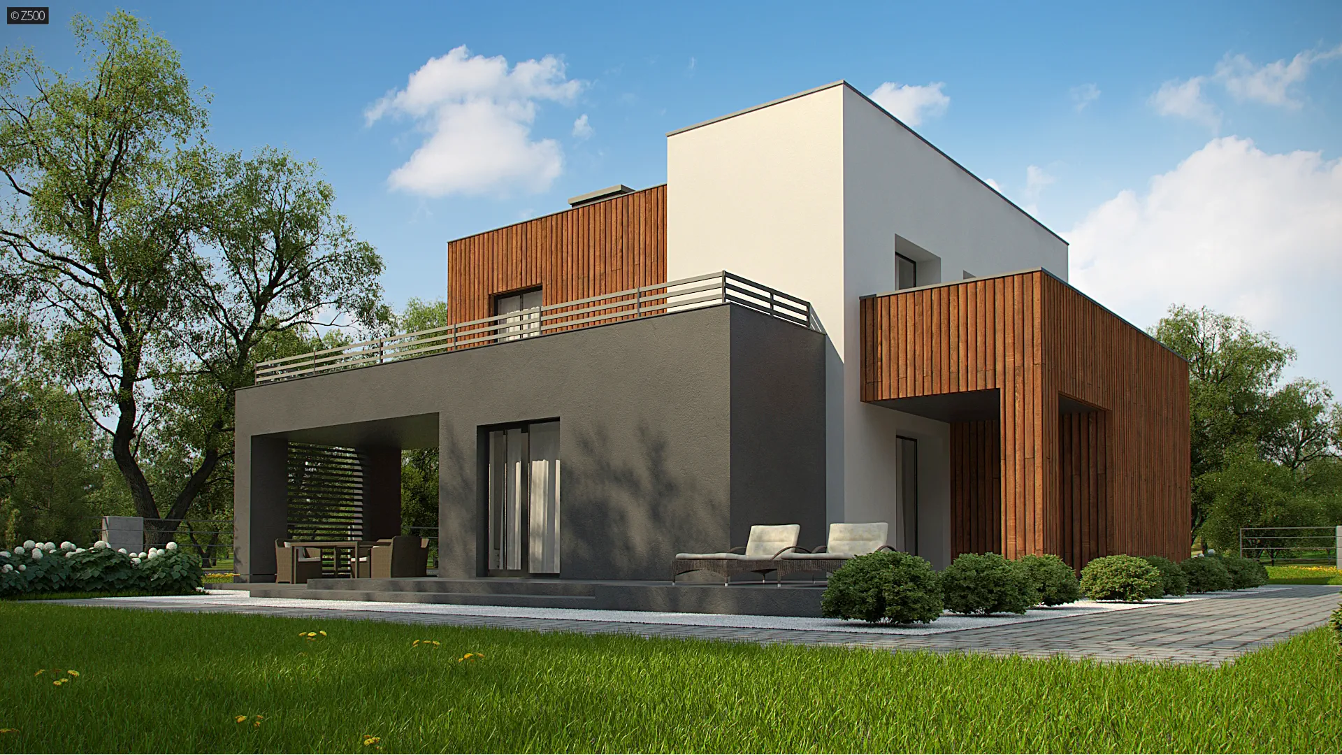 Dwukondygnacyjny, nowoczesny dom o powierzchni ok. 140m.2 z płaskim dachem i dwustanowiskowym garażem. Subtelna kolorystyka beży, brązów i geometria przenikających się sześcianów o różnych wysokościach, znakomicie licuje z drewnianymi elementami elewacji, nadając jej wrażenia neutralności i dobrego smaku.