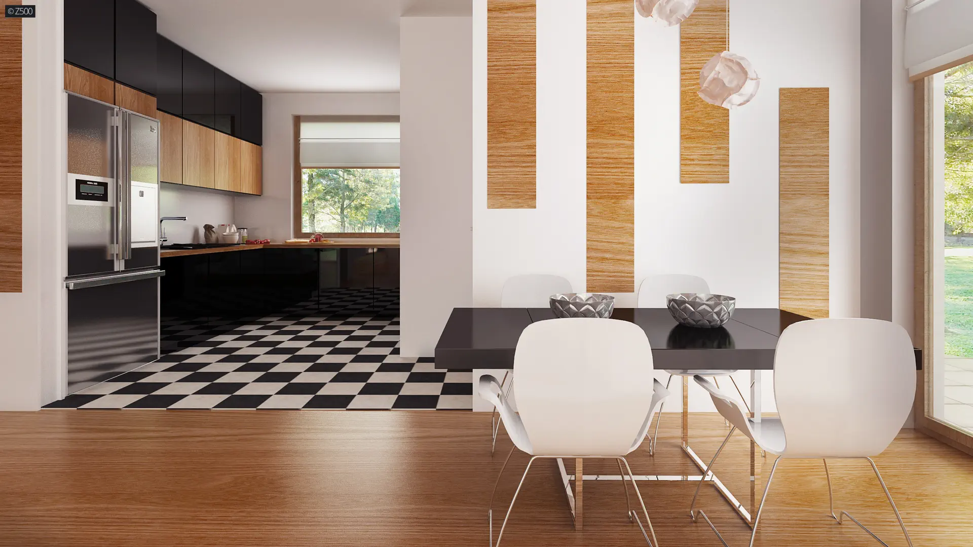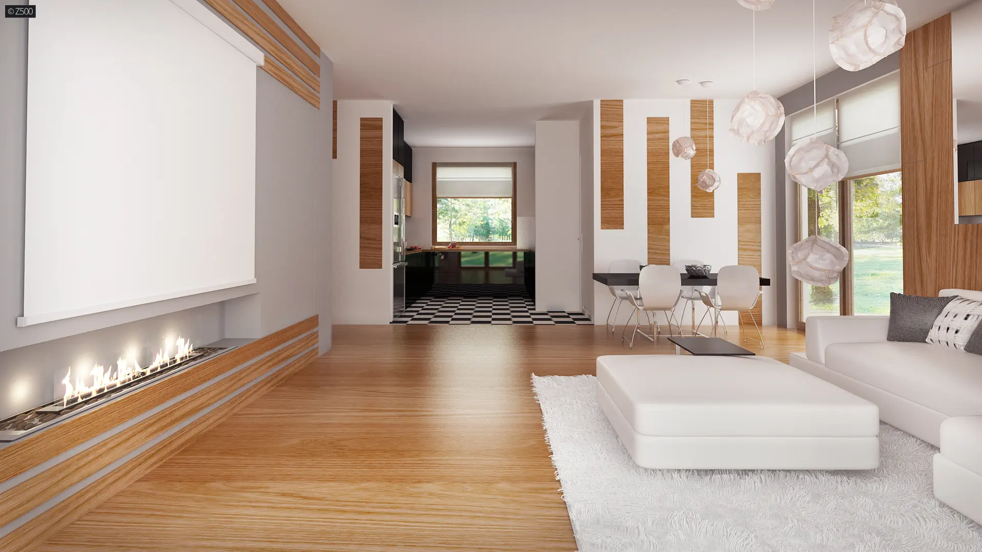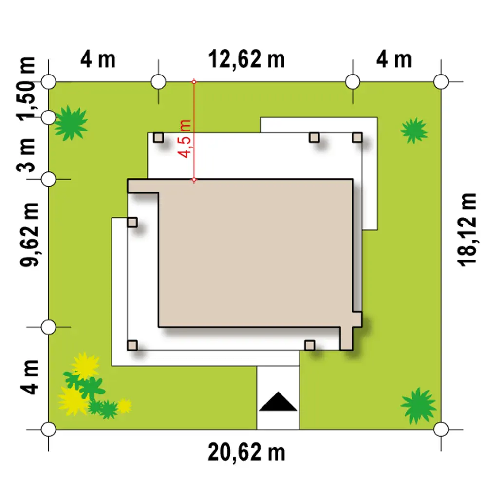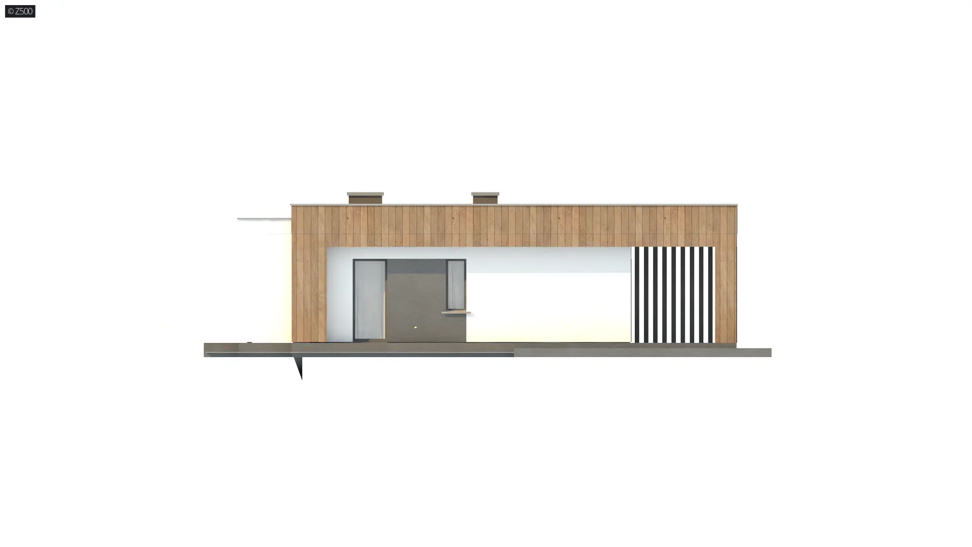 Zx76 D to parterowy budynek z płaskim dachem bez garażu. Posiada duże przeszklenia i zadaszenia nad częścią wejściową i ogrodową.